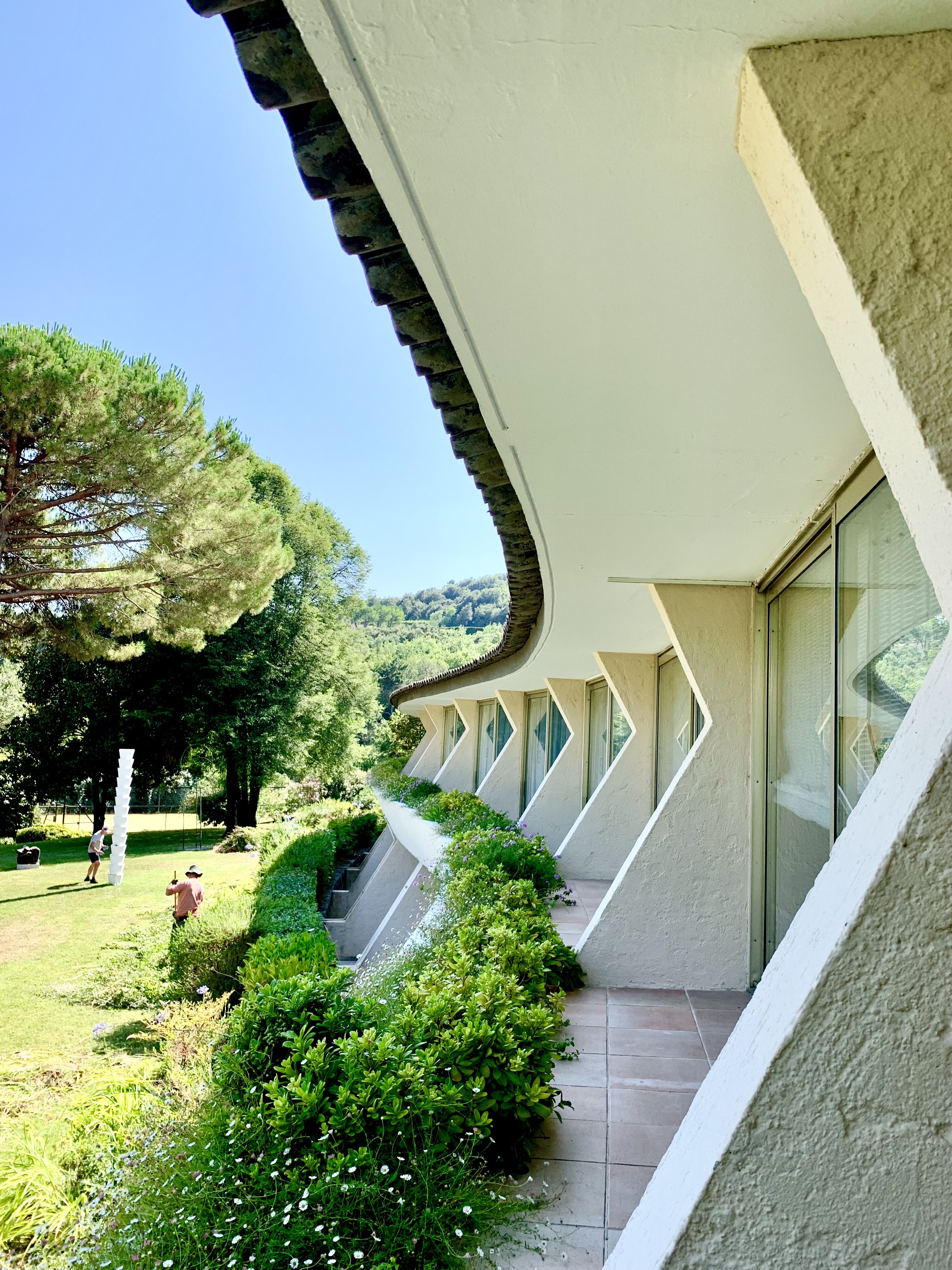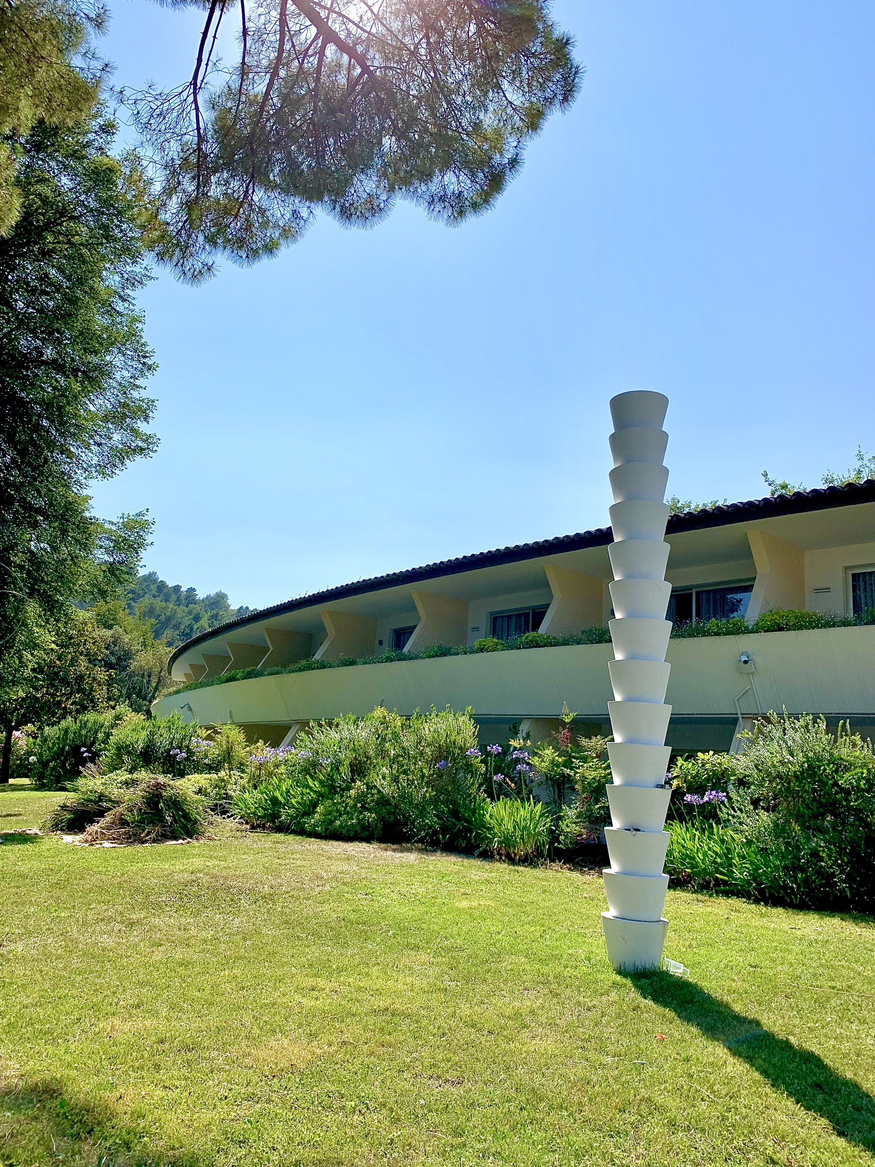 Architecture, Art, Gastronomie et Nature, voilà comment l’on pourrait décrire d’une parfaite adéquation et en quelques mots, La Vague de Saint-Paul. Située au détour d’une petite route ombragée, si proche et si loin de la bouillonnante Côte, en plein coeur de la forêt Saint-Pauloise, presque cachée et mystérieuse, la Vague de Saint-Paul se révèle à peine de sa forme envoûtante et atypique. Une virgule provençale en pleine nature, une véritable vague d’architecture signée André Minangoy (architecte plébiscité ou décrié pour ses oeuvres emblématiques d’une époque, qui marqua fortement la région avec notamment le complexe immobilier Marina Baie des Anges de Villeneuve Loubet, les pyramidaux bâtiments ondulés évoquant le sillon et l’écume des vagues blanches de la Méditerranée ou encore le Vista Palace, fascinant hôtel à peine accroché à la roche et suspendu dans le vide au dessus de Roquebrune Cap-Martin).