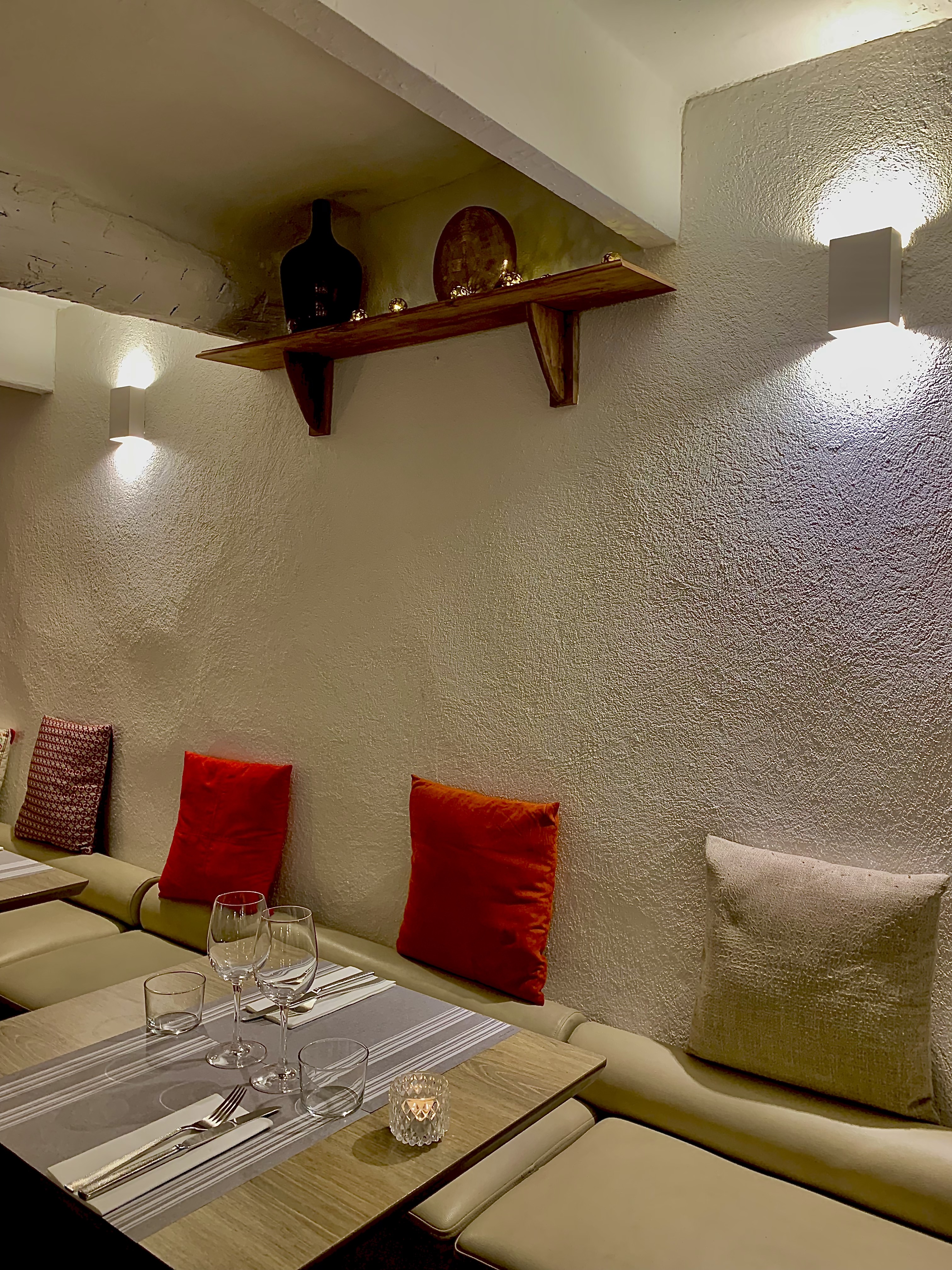 Dès les beaux jours, la terrasse vibre de vie et de convivialité et permet de s’imprégner en idéal du Vieux-Nice. La salle en mezzanine, cosy et claire, est d’une allure rustique-chic et la blancheur des murs rappelle les souvenirs d’une gourmande adresse des Cyclades. La cuisine ouverte, au rez-de-chaussée, permet de voir en action le chef et sa sympathique « team » (Magalie, Seydi-Malik et Mamadou) qui vous saluera en toute amitié gourmande.