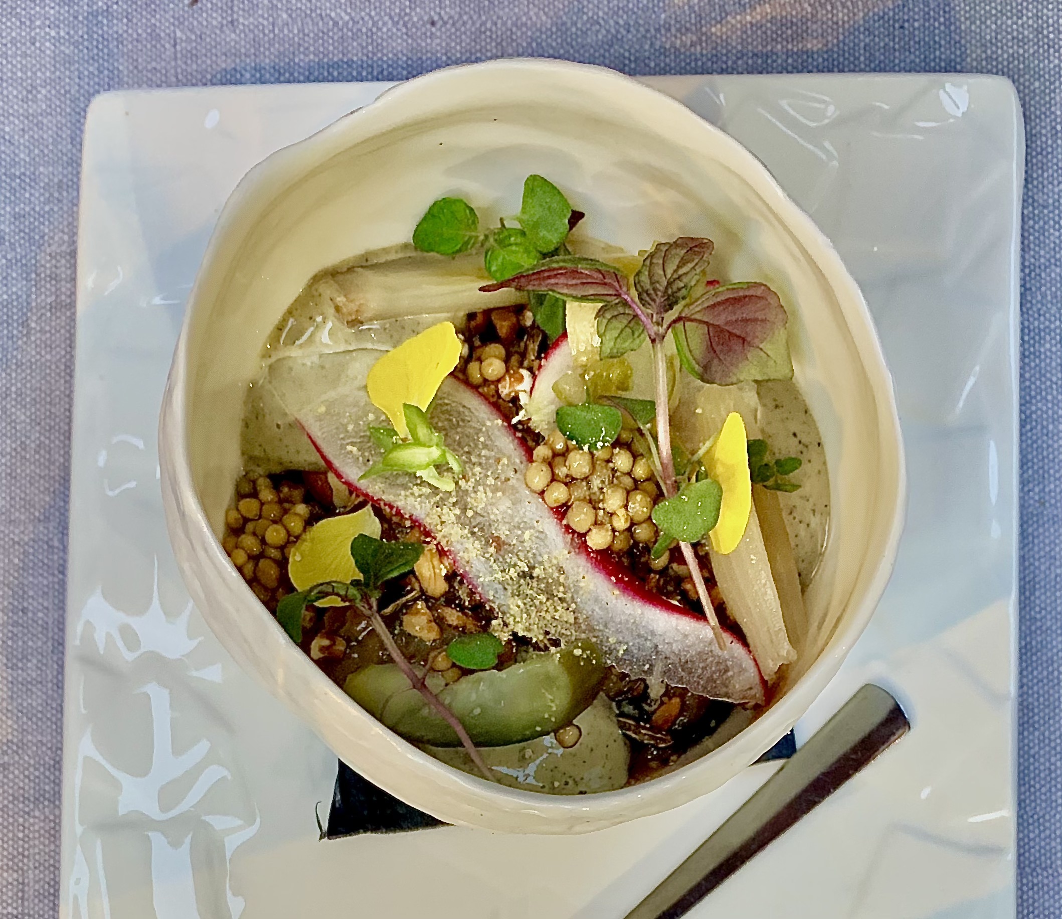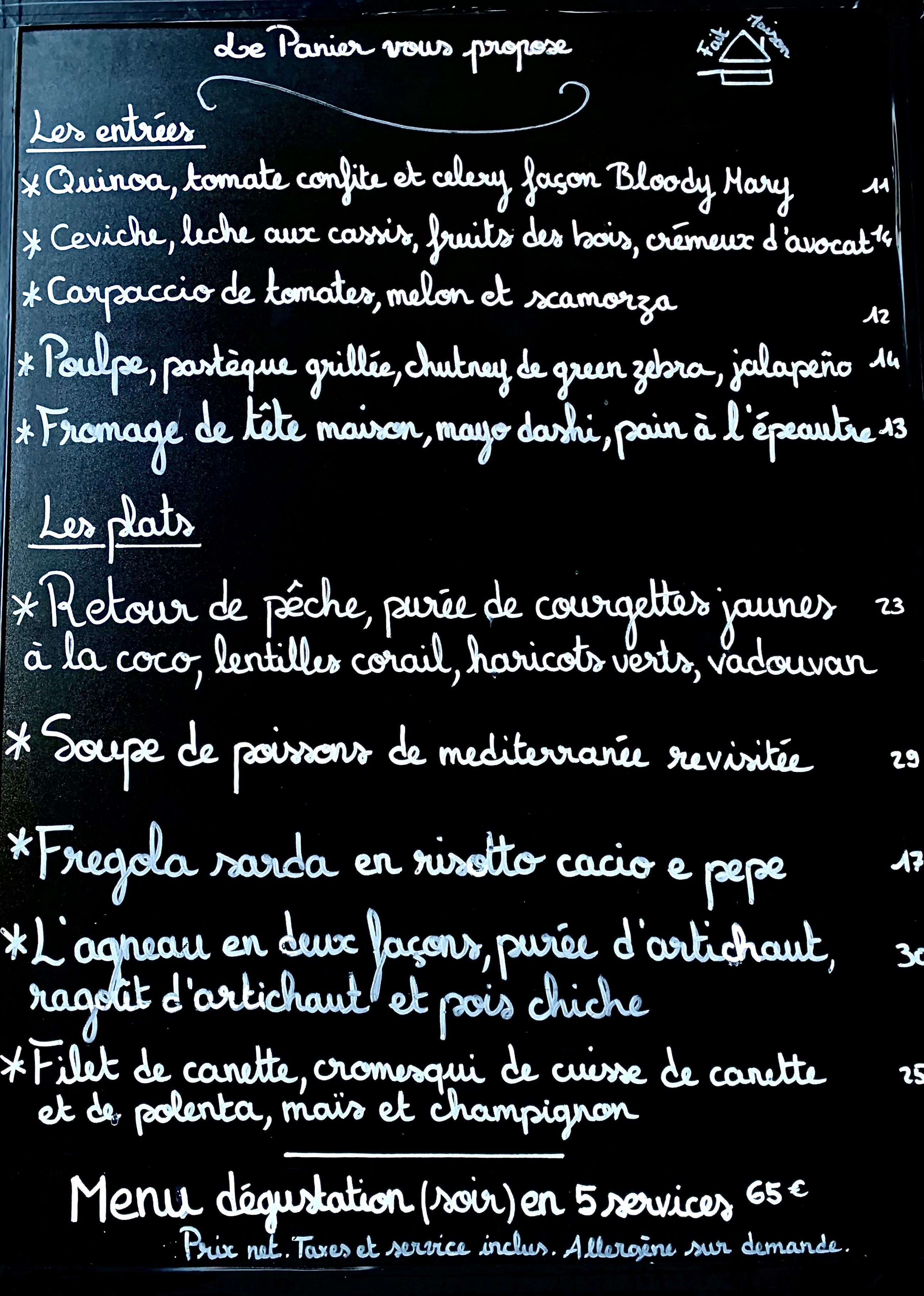 Malgré les difficultés d’une année complexe et inédite (entre confinement et fermeture, vente à emporter, réouverture partielle) et après quelques mois transitoires, à coup de force et de persévérance, sans jamais perdre espoir, le couple relève le défi de donner une nouvelle dynamique au Panier, qui trouve aujourd’hui sa pleine identité créative. Les légumes proviennent du marché ou de petits producteurs de la région, la pêche est bien évidemment locale et repectueuse, les épices ou les condiments sont achetés chez un commerçant du vieux Nice, à quelques pas du restaurant. L’ardoise, constituée de 5 entrées, 5 plats et 5 desserts, vit véritablement en fonction des saisons, des arrivages et de la bouillonnante inventivité du chef. Le nouveau menu dégustation en 5 services permet de découvrir, de comprendre et de déguster toute la sincérité et la virtuosité de sa cuisine qui raconte si bien son parcours.