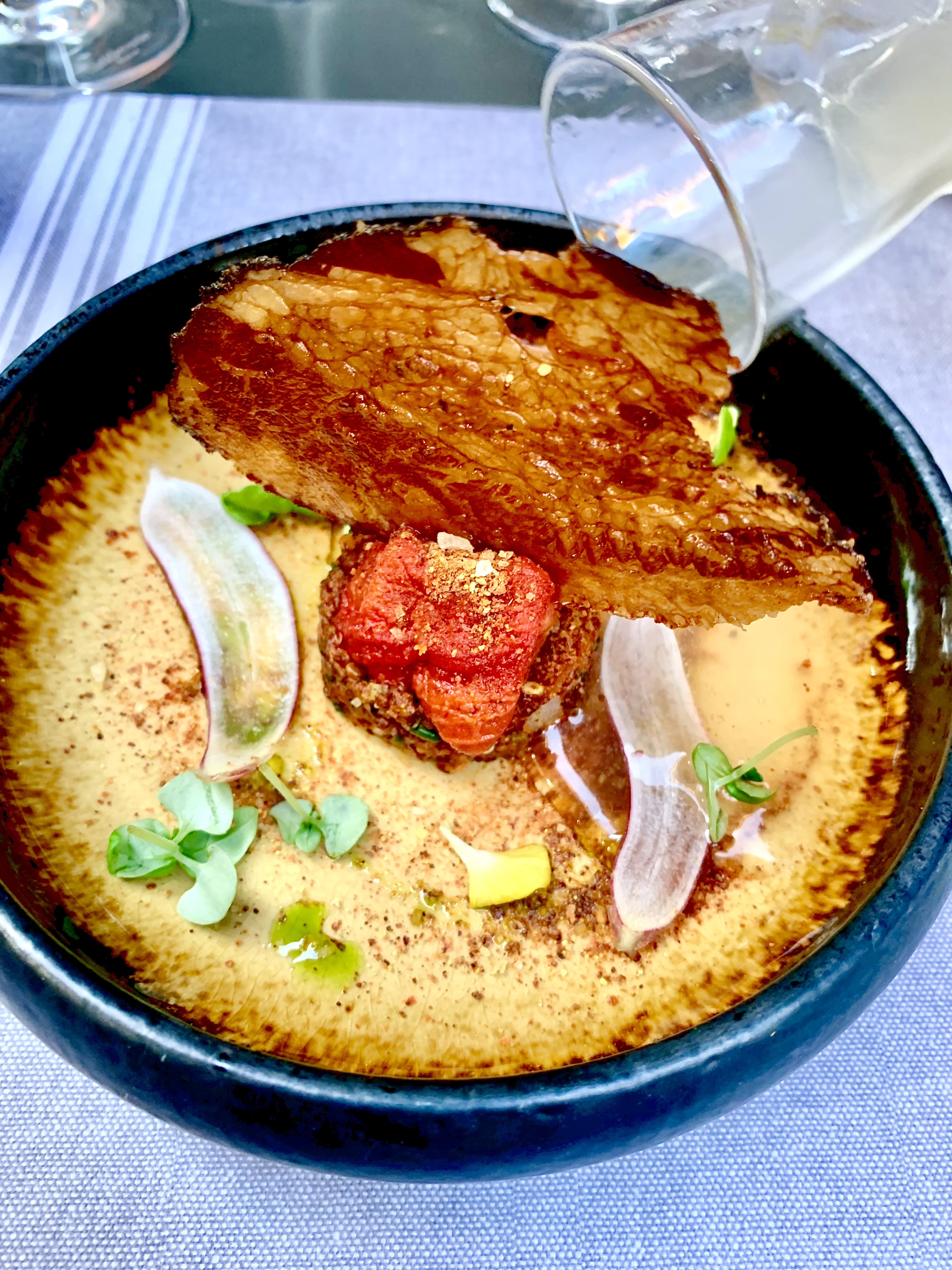 Le menu en 5 services débute par l’inspiration d’un Bloody Mary qui se déguste, Quinoa, tomate confite et céleri façon Bloody Mary : une eau de tomate à peine gélifiée pour une belle tenue et parfumée, tel un confit. Le quinoa donne du croquant et du mordant, la tomate, assouplie et légèrement déshydratée pour apporter à la fois fondant et fermeté, est pleine de ferveur. Le guanciale en chips délivre la croustillante gourmandise. Les pousses de basilic et les pointes de céleri rafraîchissent et condimentent le tout. C’est une assiette de saveurs vivifiantes en transparence et textures, qui donne parfaitement la tonalité et l’identité du chef.