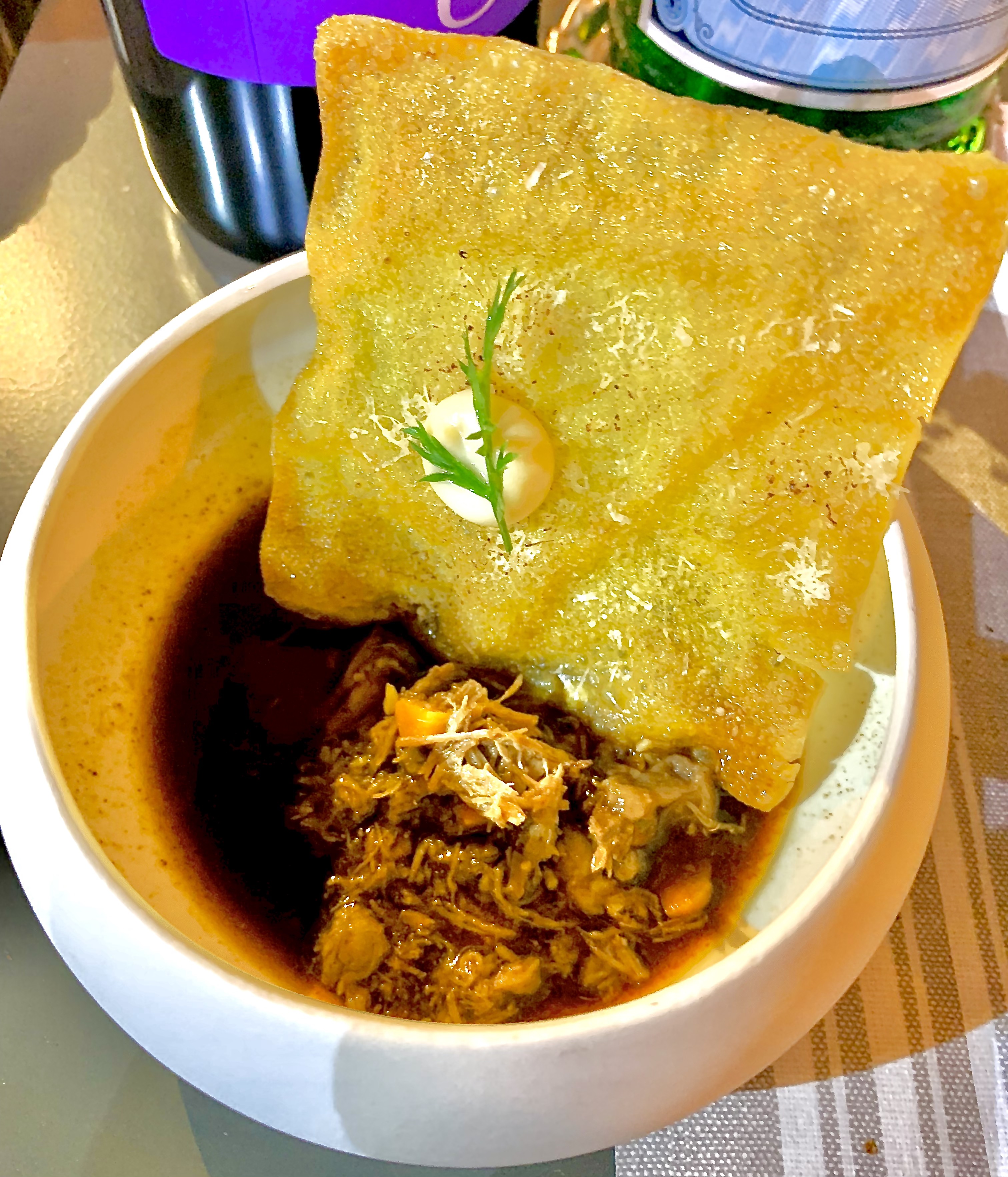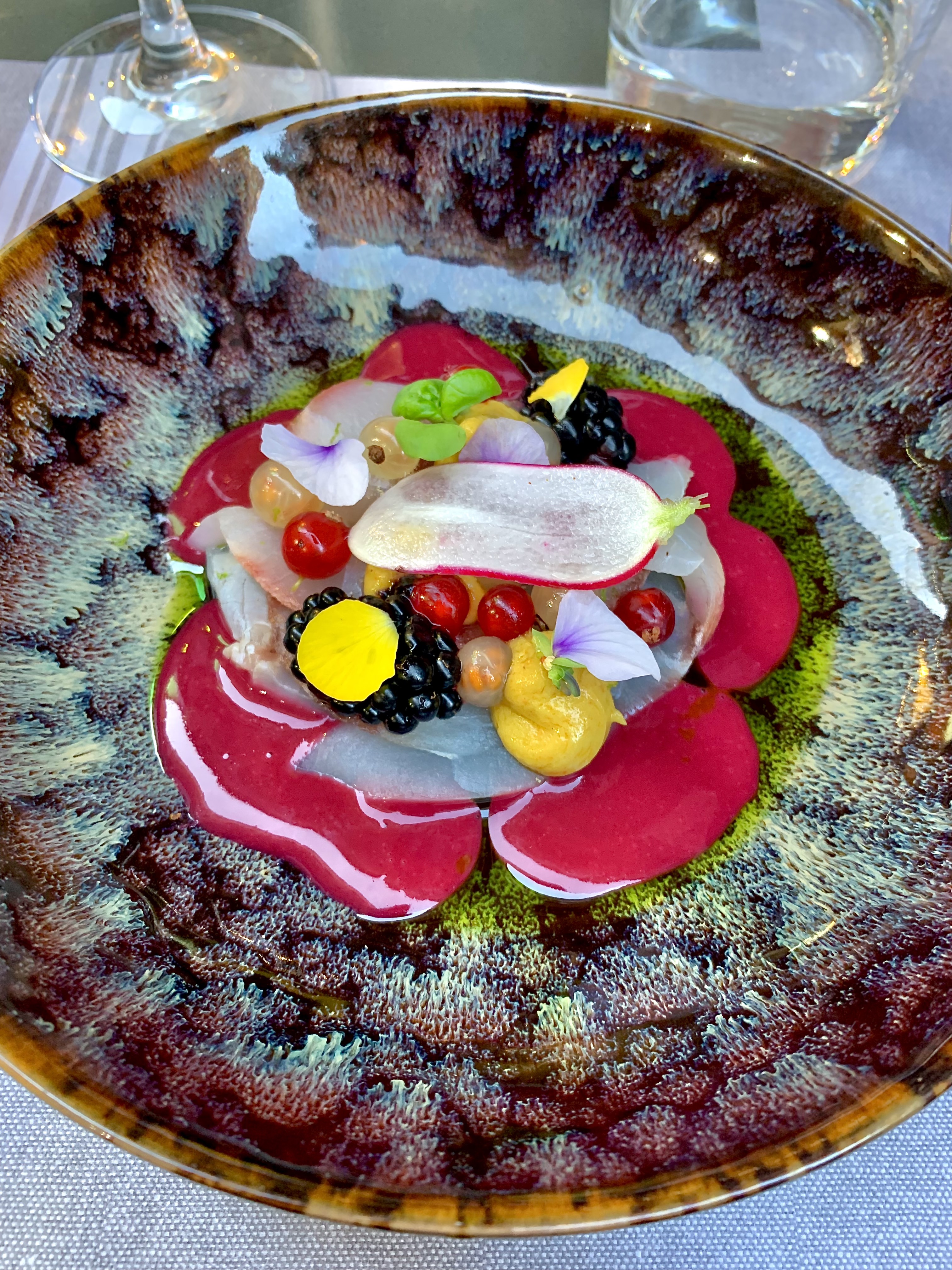Ceviche de Maigre, leche de tigre aux cassis, fruits des bois, crémeux d’avocat : le maigre, en élégante découpe, ne se laisse aucunement intimider des saveurs vives et acidulées des fruits rouges. Le leche de tigre au cassis est un lien d’iode, rougi du fruit, l’huile de verveine adoucit précisément de sa touche herbacée et le guacamole d’avocat au saté est le condiment qui finalise le tout. C’est équilibré, bien dosé, tout est à sa place, les ingrédients s’accompagnent parfaitement les uns avec les autres.