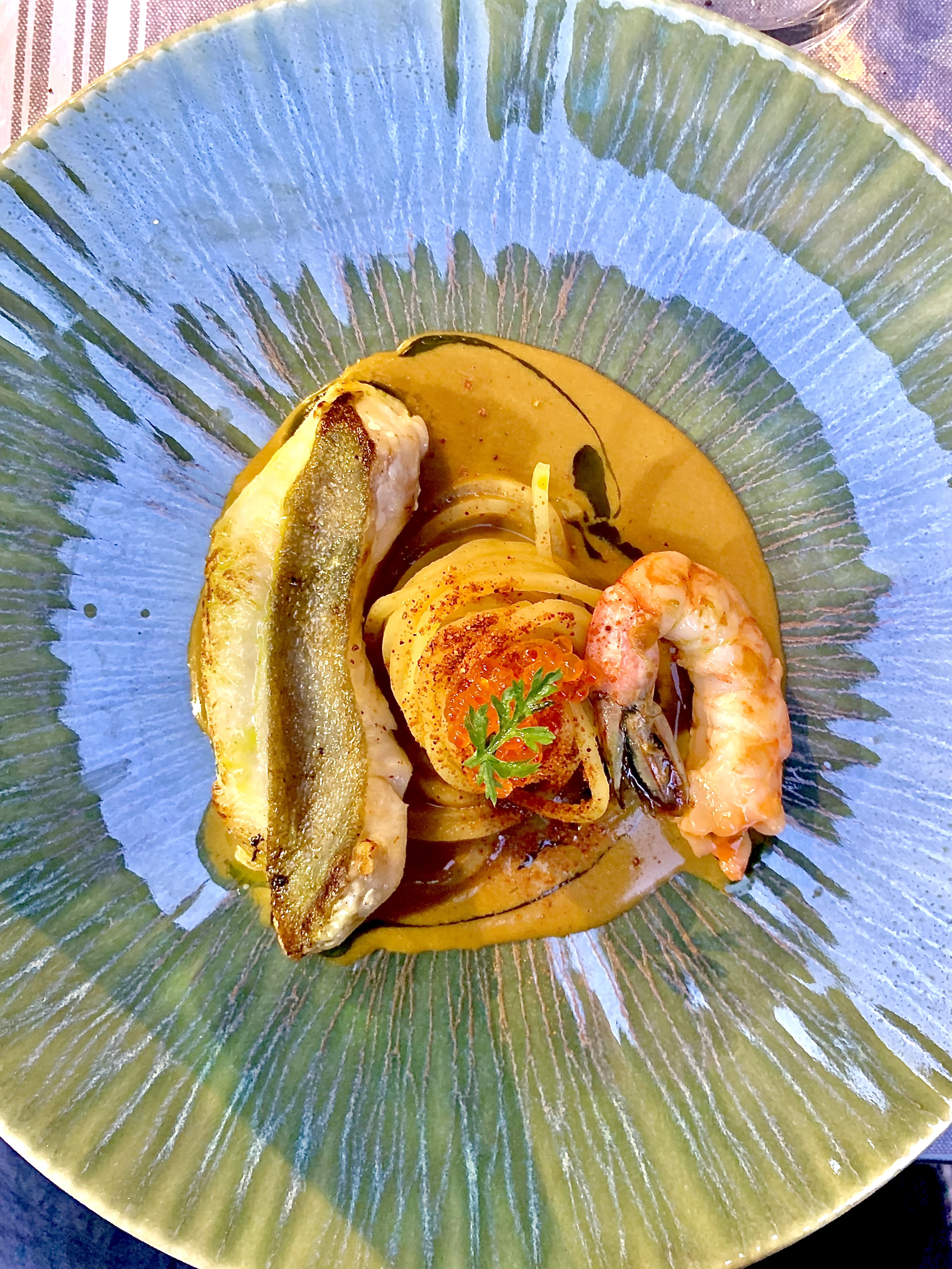 Soupe de poissons de Méditerranée revisitée, servie en deux services. D’abord, le filet de Saint-Pierre, d’une cuisson ajustée, est épaulé d’une crevette au fumet rare, presque nacrée de pudeur. Les spaghettis de pomme de terre, rehaussés des oeufs de truite, dimensionnent l’assiette de ludique et d’iode à la fois. La nappante soupe de poissons se révèle comme une sauce intense de la mer, qui résonne en harmonie. Puis, dans une fine coupelle, se trouve la version onctueuse de la soupe de poissons accompagnée de légumes, comme la courgette, le fenouil, les petits navets qui gardent de leur belle véracité. Les algues et la salicorne renforcent de goût et de texture et le tout s’organise à merveille. La fine tranche de pain croustillant est en pointillé d’une frémissante rouille fumée. Les deux assiettes se font judicieusement écho sans être dans une lecture redondante.
