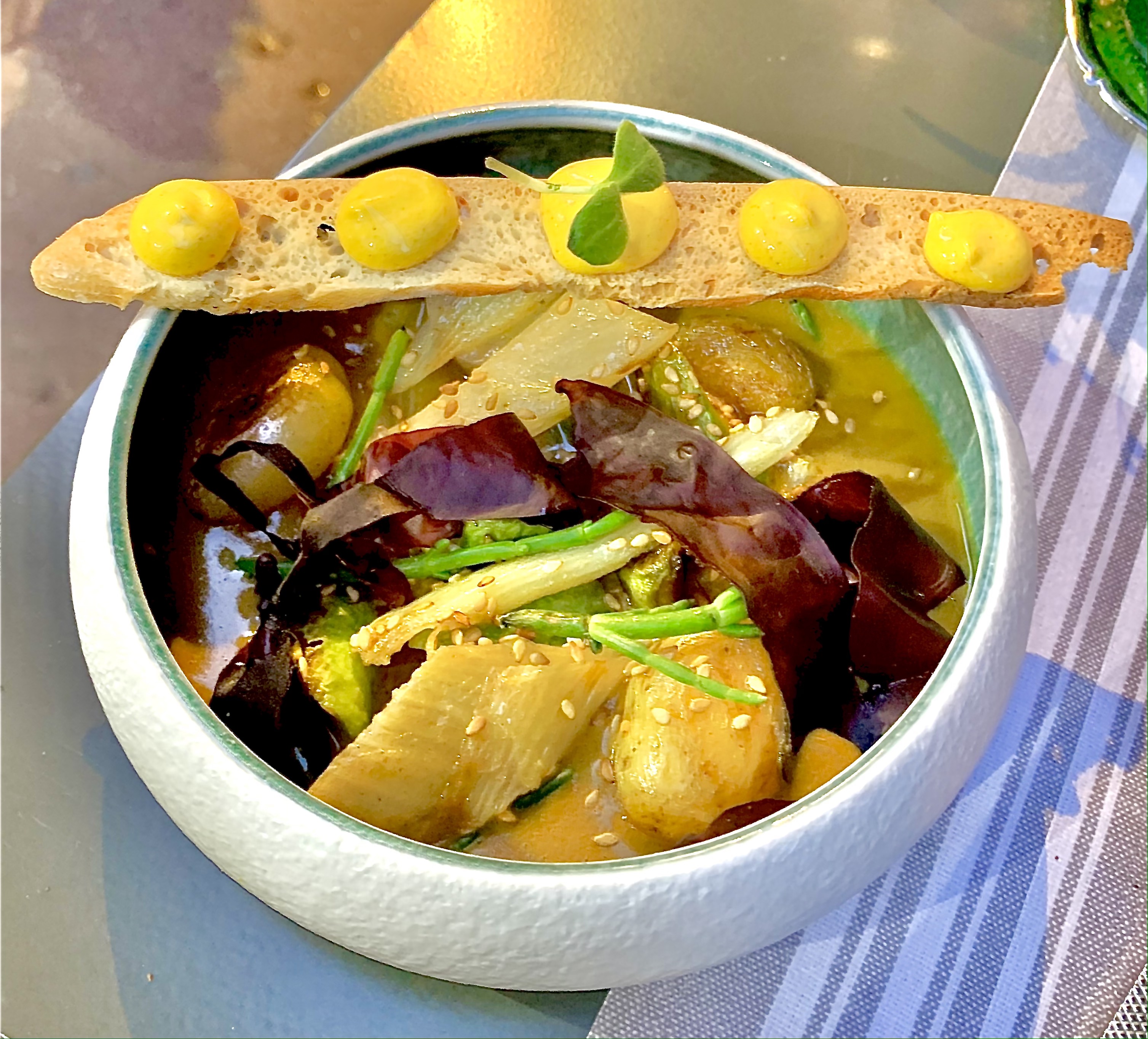 L’agneau en deux façons, purée d’artichaut, ragoût d’artichaut et pois chiche : tout d’abord la selle, d’une texture croustillante, est d’une saveur convenue, la lisse purée d’artichaut se fait délice, les pois chiches claquent de personnalité provençale et enjouée et le jus de viande rythme en puissance l’assiette. En second service, l’agneau s’offre de sa belle personnalité en épaule confite et condimentée, sous une fine raviole croustillante, tel un ravioli frit asiatique, le tout est idéal, vibre en bouche et vous emmène instantanément sur un tumultueux marché de Hanoï.