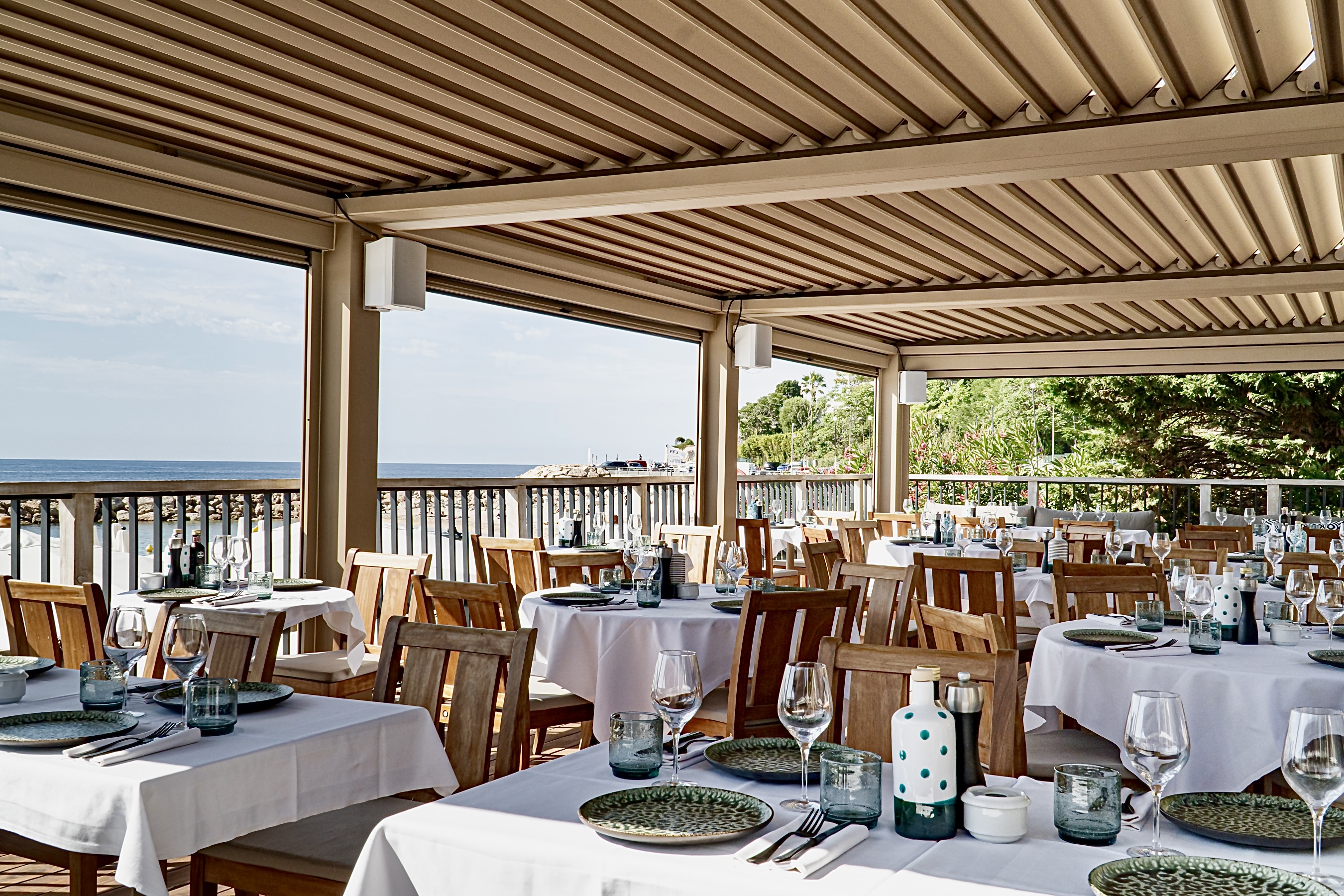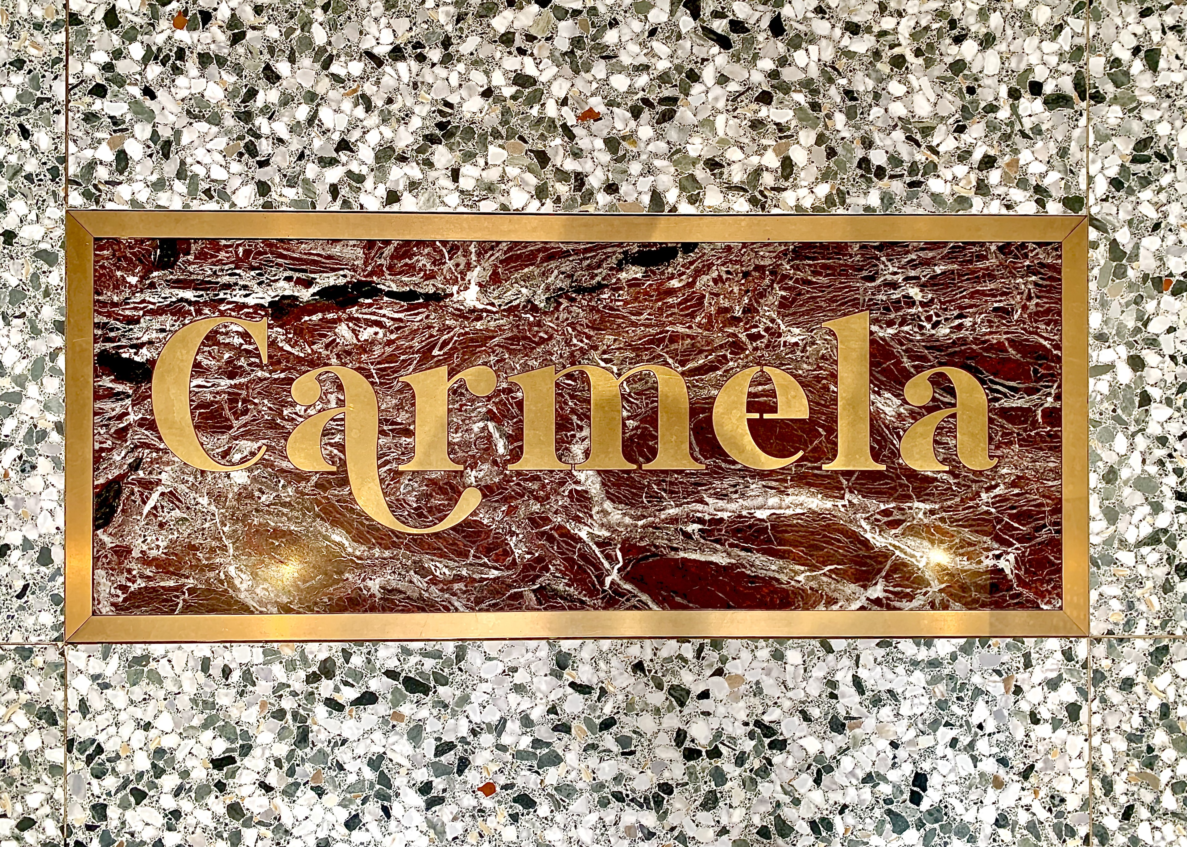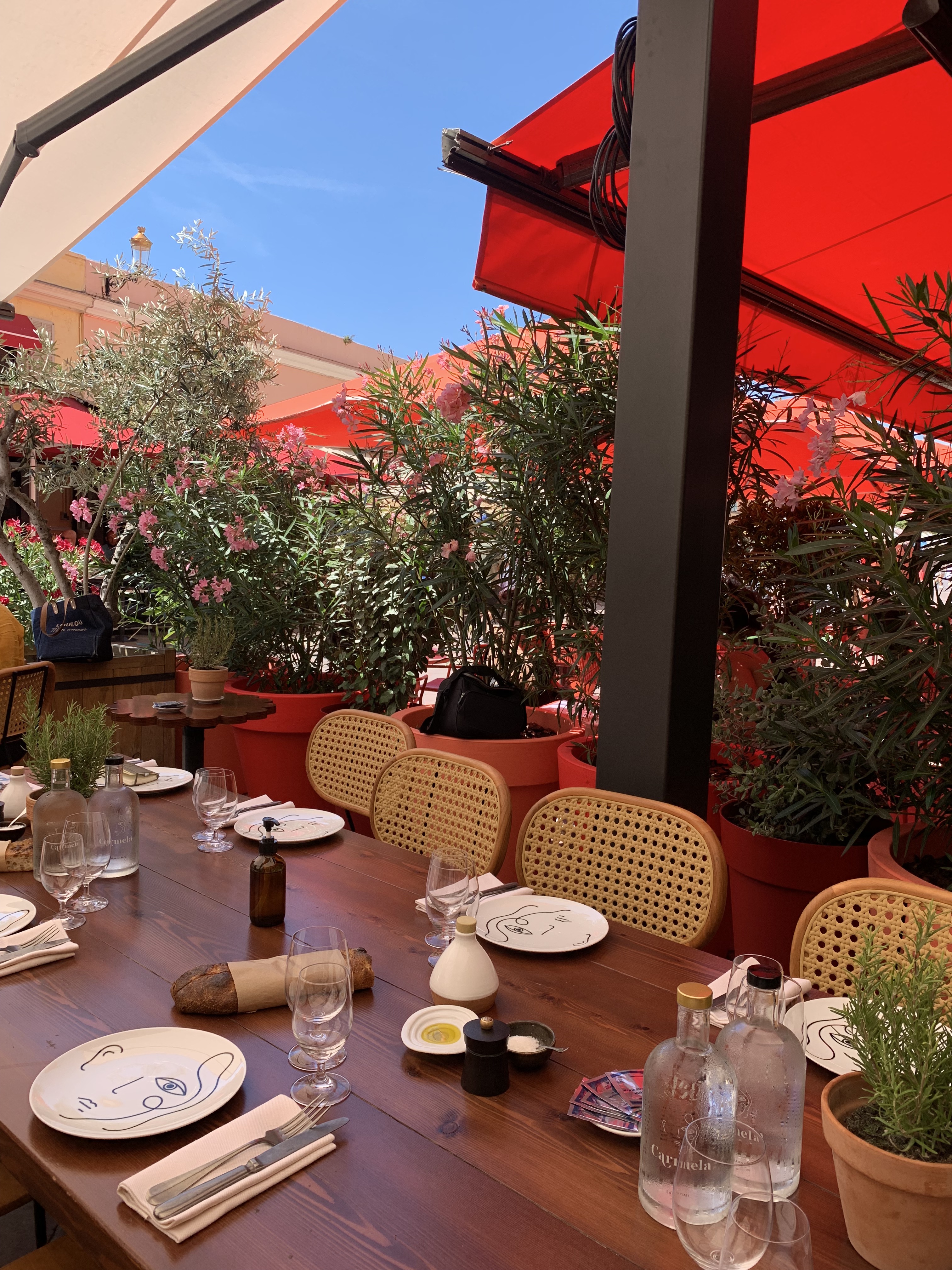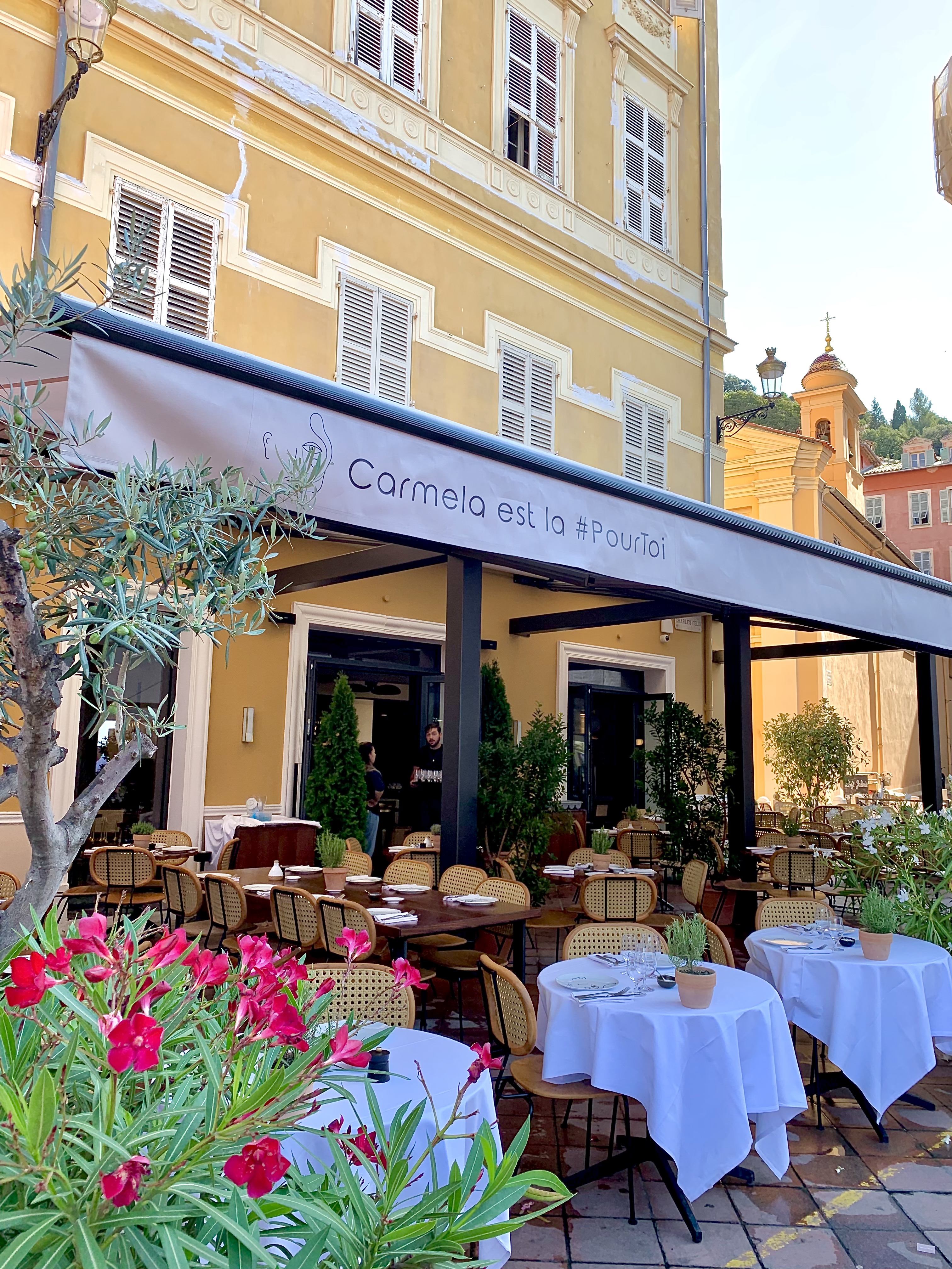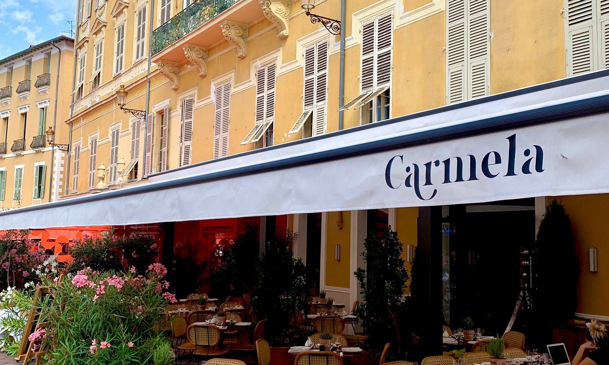 La terrasse est élégante, et dénote à merveille de son raffinement avec les établissements voisins. Placé tout au bout du Cours Saléya et presque au pied du mythique et sublime Palais Ribotti-Caïs de Pierlas qui accueillit les ateliers du célèbre Matisse, Carmela réhausse ce joyaux de la ville de Nice, désormais inscrite au Patrimoine Mondial de L’Unesco. La salle s’enflamme d’un décor chic, fantasque et felinnien.
