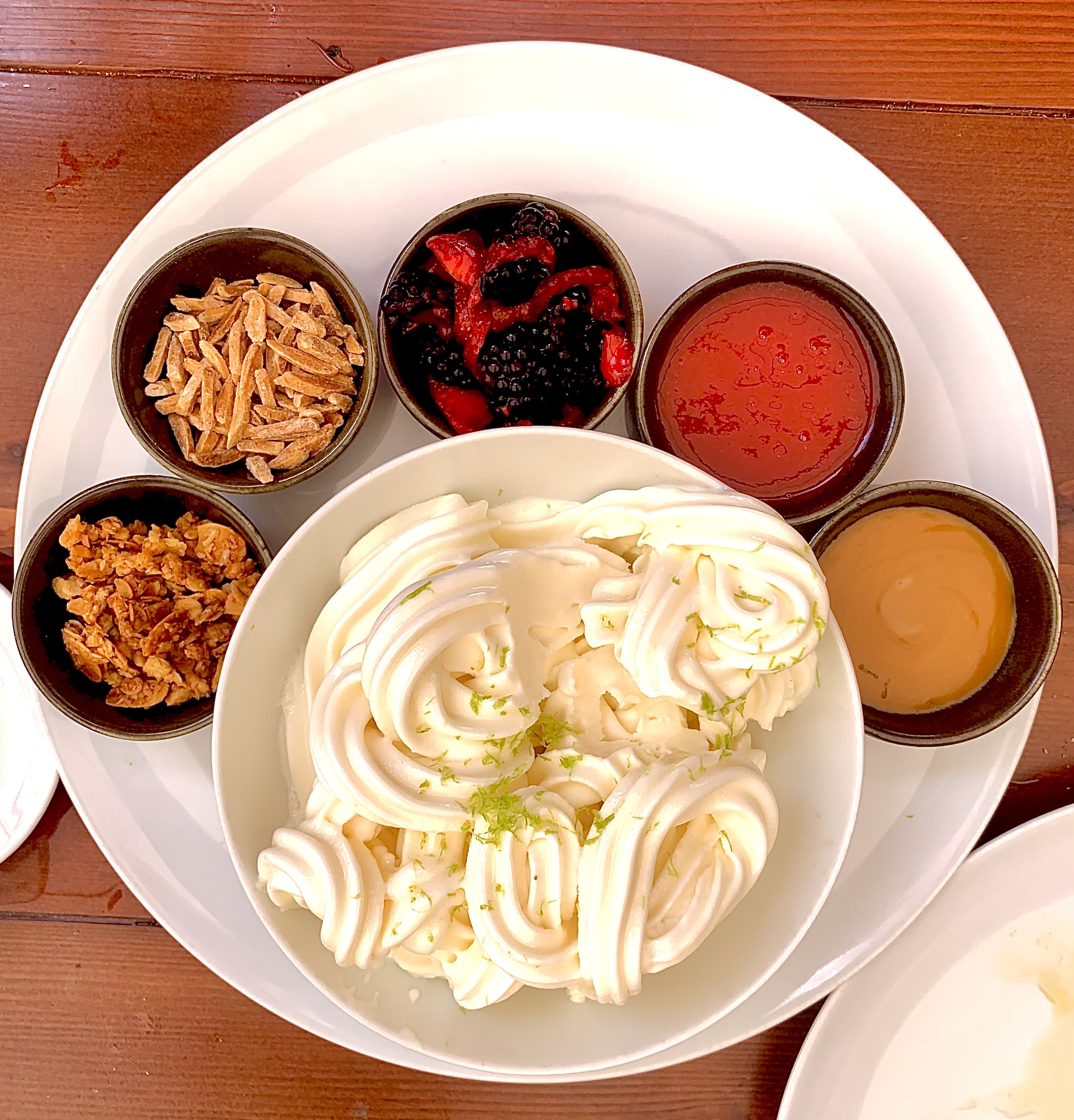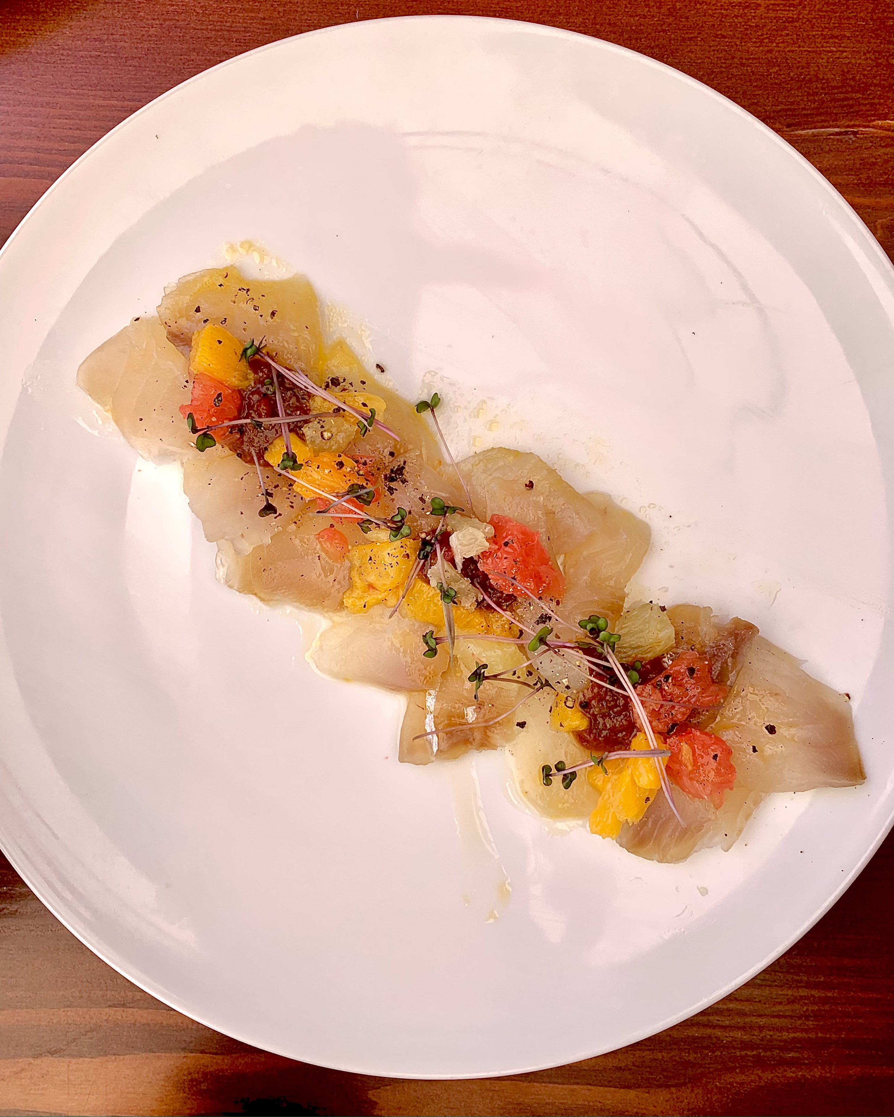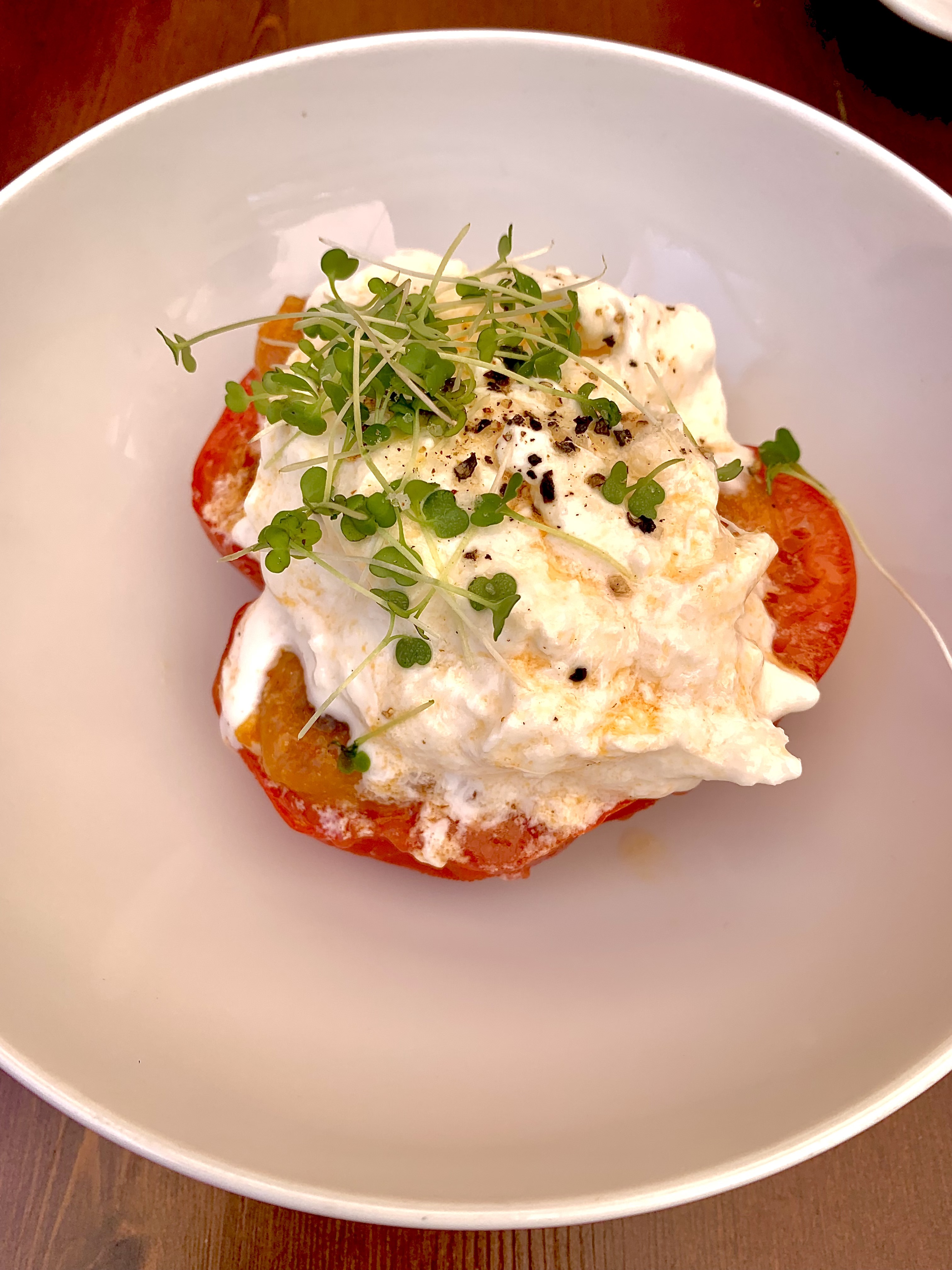 La Coeur de Boeuf est judicieusement marinée à la Verveine, engourmandisée de la Stracciatella et punchée du confit d’Agrumes qui donne le peps et titille les sens.