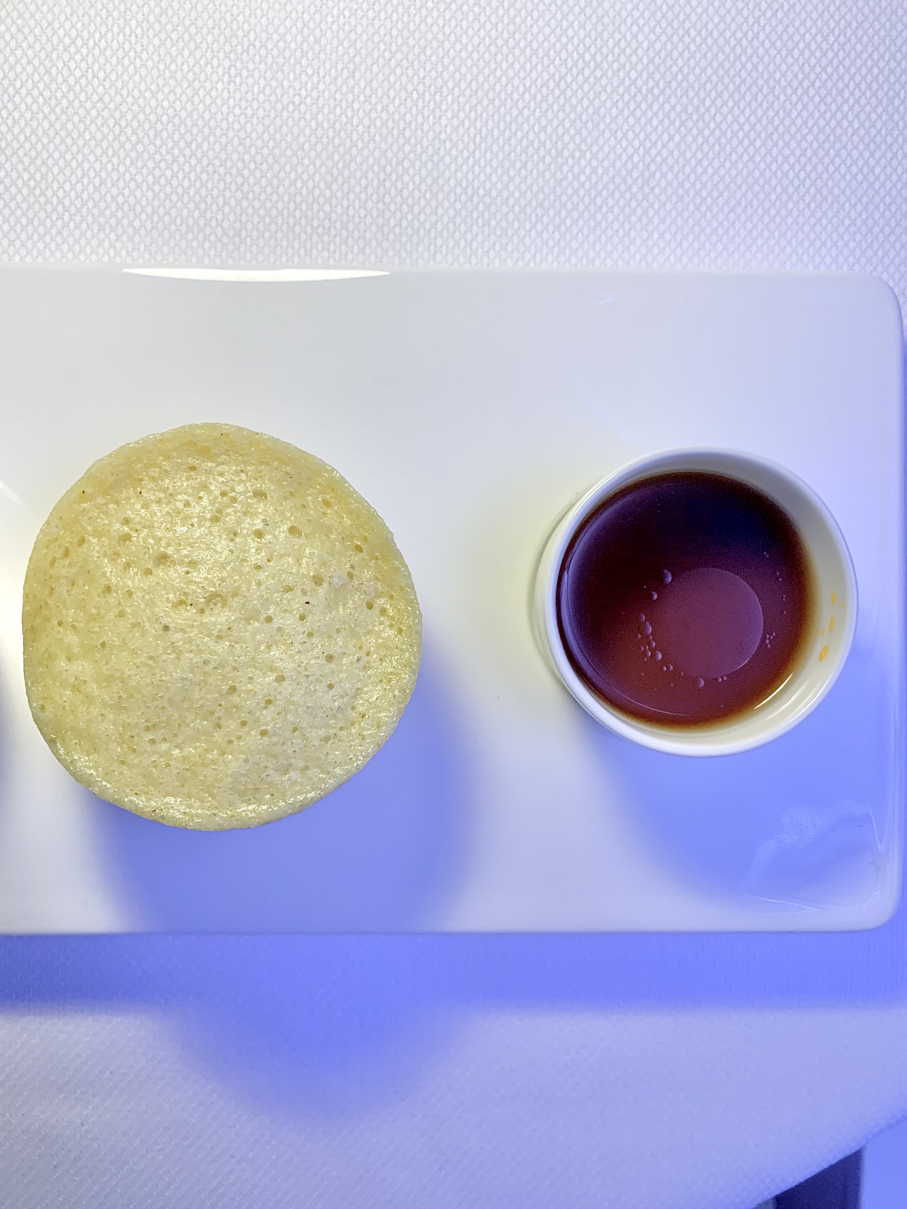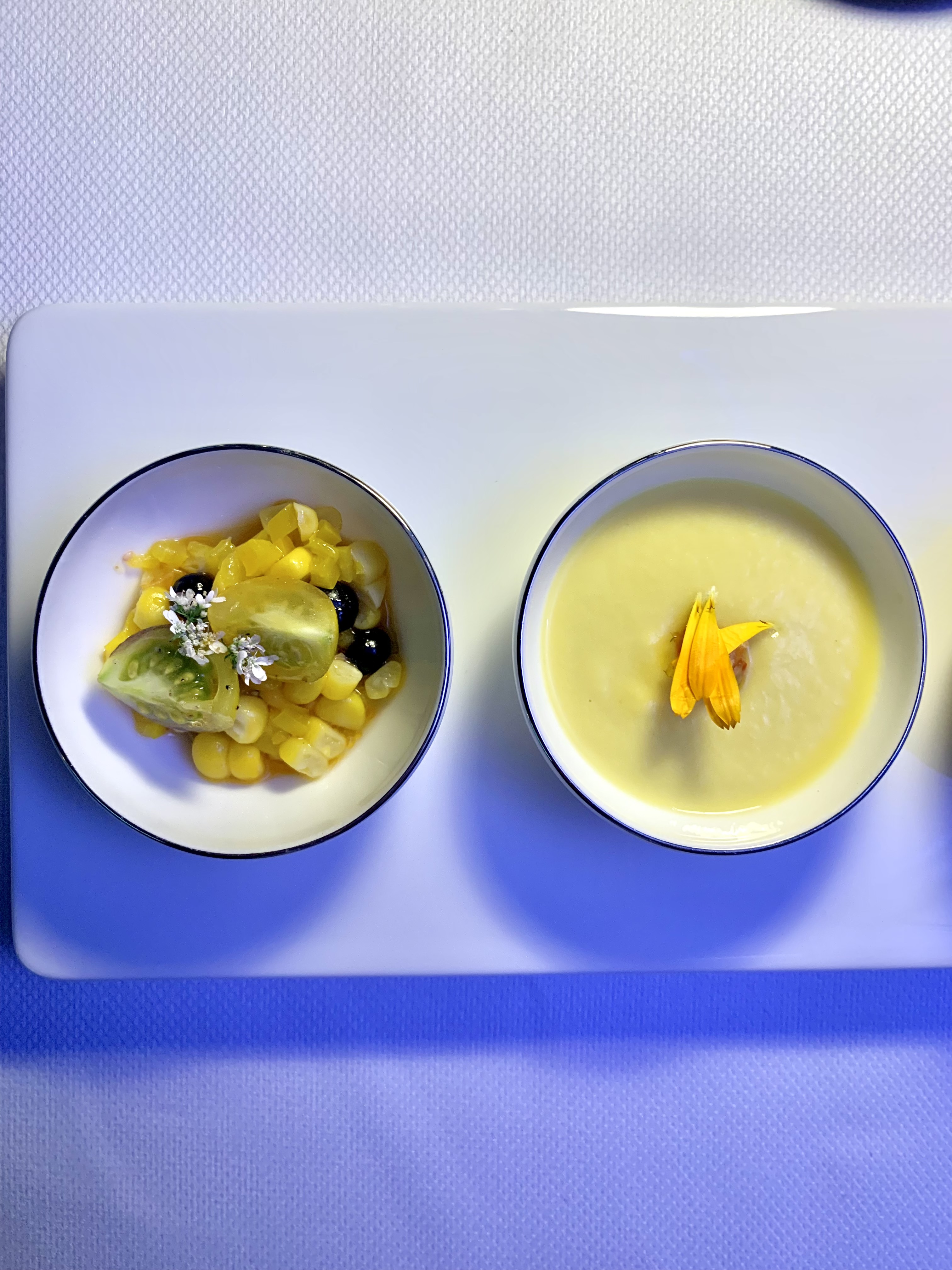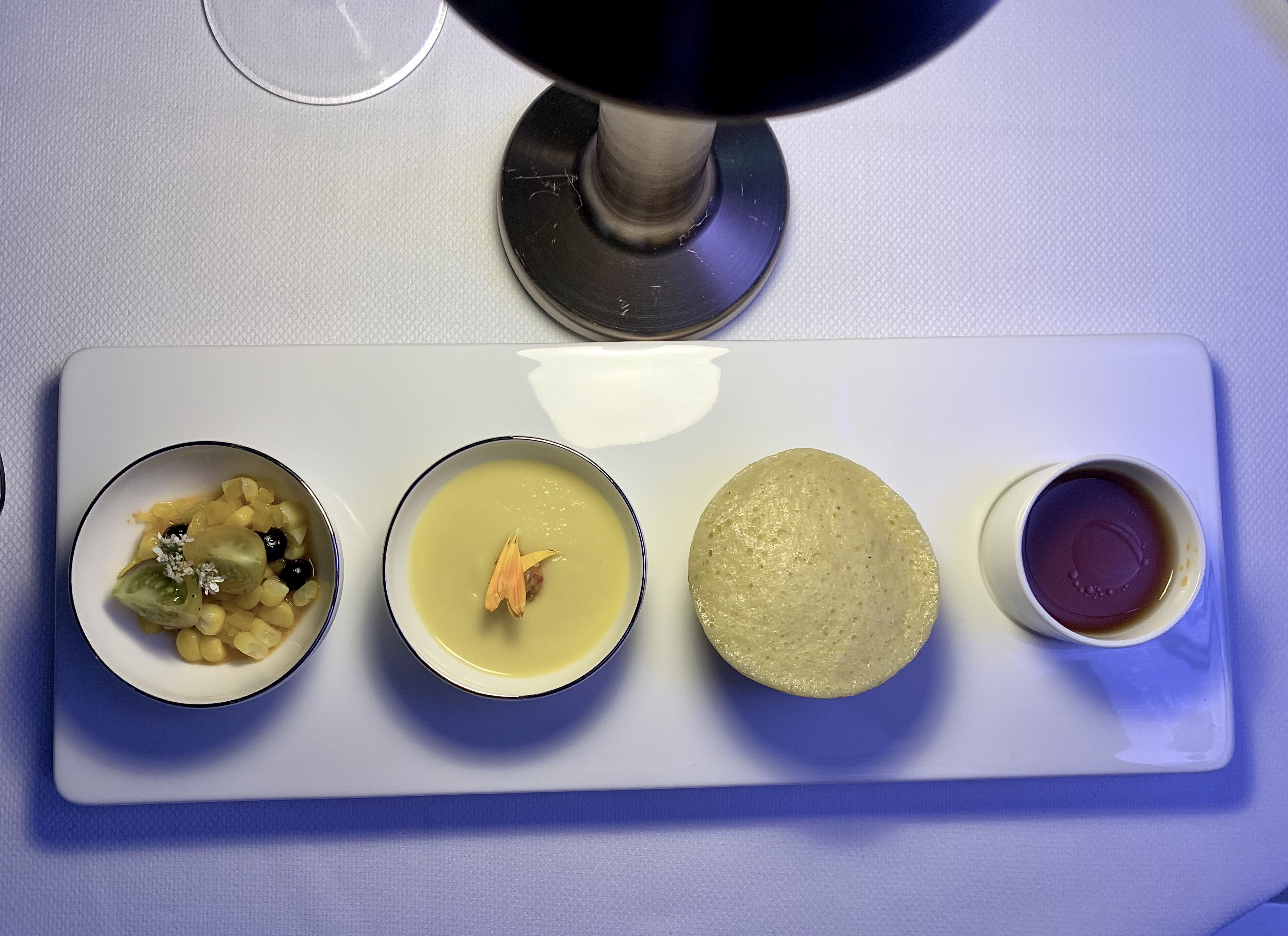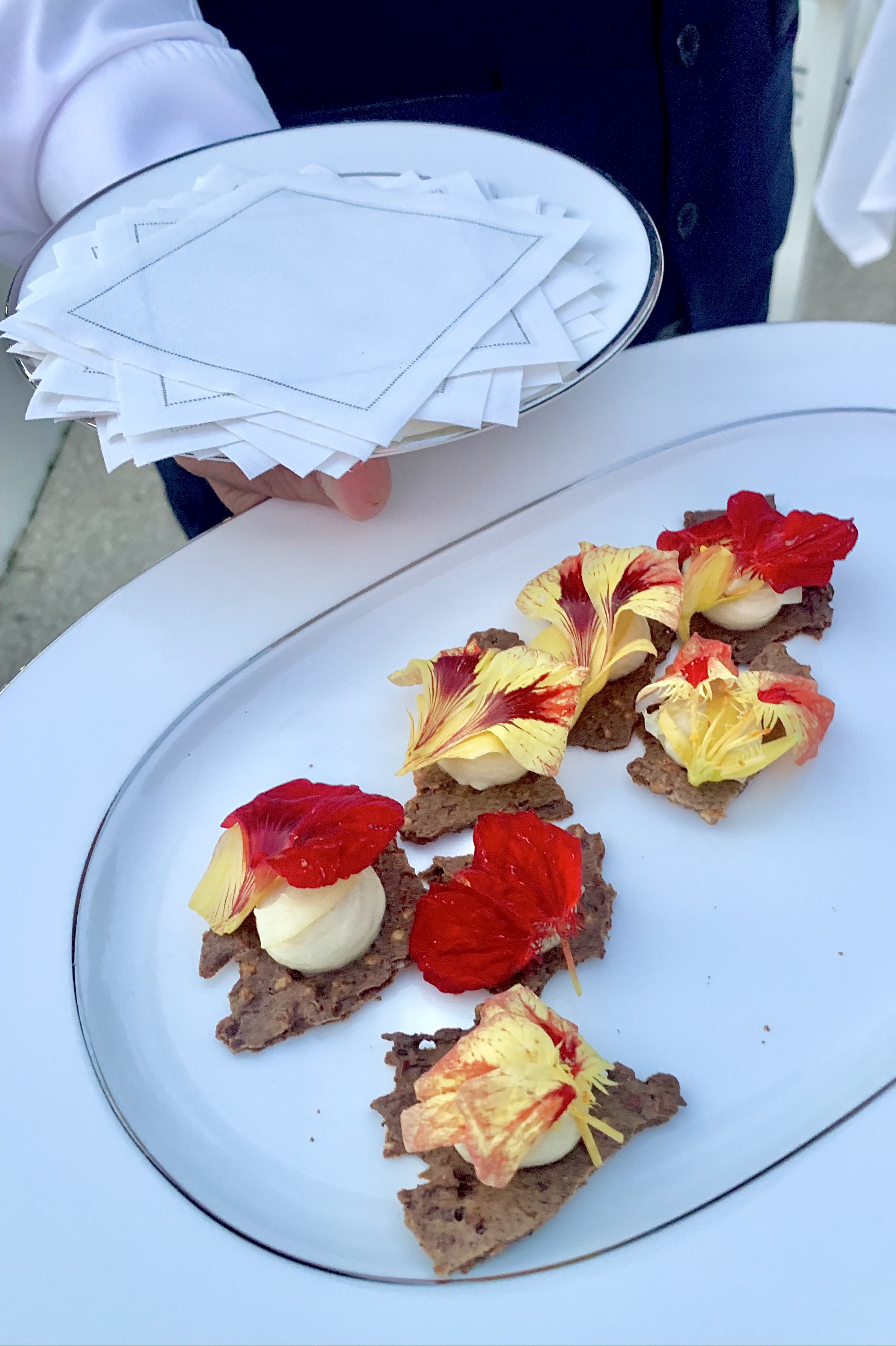 Après une coupe de champagne et un amuse-bouche de tuile de sésame parmesan et fleur de capucine, au son et au rythme des vagues, sous un soleil merveilleusement couchant, le menu débute par la pré-entrée élaborée par Manon Fleury : Pain vapeur à la farine de maïs, crème de maïs et piments doux. Véritable déclinaison du maïs dans toute sa vérité, avec une salade vive et appétante, des grains de maïs en croque fraîchement coupés de l’épi, les fleurs de fenouil déclinent leur intense note de réglisse anisée et la vinaigrette se péche d’acidité de la myrtille. La crème de maïs, légèrement aillée, est douce et sauve à la fois et se relève du piment en filigrane. Le Pain de maïs à la vapeur est moelleux de réconfort et rassemble le tout en douceur. Le bouillon, tel un consommé de maïs, ravive sans excès et prépare en harmonie à la suite.