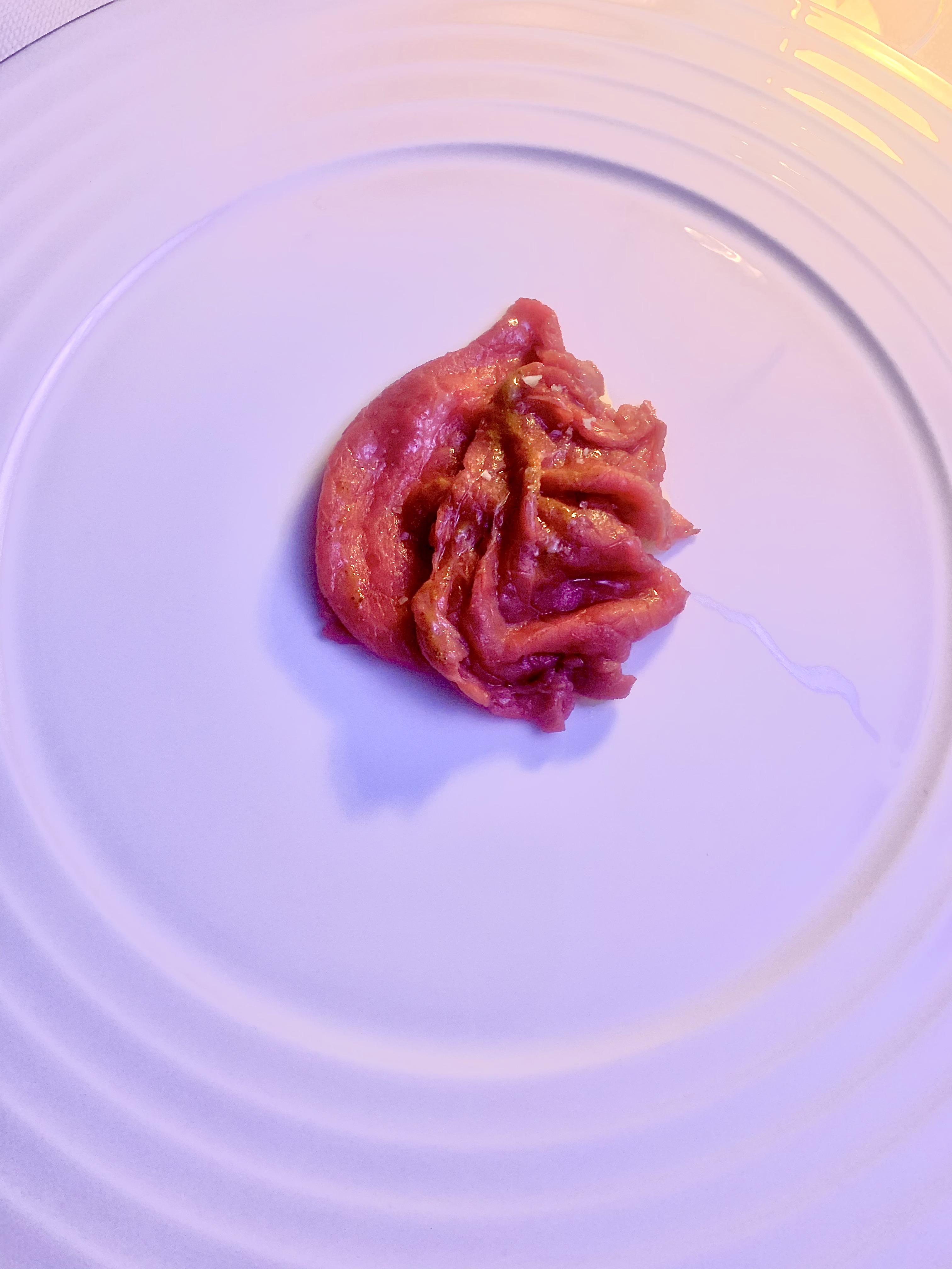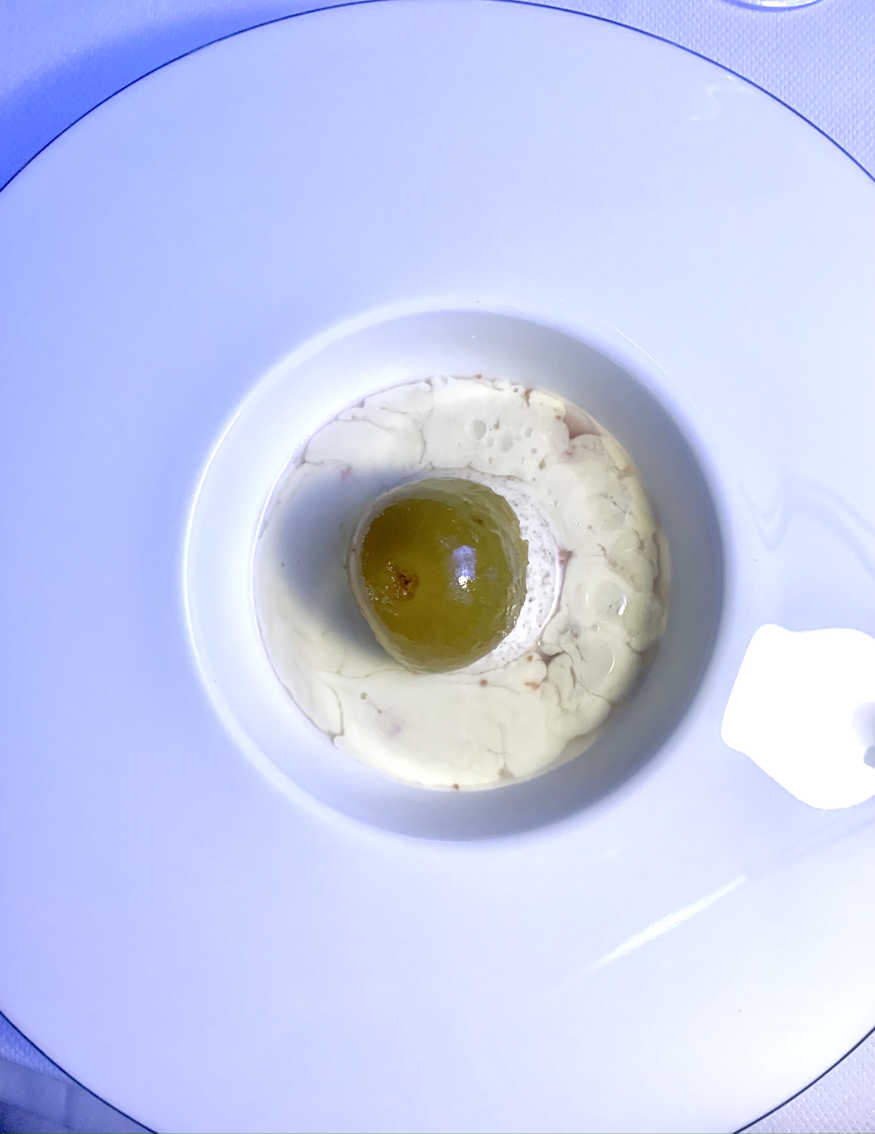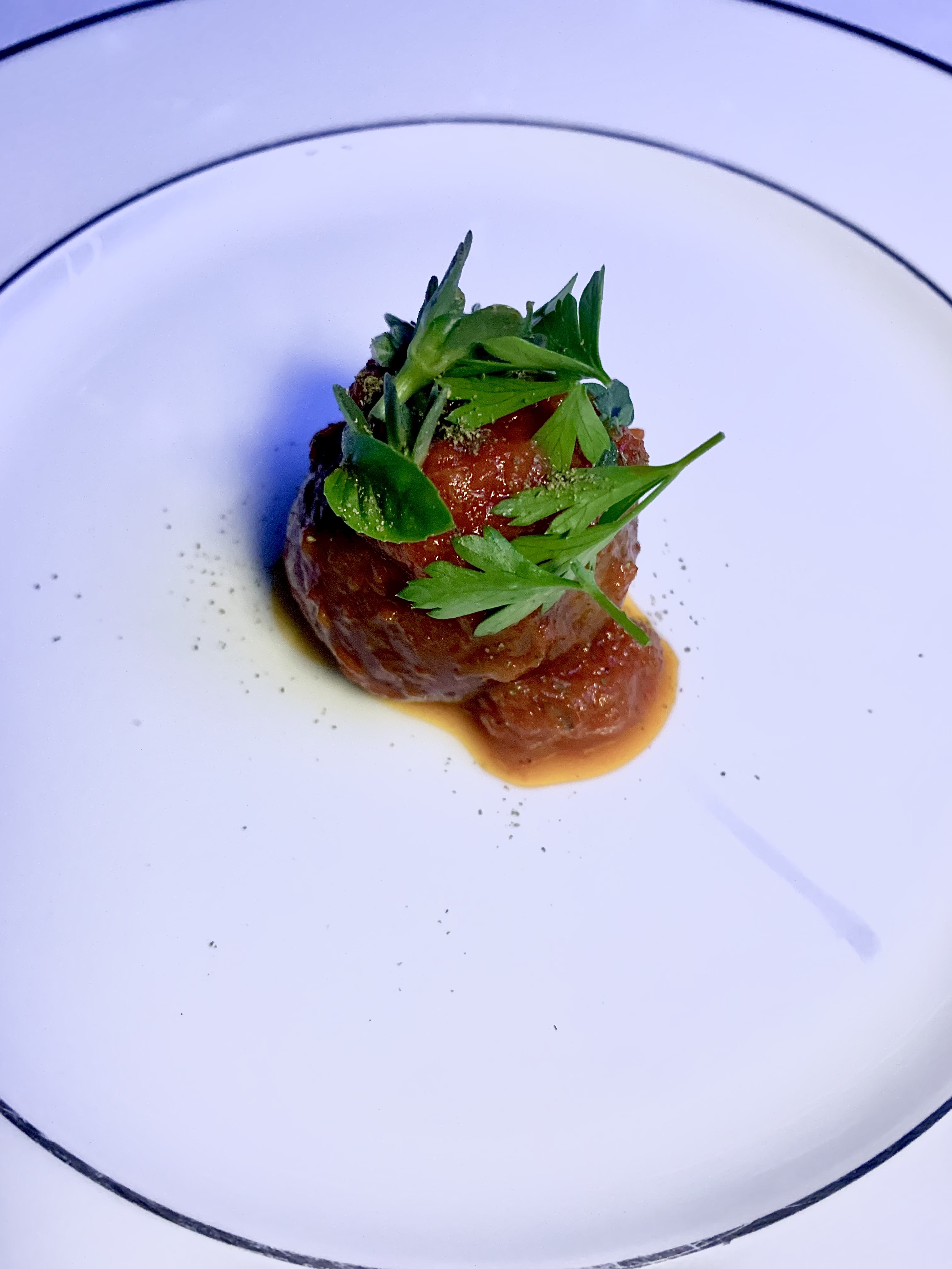 Pour Antonia Klugmann, il s’agit de la Figue, sauce tomate & laurier : une figue travaillée comme une boulette de viande d’une sauce bolognese. Le visuel est celui d’une « meatball » enrobée de sa sauce, rehaussée d’herbes aromatiques. A la première bouchée, on retrouve toute la gourmandise des plats familiaux italiens, de cette sauce tomate travaillée en une intense passata en réduction de laurier. La figue à la texture ferme, rôtie minute telle une viande, se découvre au fur et à mesure de la dégustation et déstabilise les papilles de délice tomaté d’une sucroisité minime. Un trompe l’oeil d’une excellente précision.