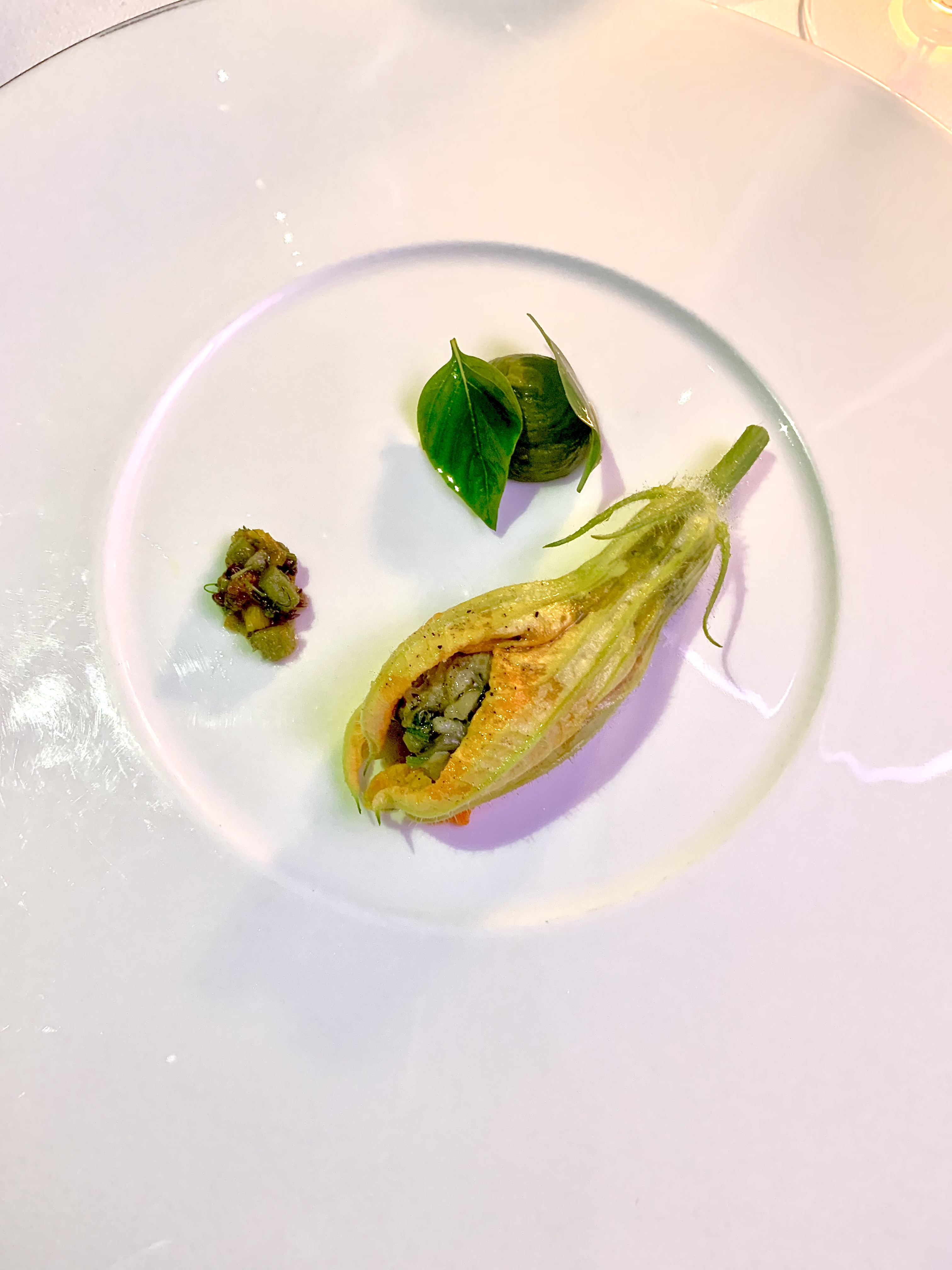 La Fleur de courgette farcie (Manon Fleury), au visuel raffiné et délicat, cache son jeux de saveurs et de textures. A nouveau, on construit, on créé son plat en associant les éléments et là, tout devient évident, complexe, puissant et ludique à la fois. La fleur, du Domaine d’Argerbol, se croque en direct et devient une inimitable référence de plaisirs percutants en l’associant avec la crème de fenouil au basilic. Le produit est dans toute sa splendeur et son intensité.
