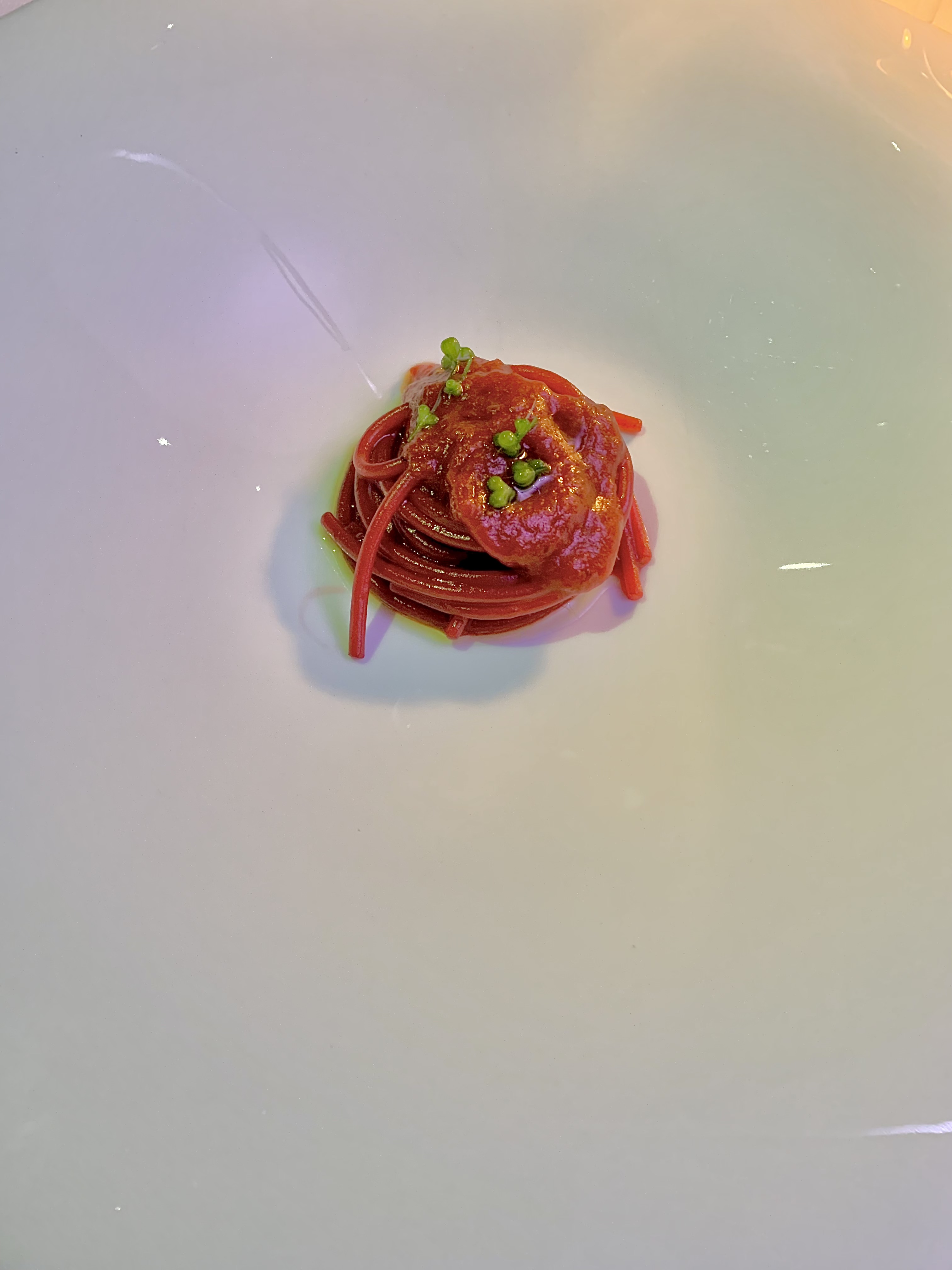Spaghetti, fraises et ail des ours (Antonia Klugmann) un intitulé surprenant qui peut faire douter de son association audacieuse. La décisive première bouchée est un incroyable mélange d’une confusion parfaite des genres. La fraise se prétend tomate en perfection de texture et de goût qui évolue en bouche et redevient fraise au fur et à mesure dans une parcimonie salée. Une complexité et une longueur en bouche assez bluffante pour les papilles, qui sont stimulées comme rarement. C’est à la fois évolutif, tranché, franc et subtil : déstabilisant de bonheur.