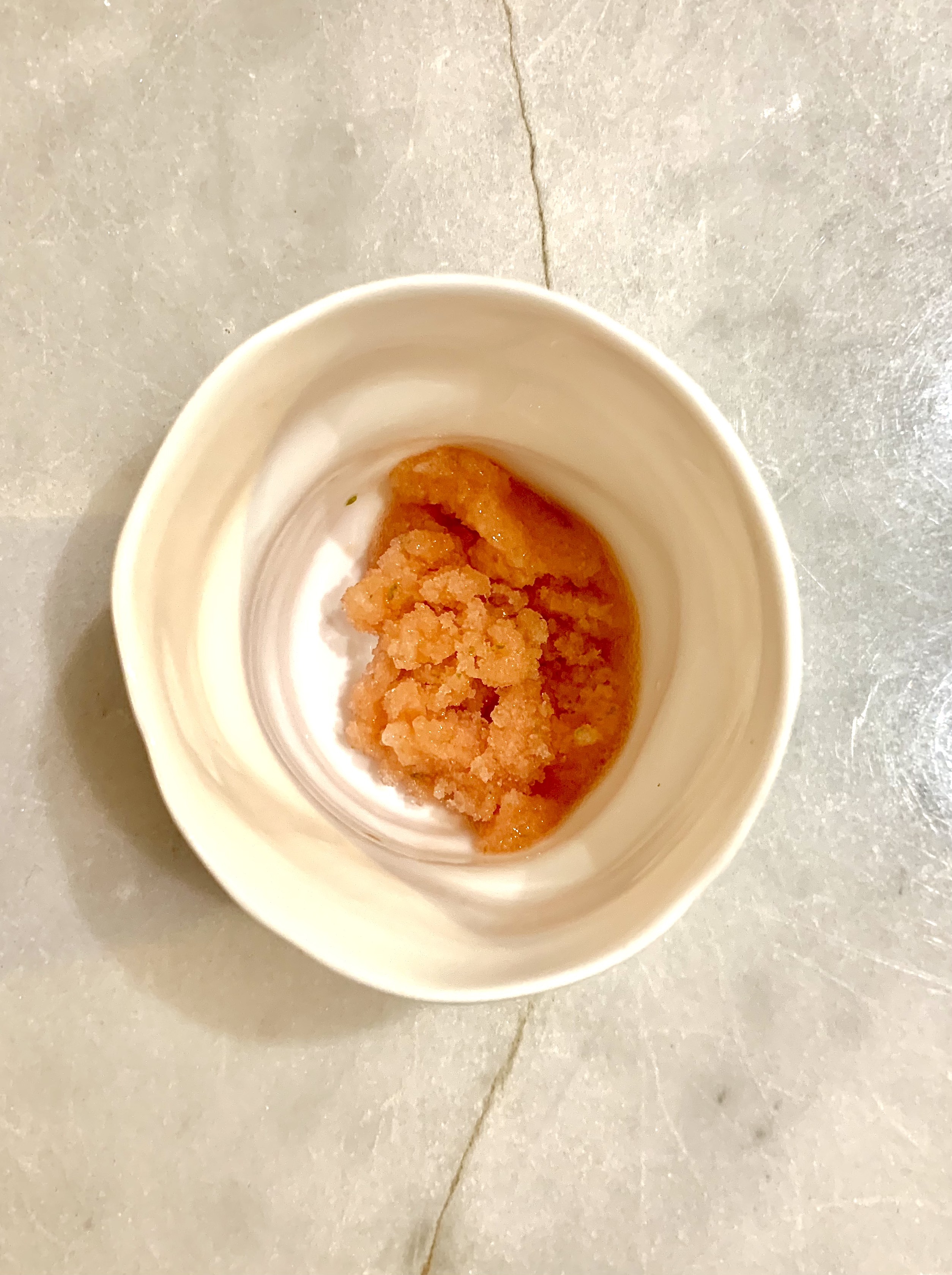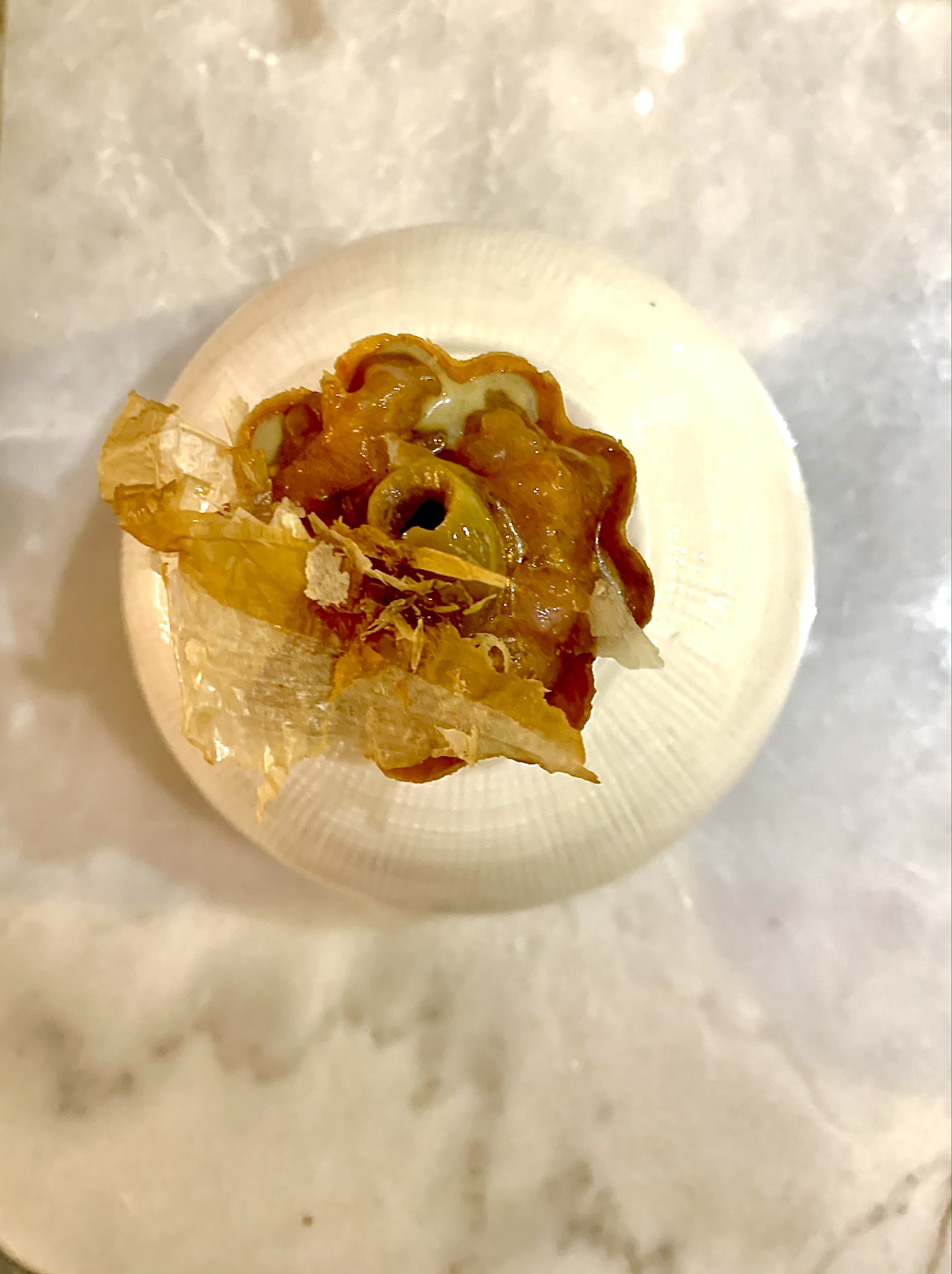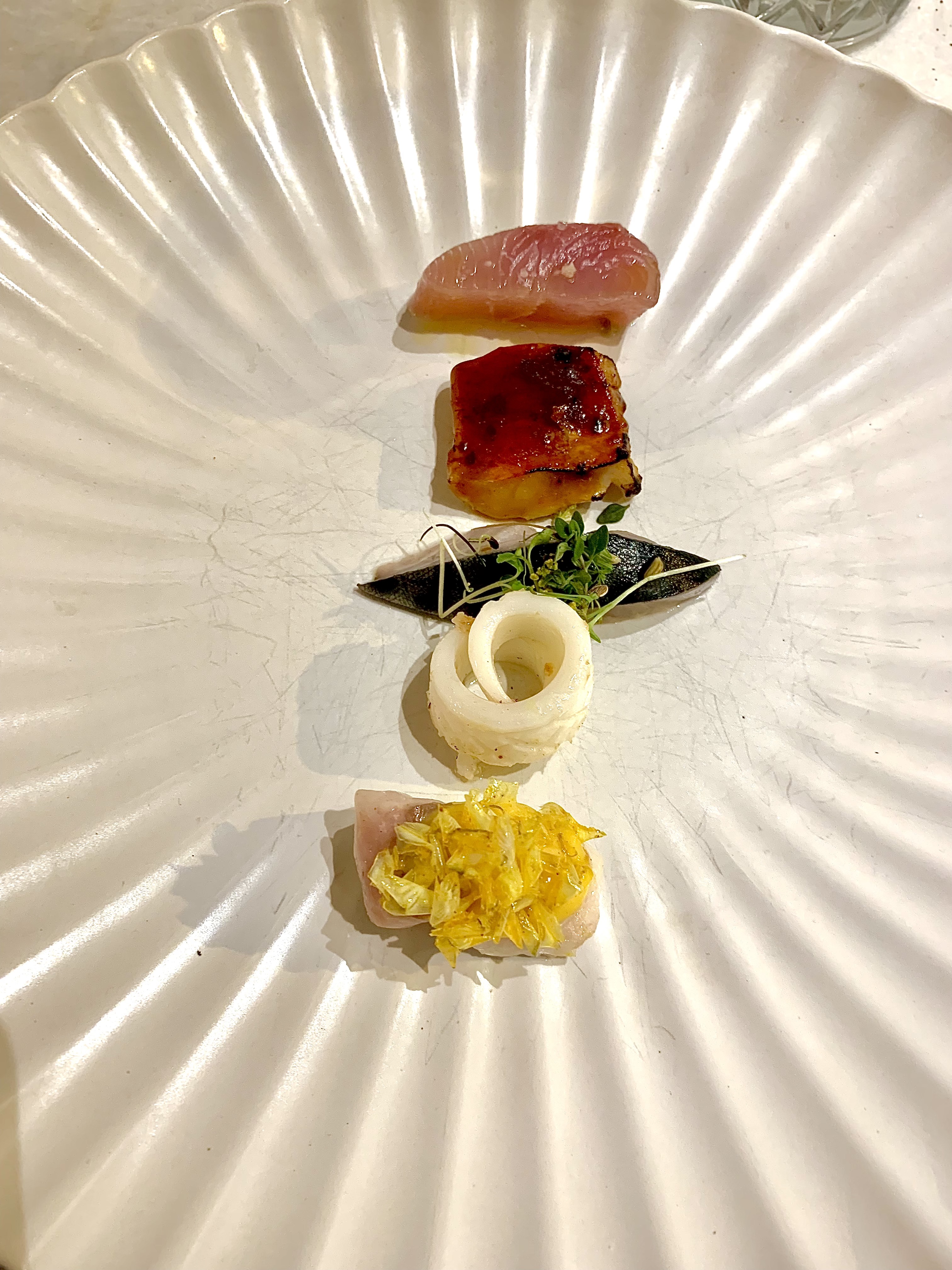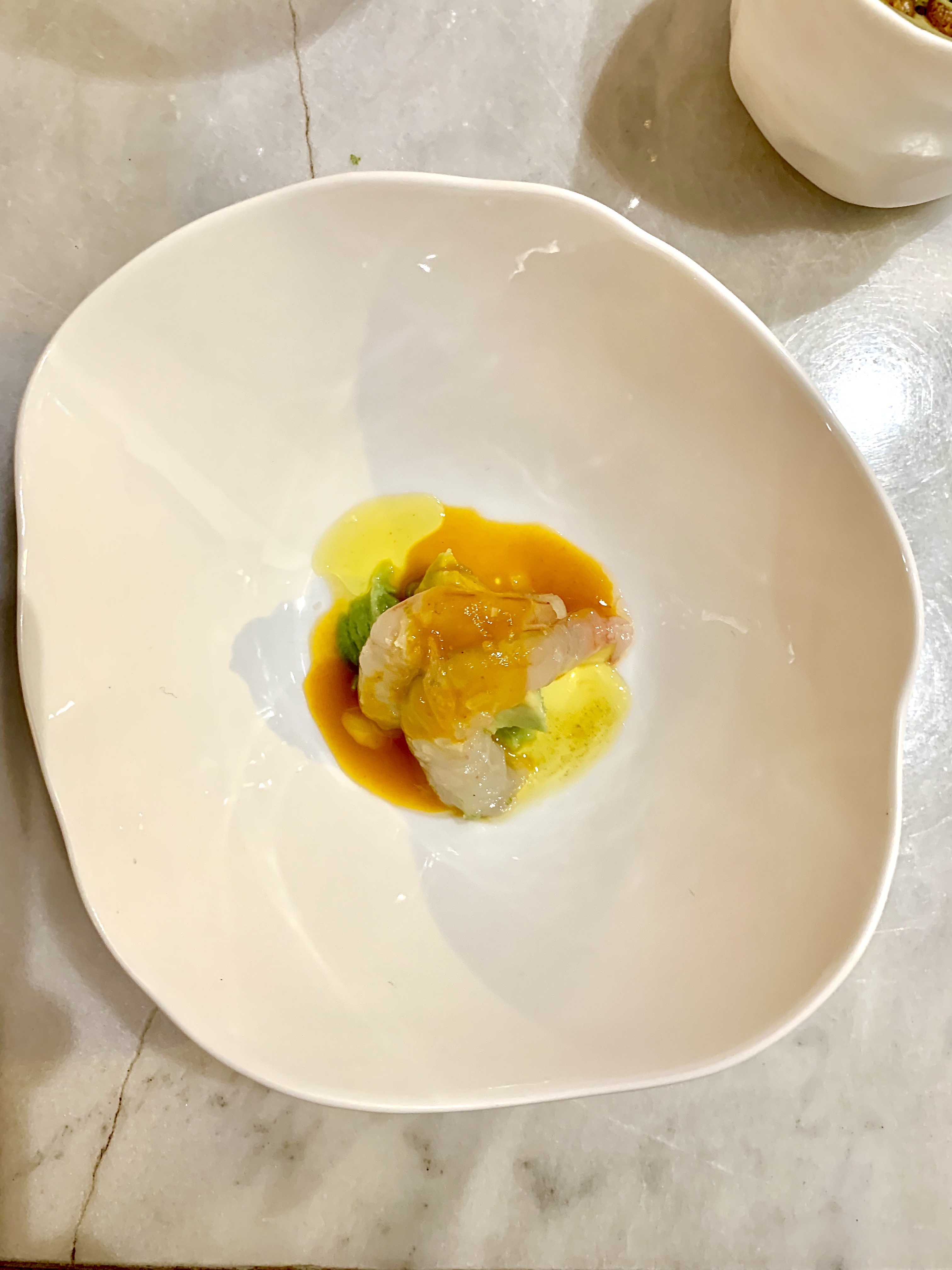 Du bout des doigts est un véritable festival savoureux de petits amuses-bouches, comme la fine et soufflée Panna fritta, chèvre, lavande et miel, la tarte comme un Vitello tonnato, olive taggiasca qui est un croque en bouche fatal rehaussé d’iode fumé en filigrane par le katsuobushi (bonite ou thon séché, râpé en fines feuilles, appelé également poisson dansant), ou encore l’incroyable Gamberoni de San Remo, avocat, jus mangue/ kimchi, huile de curry, tout en équilibre et souplesse, une version couture influencée d’Asie de l’avocat, crevettes de l’enfance. Sans oublier, la moule mousse vadouvan d’une belle gourmandise texturée, une revisite de la traditionnelle moule au curry.