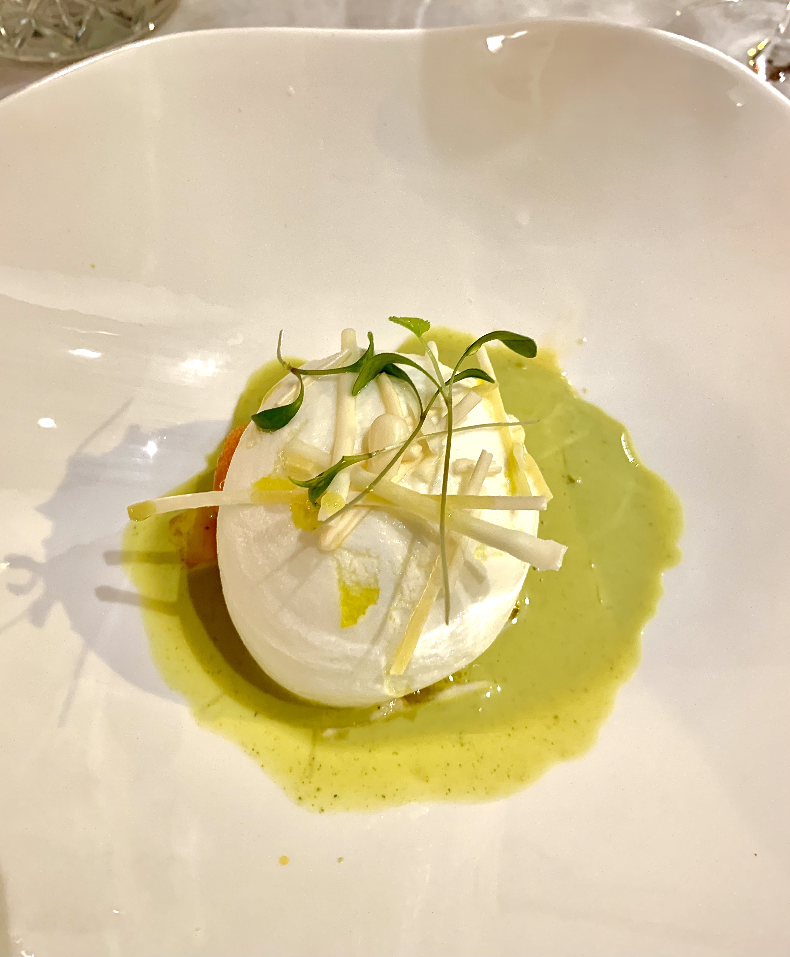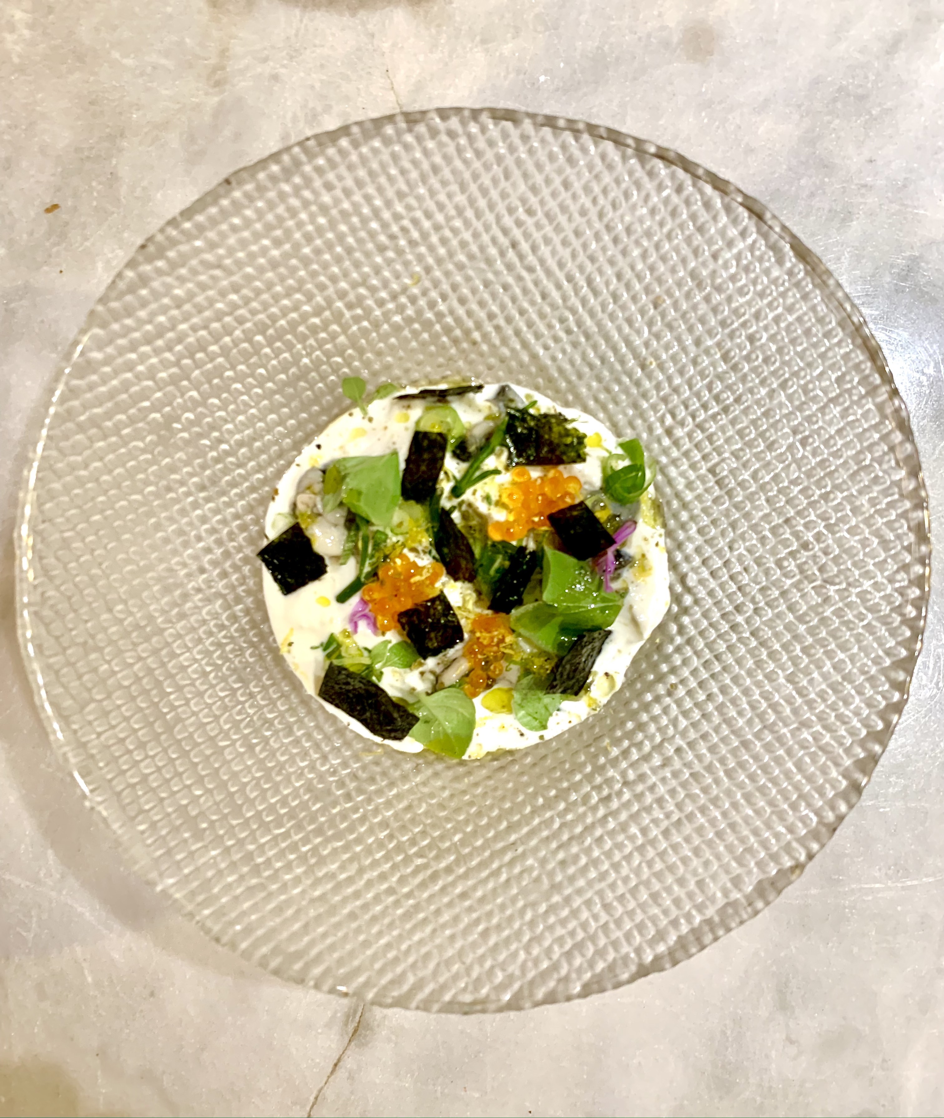 La Stracciatella fumée en apnée, huîtres & condiments iodés est une entrée à double personnalité, qui balance, dynamise et se fait douce et réconfortante à la fois. La soyeuse stracciatella, à l’intime goût de crème fumée à l’épine de pin, est très vite rehaussée par le claquant des oeufs de truite, par la profondeur iodée de l’algue nori et vivifiée du citron caviar, le tout enveloppé d’une pointe d’amertume des feuilles de bigaradier. L’huître donne de la mâche en structure. Une assiette qui « titille » les sens.
