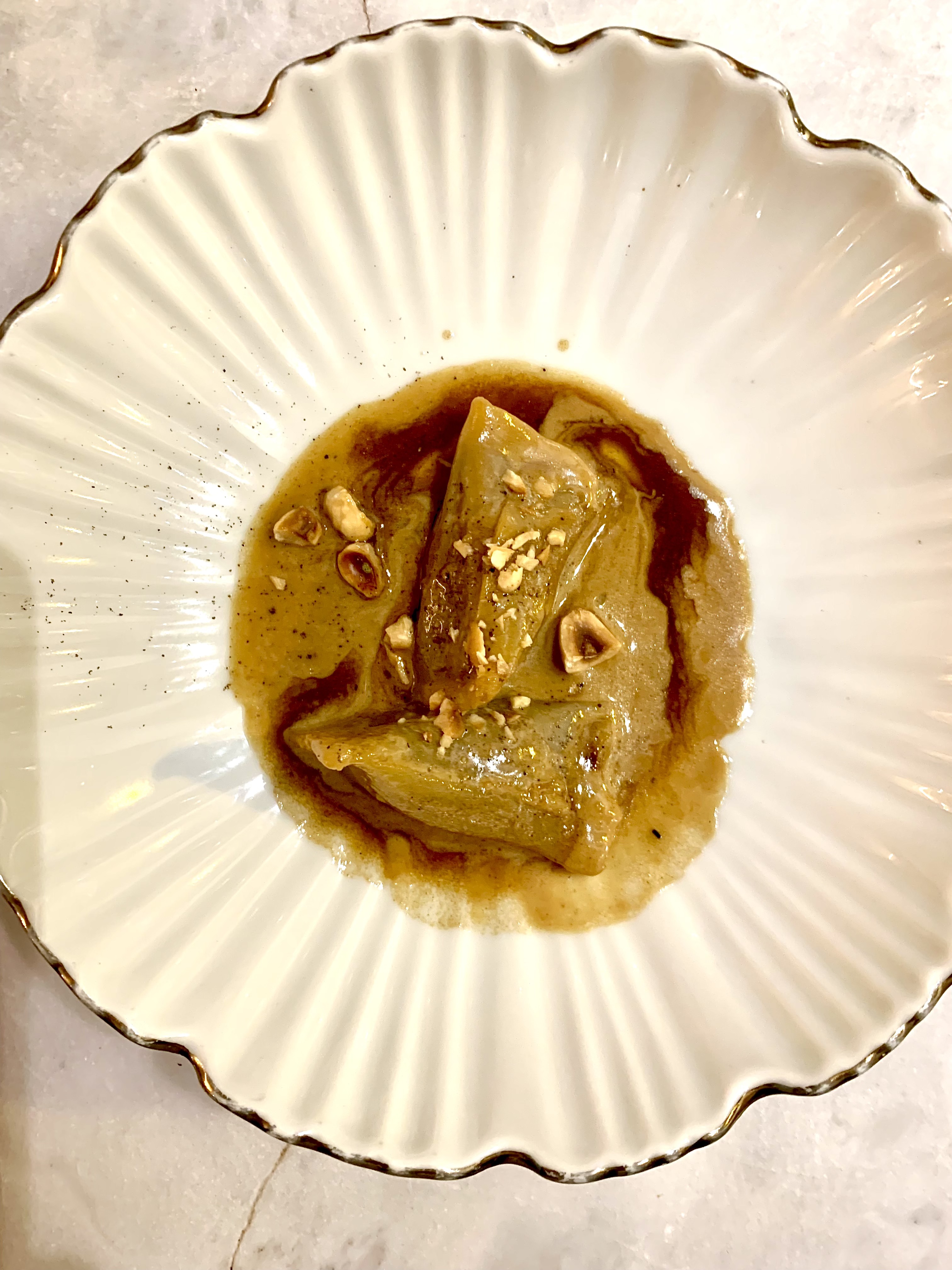 Les premiers cèpes en raviole (plat en plus testé pour le nouveau menu automne) n’est autre qu’un éclat de velours et de gourmandise en bouche, un véritable bonbon bouleversant et irrévérencieux de plaisirs. Le cèpe se vibre des noisettes du Piémont, la crème est une soie de délectation, enrobée d’une fine pâte, qui est elle même enveloppée d’un puissant jus de viande à la saveur enivrante de garrigue. Un moment à table sans parole où les anges passent….