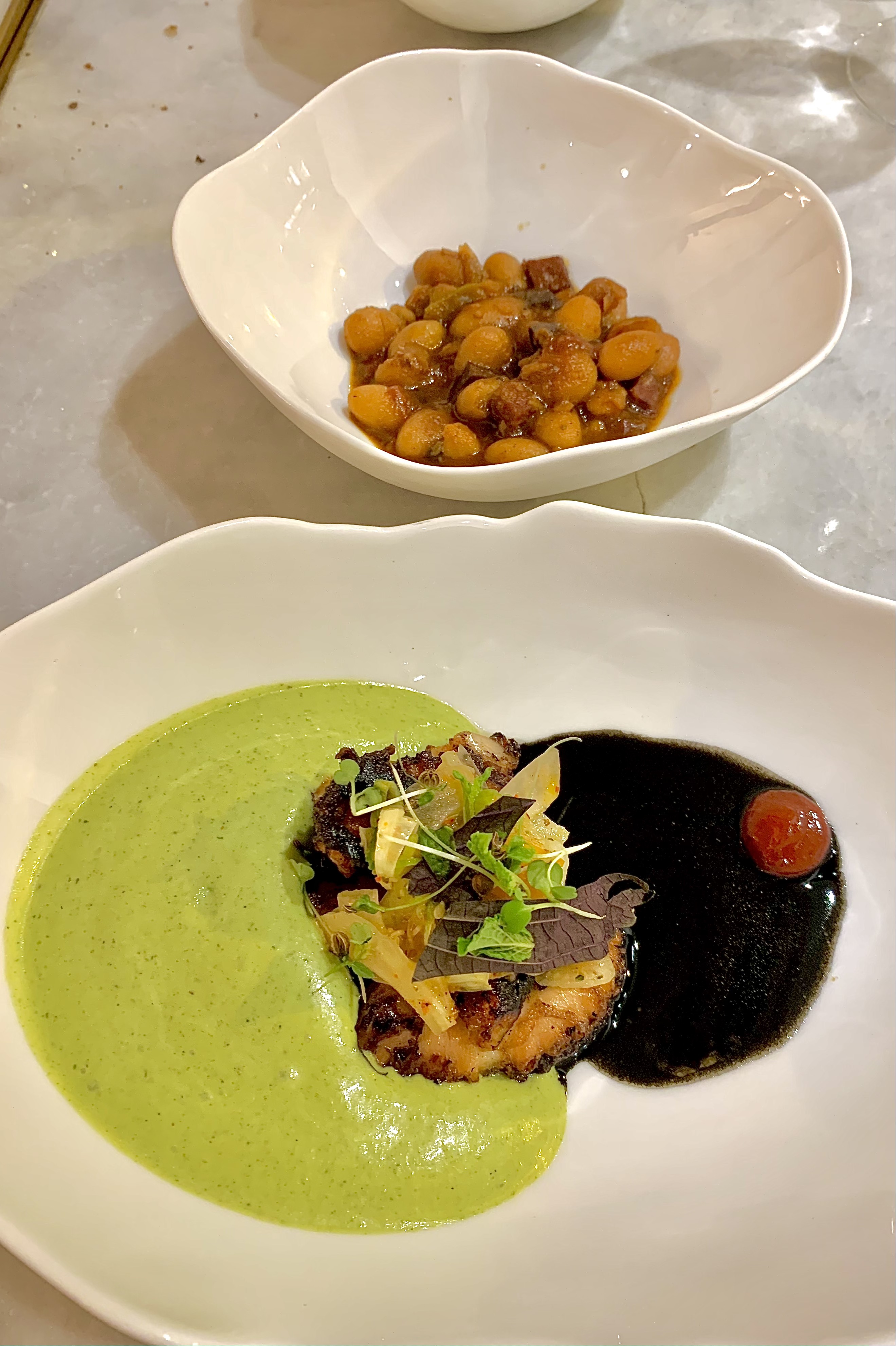 20 000 lieues sous les mers, poulpe grillé, jus à l’encre, nuage d’herbes folles, & haricots coco une assiette exploratrice qui vous emmène au delà des 20000 lieues, entre l’Inde et la Réunion. Le croustillant poulpe, d’une belle cuisson, se déguste avec passion de son encre marine intense. La sauce verte est tel un condiment raffiné aux saveurs indiennes, à la fraîcheur de la menthe, de la coriandre rehaussée de curry et de piment en finesse. Les haricots coco, travaillés en ragoût à la saucisse fumée, vous rappellent les Rougails saucisses dégustés sur l’intense Île de La Réunion.
