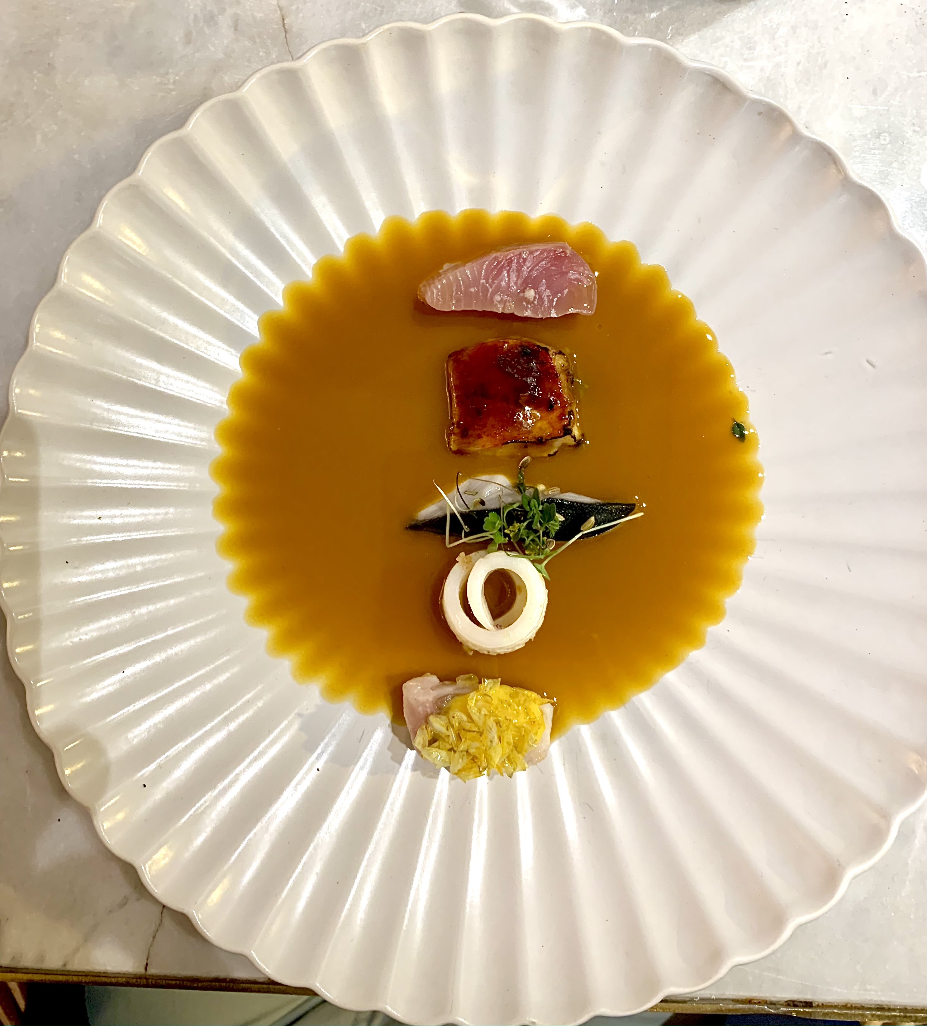 La Méditerranée : bouillabaisse d’un hyérois qui aime bien Marseille mais vit à Nice : une véritable palette de cinq poissons péchés avec passion et douceur dans la grande bleue. La Liche est nature d’un sashimi, le Rouget se fait Japon, grillé à la flamme sauce teriyaki, le Maquereau est un vrai marseillais et se boit de fleurs d’anis, le calamars est snacké de peur et la Daurade se pare de ses écailles soufflées et d’une rouille de vérité. La soupe est telle une sauce, un jus fin et anisé, qui épaule et laisse toute liberté aux poissons de s’exprimer en identité.