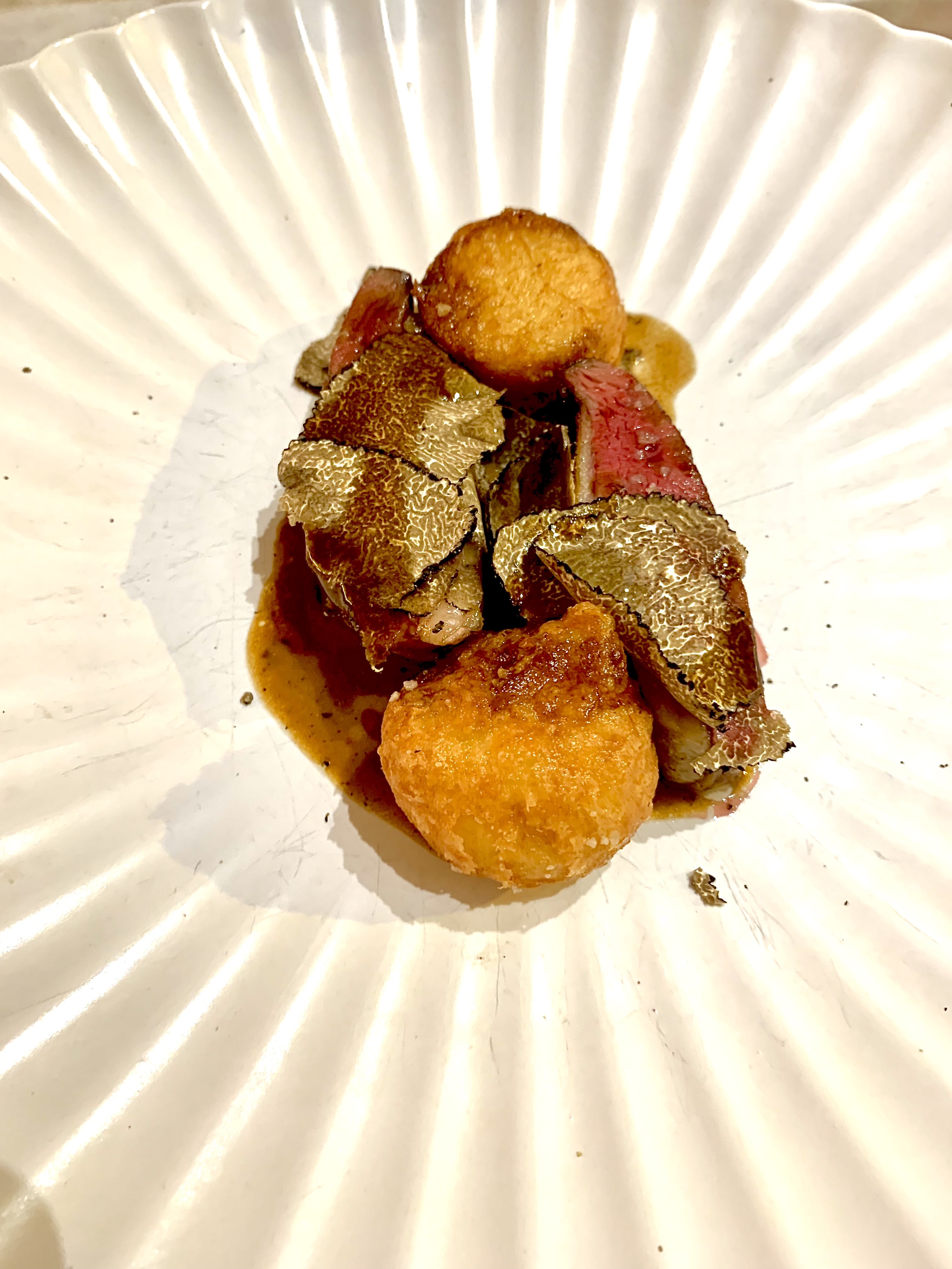Pigeon, Sauce au poivre, voile de Picanha & pommes dauphine, le pigeon, rôti sur coffre s’enveloppe d’une sublime sauce au poivre des steaks d’autrefois, la cuisson est plus que maîtrisée, entre finesse et moelleux. La truffe d’été est tel un tulle de récompense. Les pommes de terre dauphines crousti-fondantes rappellent tant les dimanches midi en famille. Dans une idée de zéro-déchet, les abats sont servis en brochette et se piquent d’une identité Yakitori parfaite.