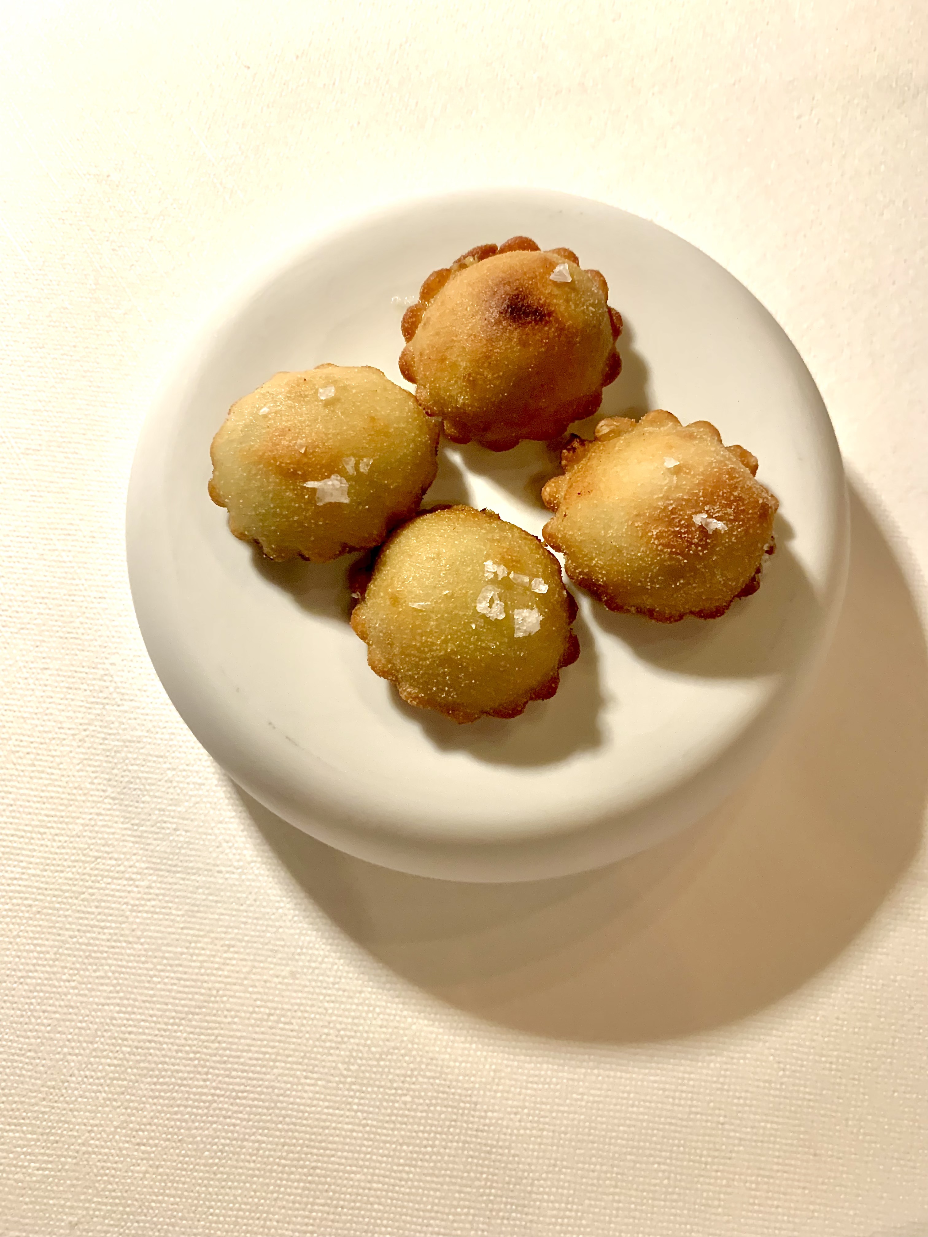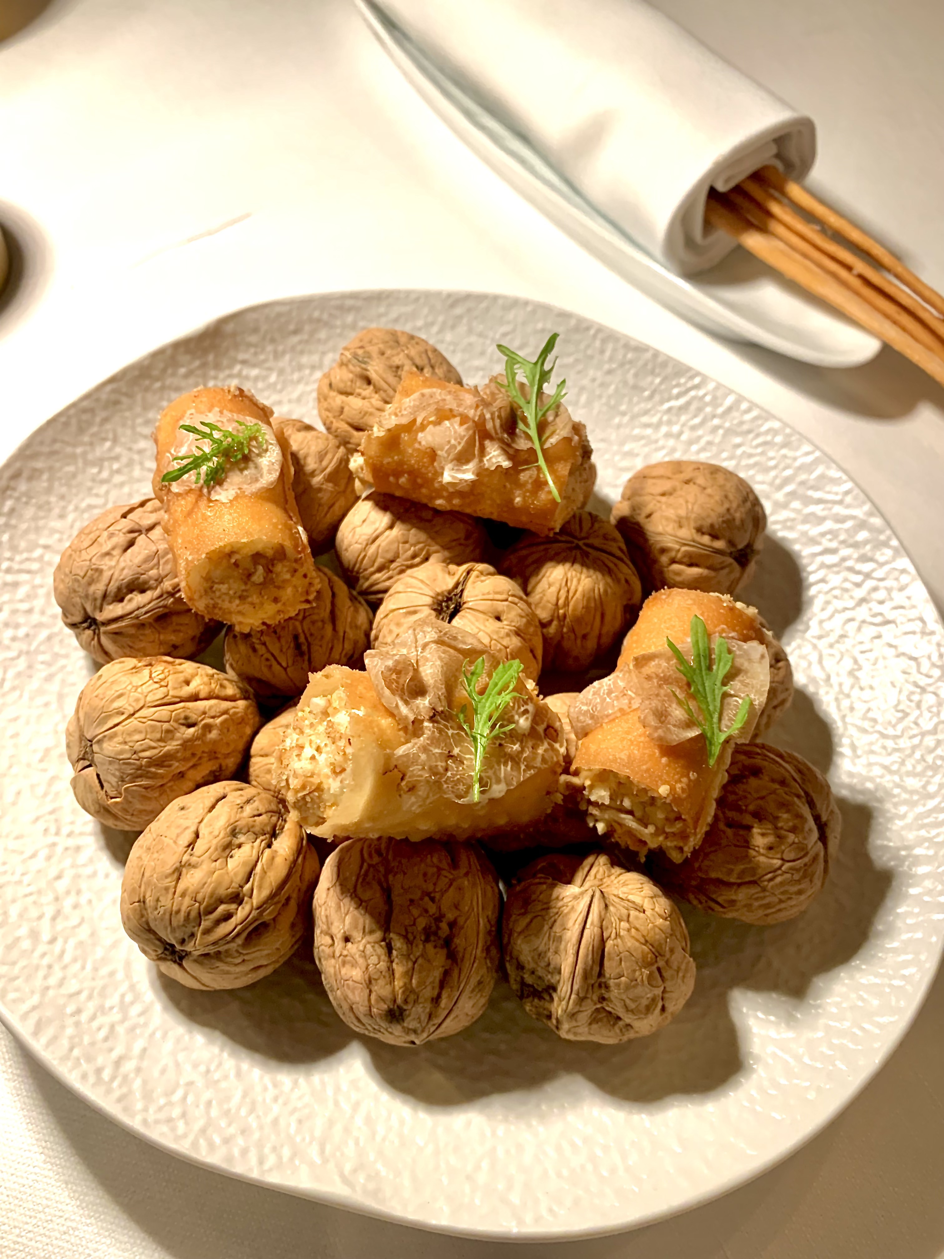 Les Cannoli crème de truffe blanche et noisettes, feuille de moutarde : ces petits cylindres, emblème de la pâtisserie sicilienne, se dégustent ici en version salée, en une bouchée furtive et délicate. La très fine pâte frite se croustille en mille-feuille et laisse la farce noisettes-truffe blanche s’exprimer dans toute sa vérité suave et enivrante. La feuille de moutarde ravive avec subtilité le tout.