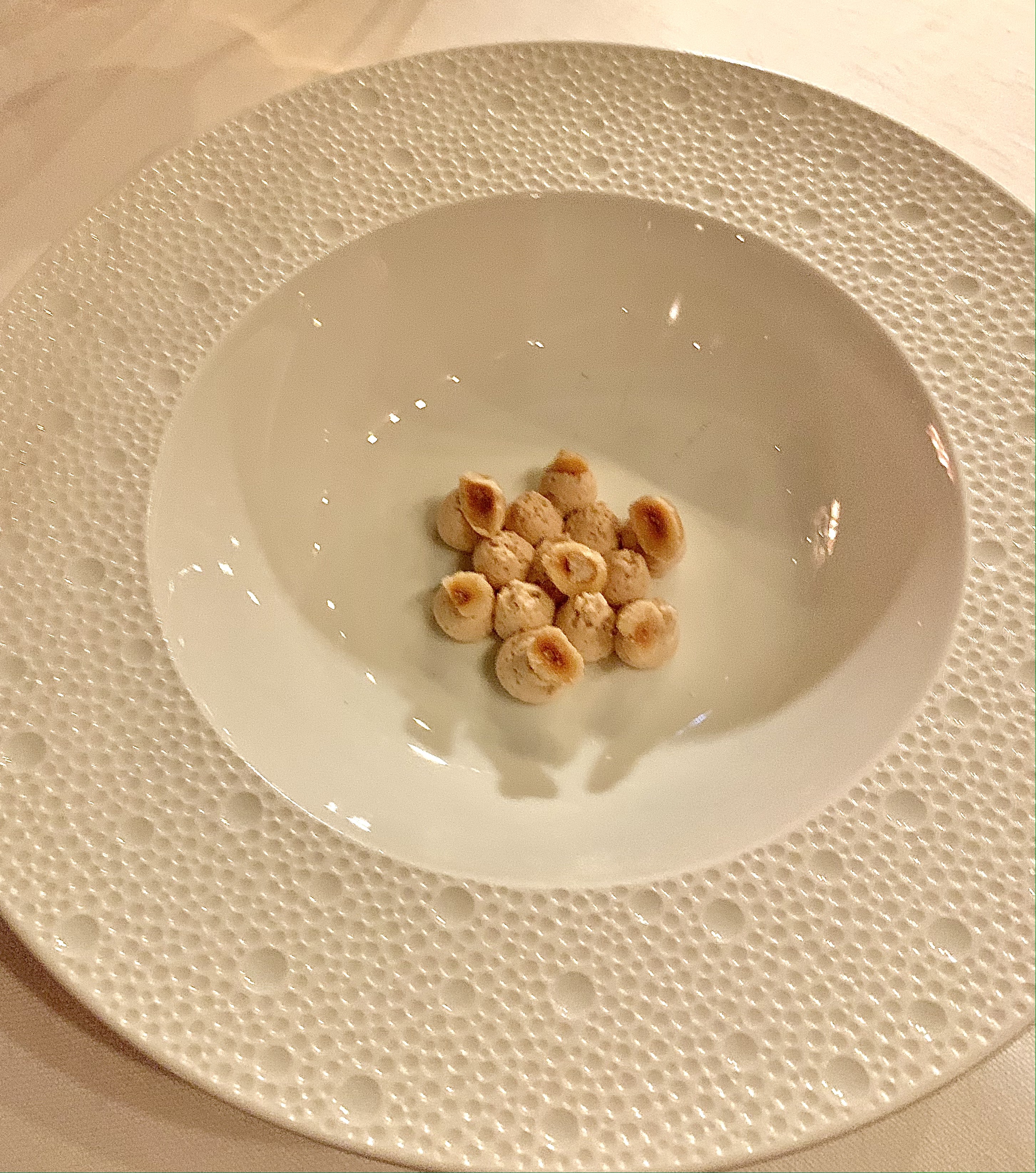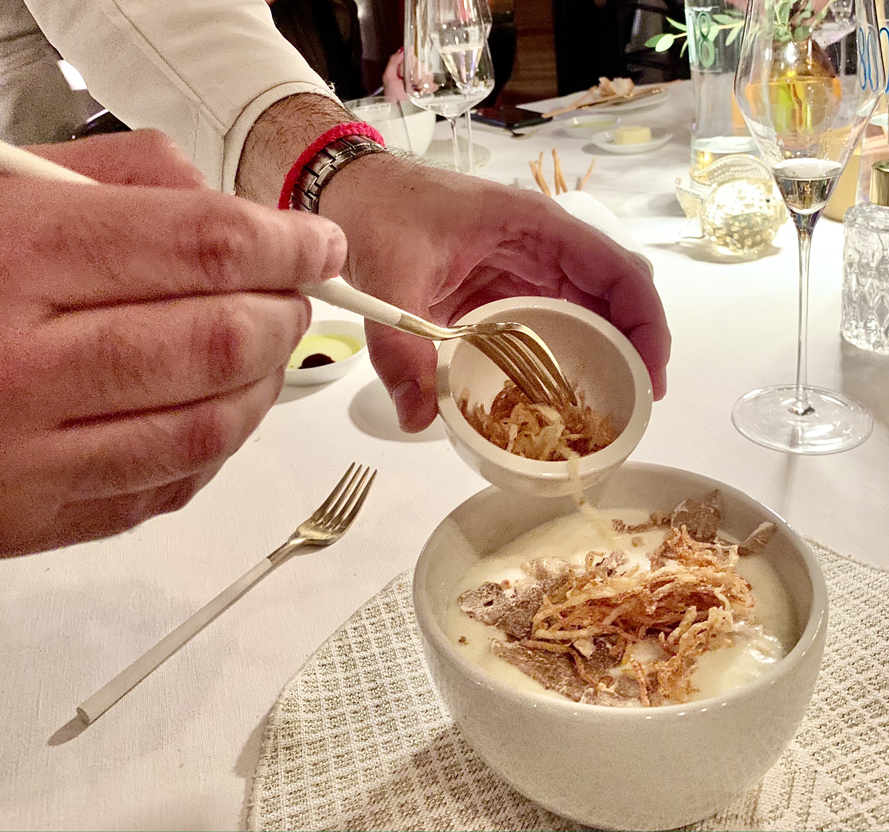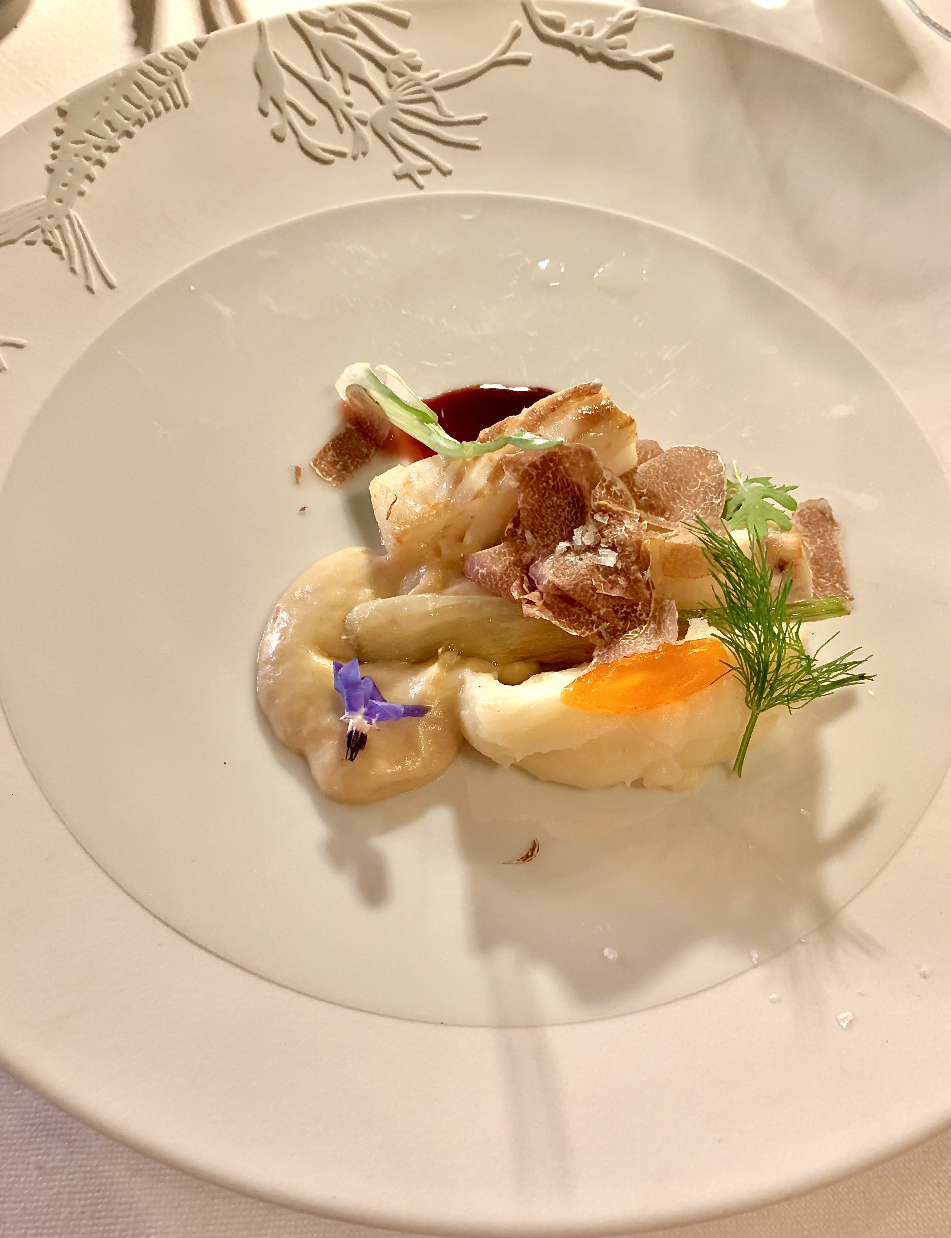 L’UOVO : l’Œuf cuit à basse température, pommes de terre croquantes, champignons de saison et truffe blanche : une incomparable entrée en matière, avec l’arrivée de cet oeuf en porcelaine qui s’ouvre en deux, telle une soupière, et laisse apercevoir un généreux lit de truffes blanches posées et tiédies sur une délicate mousseline ouatée de pomme de terre. Le chef vous invite alors à rajouter les croustillantes pommes allumettes, tel un condiment texturé, et à mélanger, brasser le tout, tel le traditionnel velouté des débuts de repas. Instantanément, vous êtes projeté dans votre enfance et retrouvez les gestes du souper familial en convivialité. Les parfums sont envoûtants, l’oeuf délivre toute sa générosité, les truffes et les champignons de saison se coordonnent pour apporter leurs saveurs inestimables. C’est ludique, gourmand et terriblement raffiné à la fois.