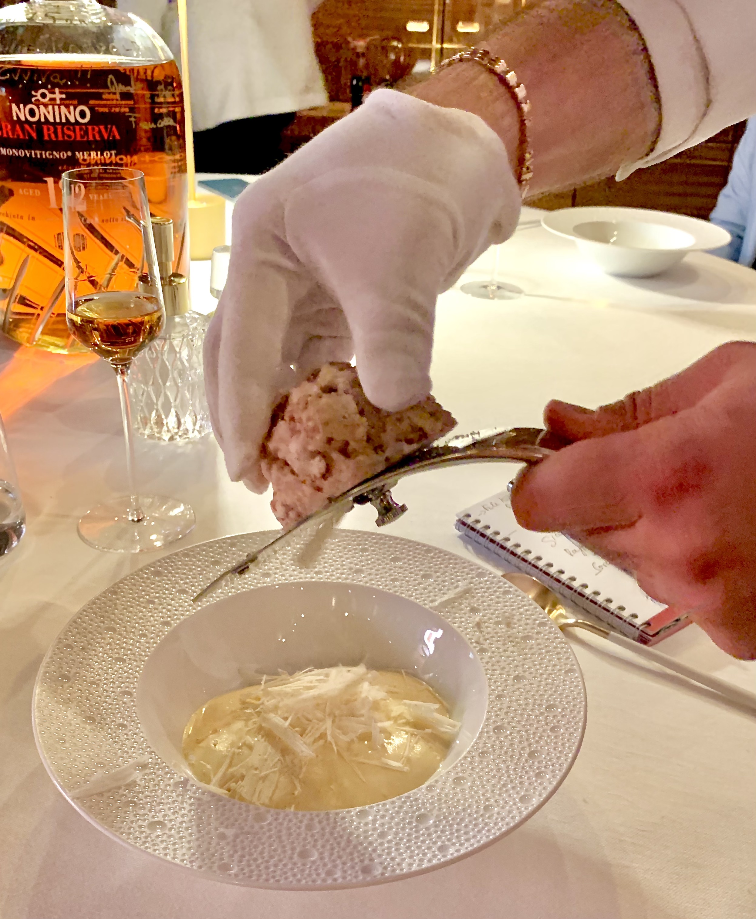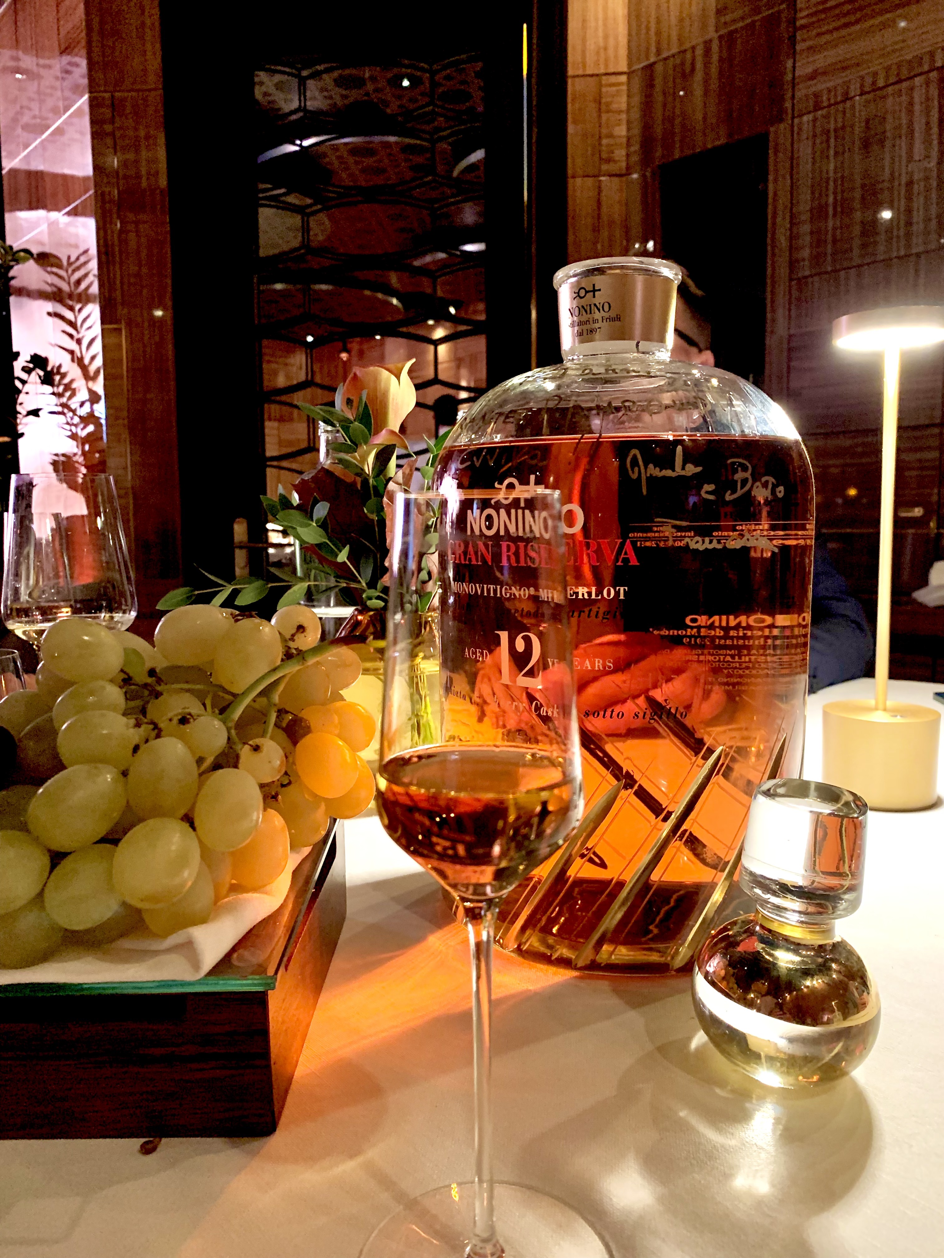 Puis, vient le tour d’une spectaculaire bouteille, à l’allure d’une carafe finement ciselée, qui fait de son effet et met en train la salle de par sa sympathique grandiloquence et qui présage d’un précieux breuvage : une grappa Grande Réserve mono-cépage Merlot, vieillie 12 ans dans des fûts « Sherry Cask » de Jerez de Frontera, de la maison familiale Nonino (une des plus anciennes et traditionnelles distilleries d’Italie, élue comme l’une des meilleures au monde). Nicolas Bulgheroni, l’avisé et taquin sommelier joue de son effet et sert la grappa d’or avec une pipette, tel un chimiste de Bacchus, et vous assure du parfait mariage avec le dessert.