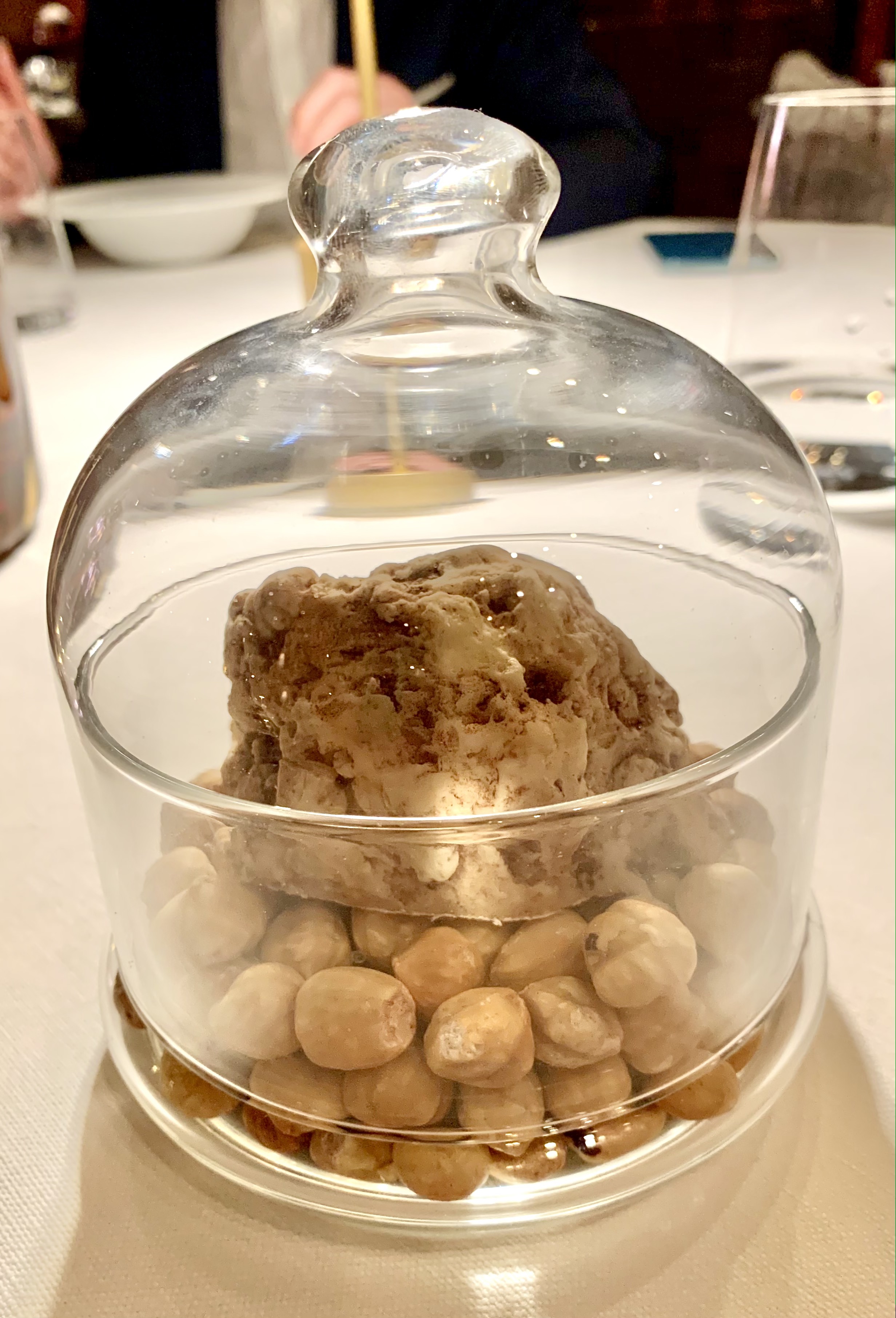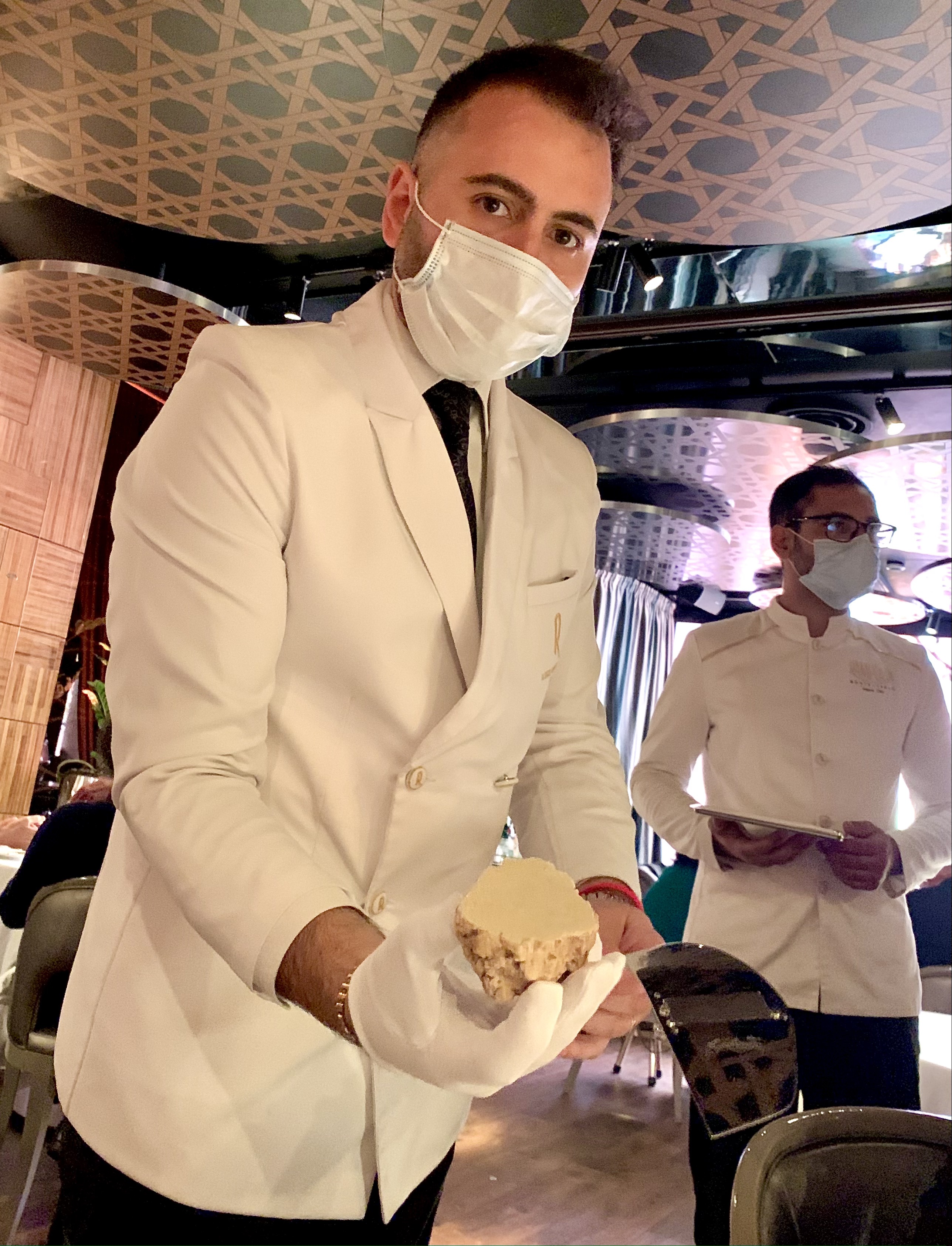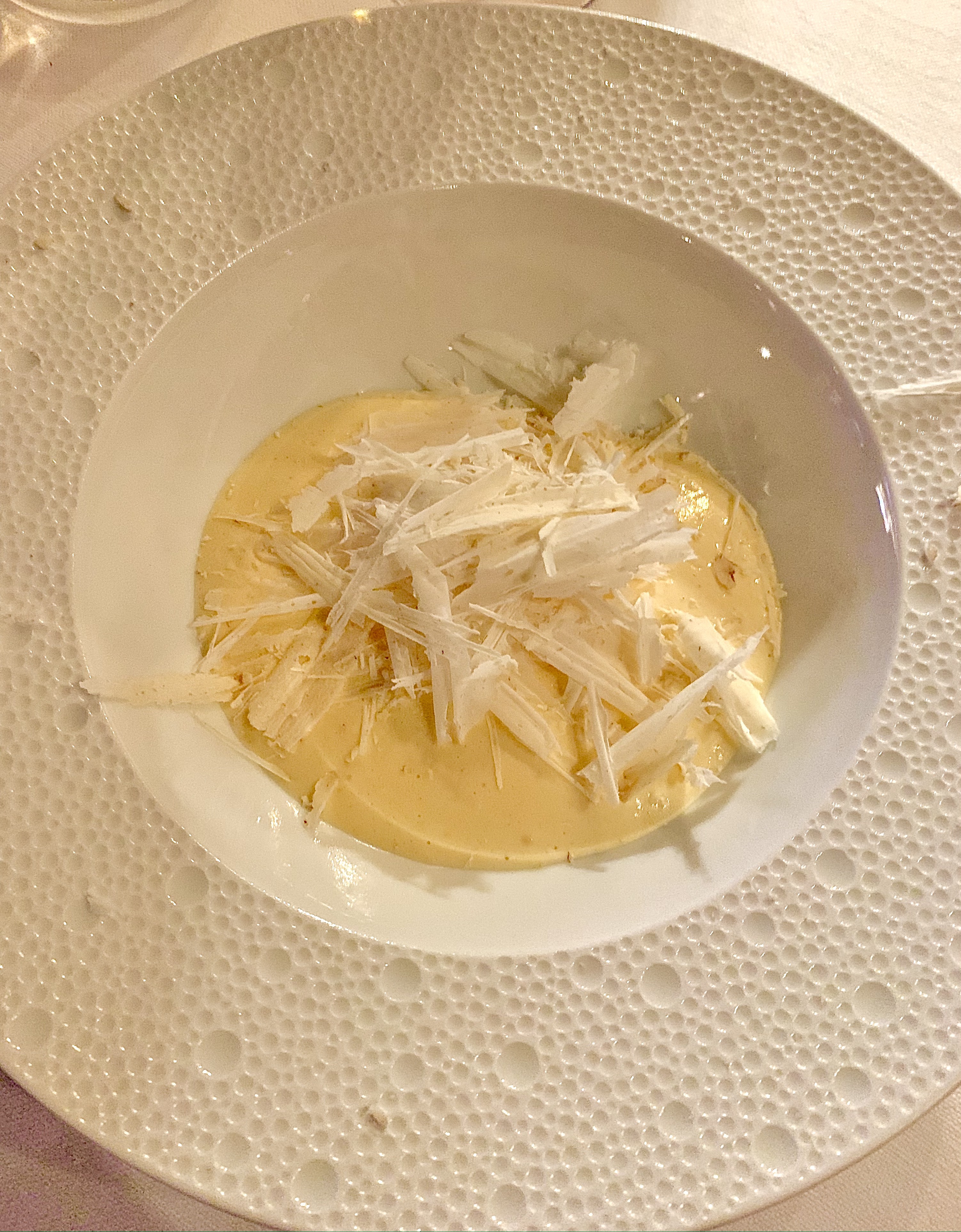 IL DESSERT «La Truffe Blanche», chocolat blanc, sabayon à l’Amaretto et truffe blanche, tout commence par une assiette dressée de noisettes entières rangées en un champ harmonieux, puis le chef apporte des fourneaux, comme autrefois, la rutilante casserole de cuivre et sert avec cadence un onctueux sabayon à la douceur grisante et délicate de l’amaretto. La truffe blanche vient pulser ce pertinent nectar avec ingéniosité. Le clou de cette représentation gourmande est la truffe, sous cloche transparente, qui se râpe avec générosité directement sur le dessert : une rocaille en chocolat blanc, qui se rêve en truffe blanche, d’un parfait trompe l’oeil. Sommes-nous arrivés au Nirvana des délices ? Sommes-nous dans un état de béatitude par tant de délicatesse et de grâce à la dégustation de ce sabayon, qui vibre de toute sa tradition italienne.