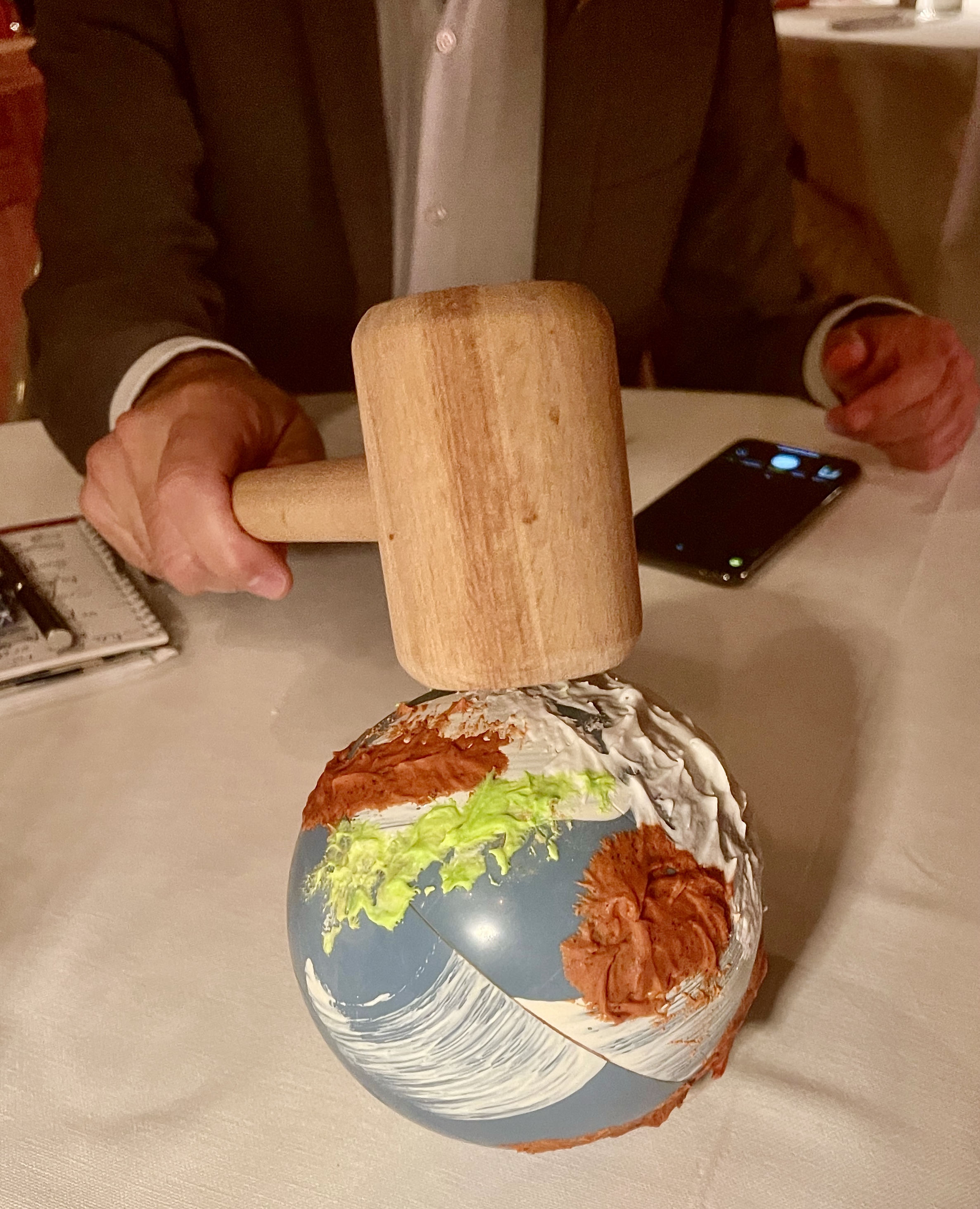 Et pour terminer cet éblouissant menu en harmonie, à vous de libérer un « monde de chocolat » et de mignardises, en cassant une sphère terrestre avec un maillet ou plutôt un marteau, tel un commissaire priseur de l’art culinaire pour adjuger avec expertise ce moment unique.