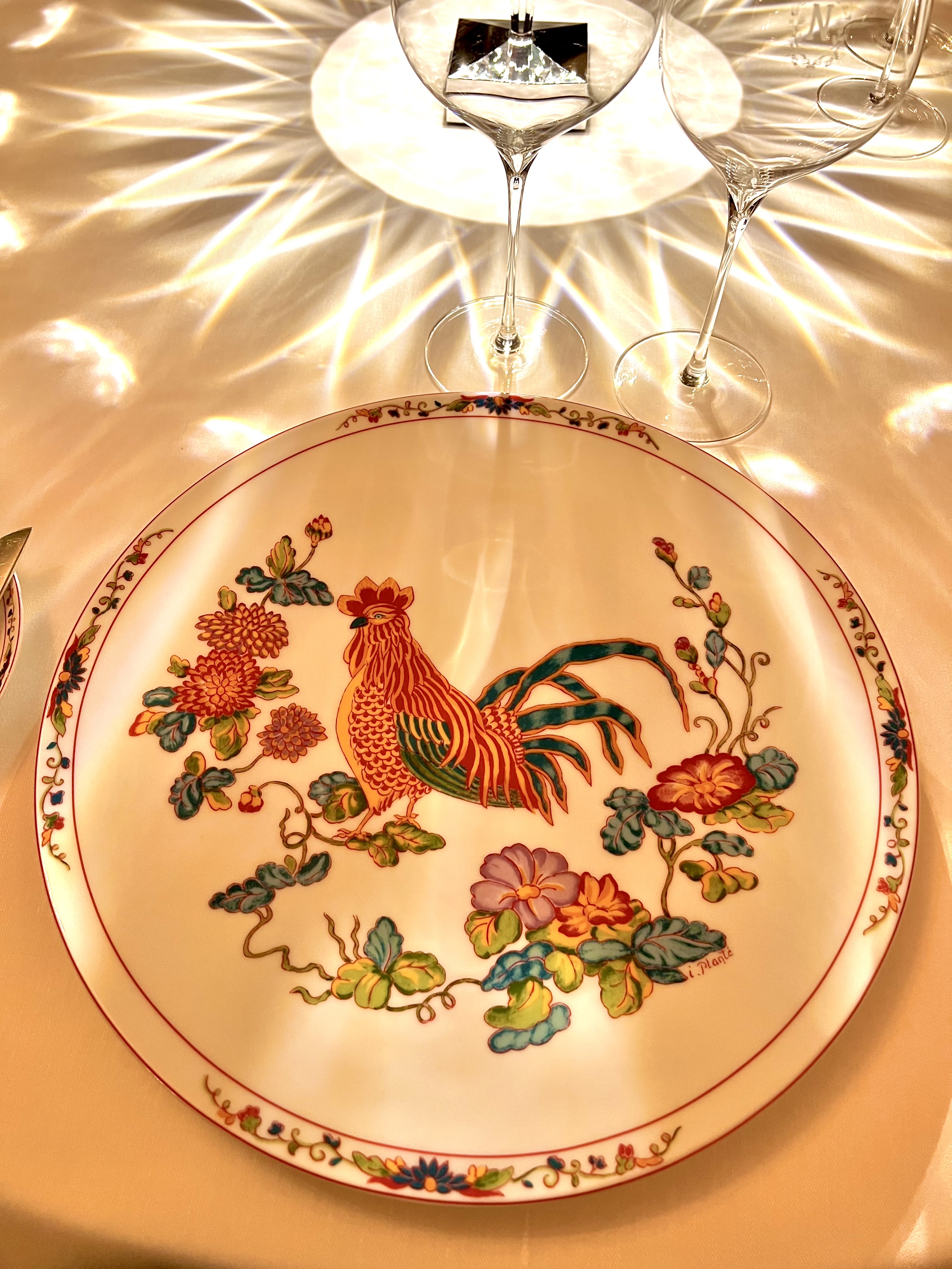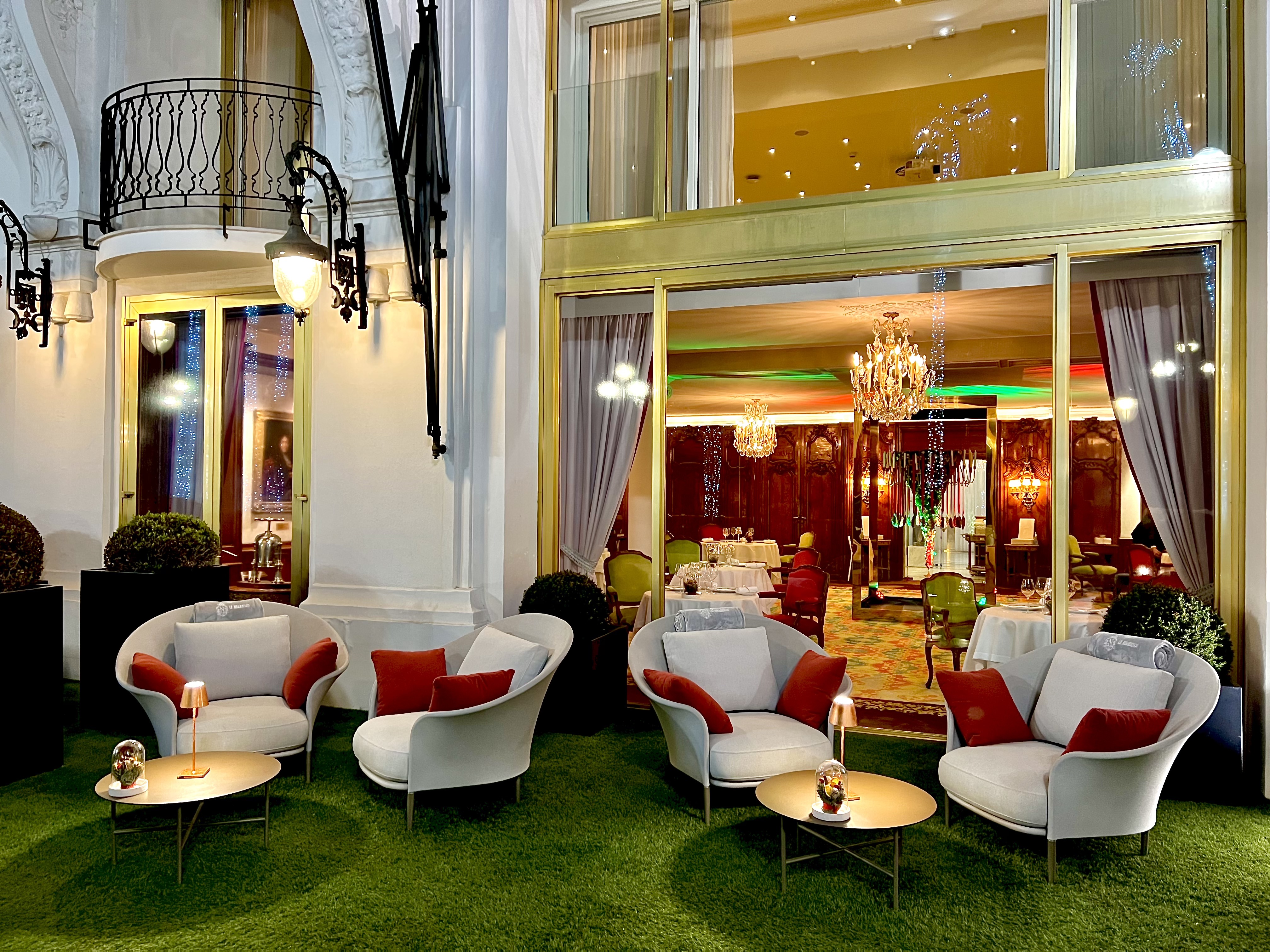 La prestigieuse salle aux boiseries datant de 1751 et aux portraits XVIIIe qui a accueilli, depuis plus de 40 ans, gourmets, gastronomes connus et inconnus, grands de ce monde et têtes couronnées, stars et artistes…. aurait tant de choses à raconter et pourrait vivre ainsi dans le passé et tourner le dos à l’avenir… si ce n’était pour l’arrivée de la chef, d’un nouveau directeur (Lionel Servant) et d’une équipe jeune et enthousiaste. Ensemble, ils font évoluer avec respect, la tradition dans la modernité. Cette année, la salle a été sublimée par des jeux de lumière contemporains, les nappes roses, ne sont plus, et sont remplacées par du linge immaculé de blanc qui met en avant les arts de la table, créées sur mesure par Elisabeth Monroy pour Safran créations. L’assiette de présentation du coq, signée de l’artiste peintre et amie de Madame, Isabelle Planté (qui a également signée le portrait de Madame « La Dame à l’Oeillet ») y ressort de toute sa splendeur. L’oeuvre d’Art floral du fleuriste et MOF Hervé Freyzal est tel un cadre cadençant les saisons. La flamboyante moquette est immuable du leg de Madame. La nouvelle terrasse en front de la Promenade des Anglais, au mobilier tendance et ouaté, est une bulle de glamour, chic et hors du temps, où il est si bon de déguster un cocktail pour un parfait prélude aux plaisirs gourmands. L’emblématique entrée principale à la marquise rouge et or du rutilant Chantecler reprend sa fonction, d’accueillir les clients en grandeur.