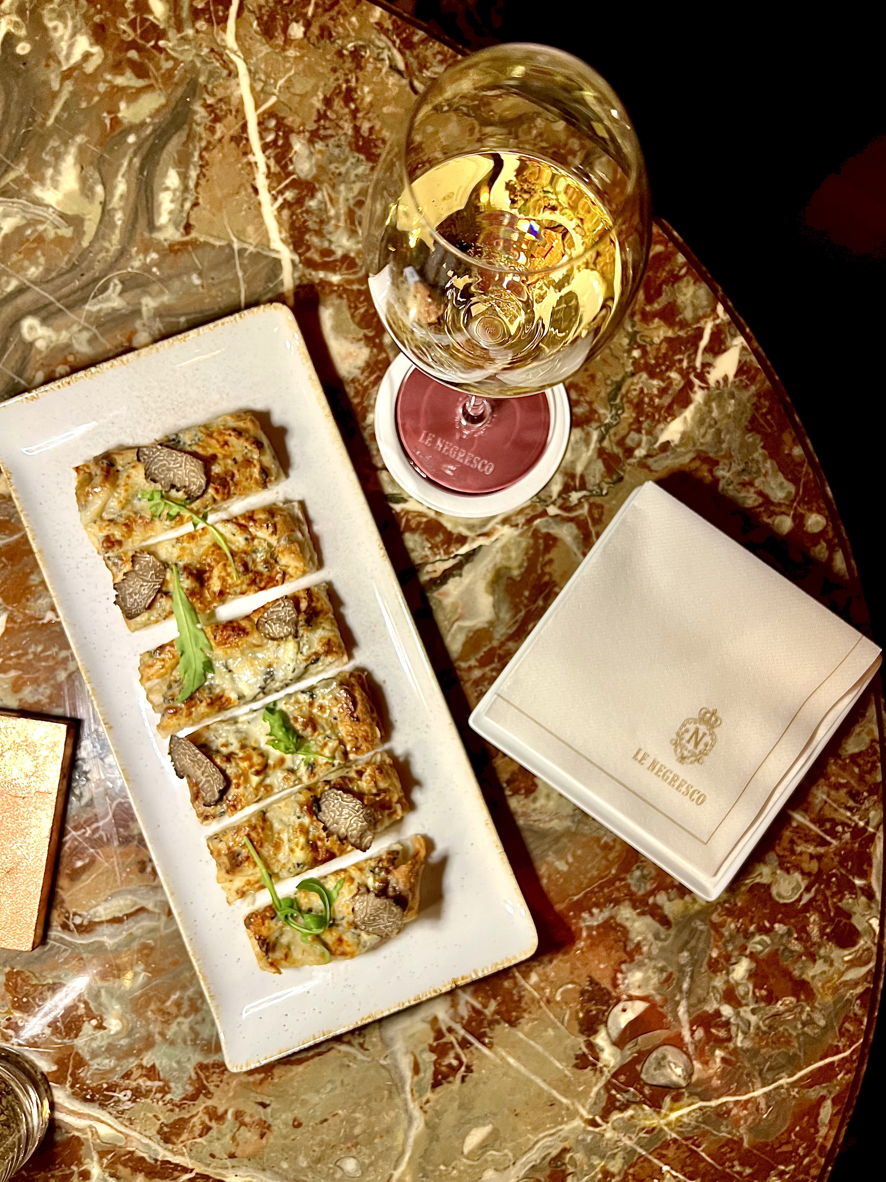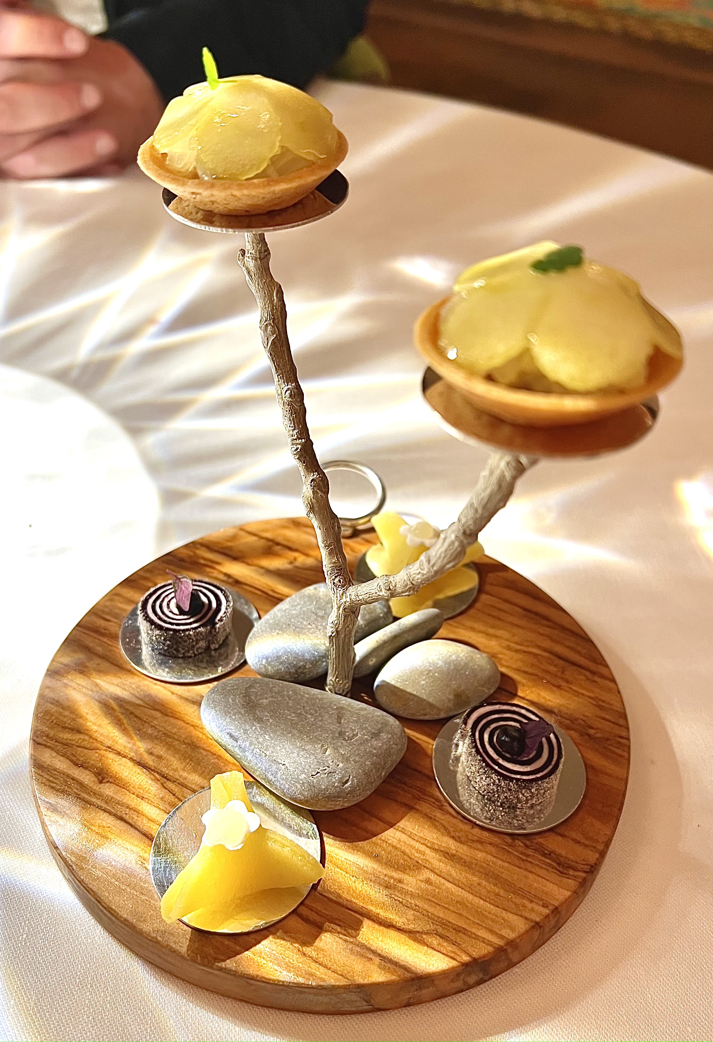 Tout commence par des mises en bouche présentées, tels des joyaux à l’accent nissart, sur un support en bois d’olivier et posés en élégance sur une branche d’olivier en argent entourée de quelques galets de la Baie des Anges, si proche, pour un parfait écho. La socca se fait crispy d’une tuile et s’enveloppe d’une crème de pois-chiche. La pissaladière se structure en bouche au fur et à mesure, elle est anchois, puis oignons, et pâte fine et devient promptement, elle-même à part entière en bouche. Le cromesquis de cèpes est une bouchée, qui éclate de terroir et de sous-bois de l’arrière pays. Le beurre normand cru est en duo : nature ou inspiré de citron et d’huile d’olive. L’excellent pain, de l’artisan boulanger des tables étoilées de la région (Jean-Paul Véziano à Antibes), servi en corbeille en porcelaine (signée de la céramiste Sylvie Lorne) posée sur la table est une douce idée des moments de partage en famille.