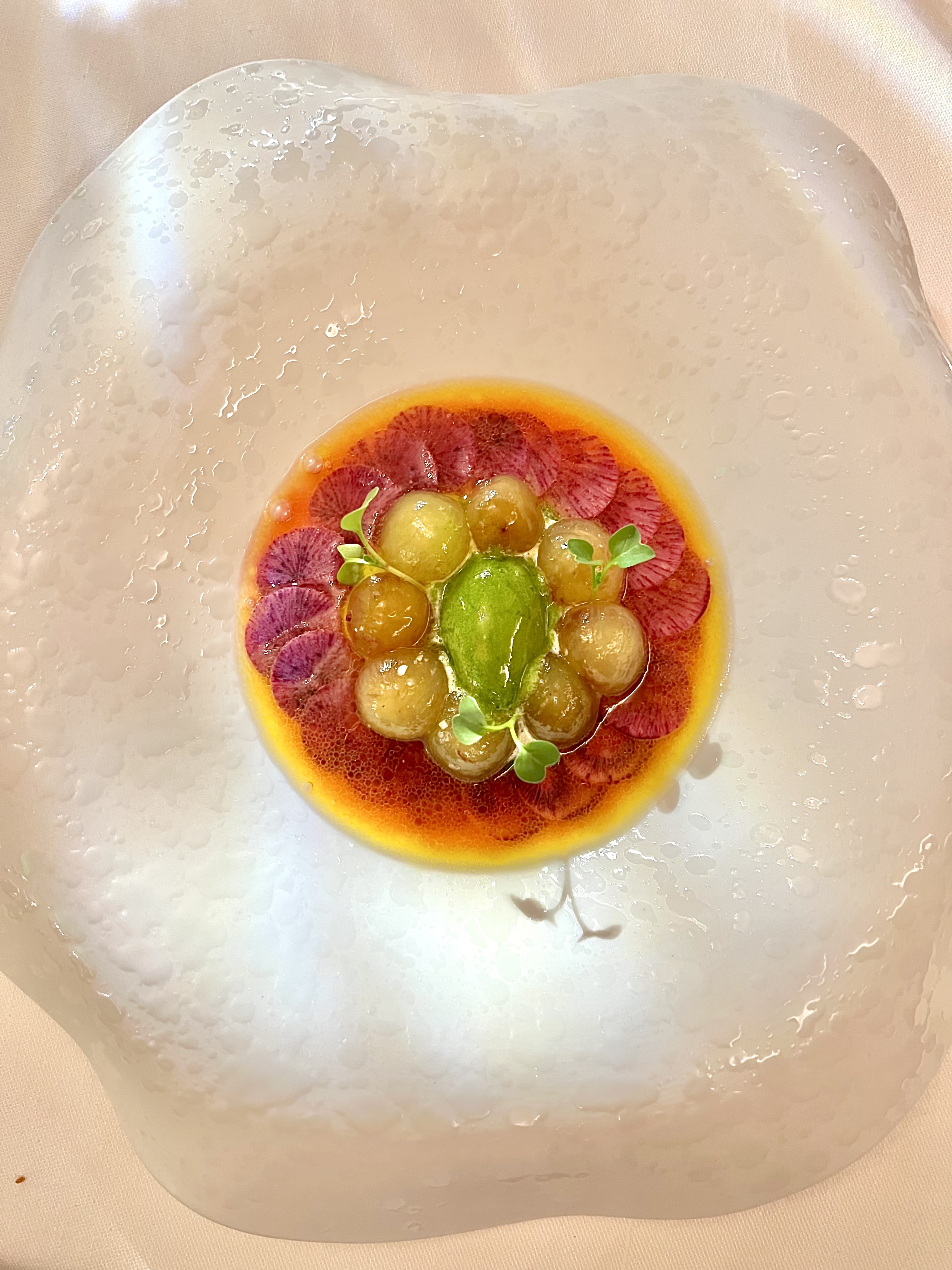 L’instant Végétal aux radis, raisin de Muscat, sorbet aux herbes : simplicité et pureté visuelle infinie d’une entrée végétale en perfection. Un jardin sublime des saveurs, qui met en appétit et nettoie le palais par une acidité pondérée, une sucrositée naturelle et harmonieuse du Muscat. Le radis « red meat » en carpaccio se croque terriblement de vie, l’huile d’olive, tel un fruit ardent, et la vinaigrette miel pulpent prodigieusement tout ce petit monde végétal. Le sorbet aux quatre herbes et agrumes (citron, citron vert, orange) charpente et accomplit le tout.