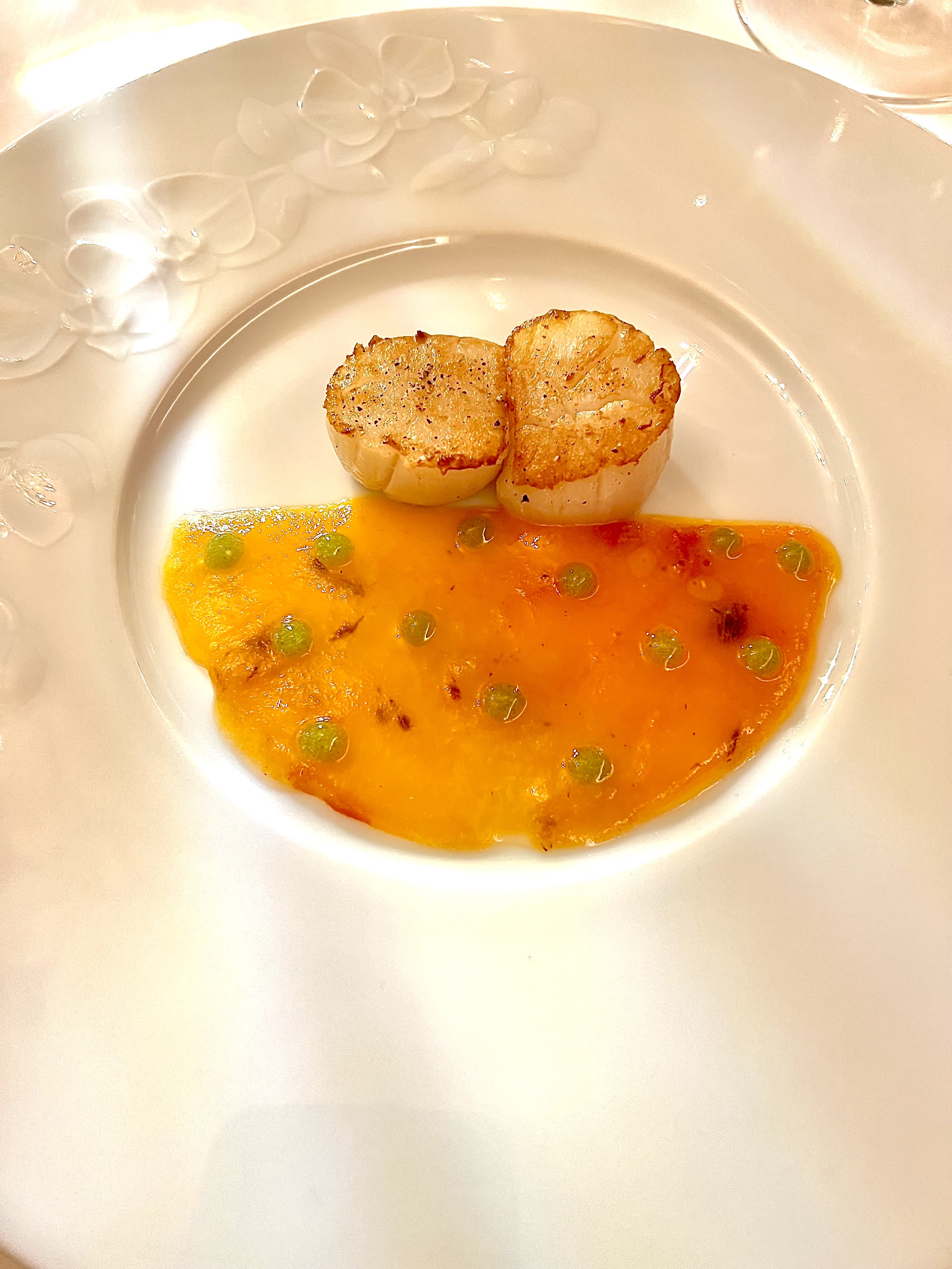 Noix de Saint-Jacques de la Baie de Seine, kakis frais de Golf-Juan et condiment estragon : travaillée comme une viande au barbecue, d’une pointe fumée en équilibre, la Saint-Jacques subjugue de par sa texture et sa saveur, entre puissance et subtilité. Le kaki en coulis apporte son paradoxe bienfaiteur, astringent et miélé à la fois, il est piqué de gel d’estragon pour un parfait accord herbacé qui précipite la Saint-Jacques dans une dimension du sublime.