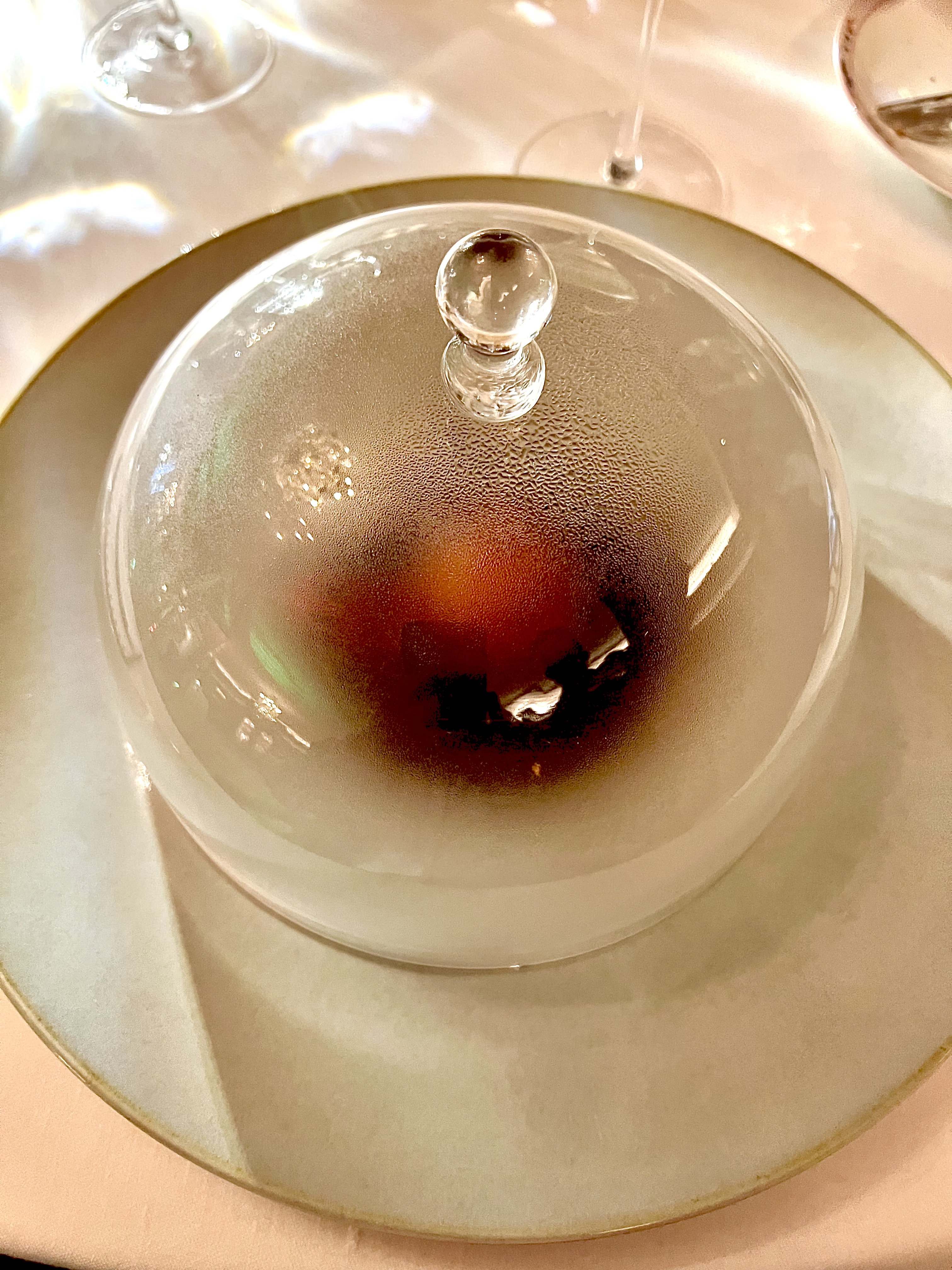 Le Kaki de Golfe-Juan au vinaigre de Sakura, croustillant et tuile de riz soufflé est le pré- dessert d’une transition en fraîcheur et un lien entre le salé, le sucré, l’amer et l’acide, et prépare le palais vers la suite. Le Kaki est un fruit atypique et rarement travaillé, il est ici associé avec le vinaigre de Sakura qui le renforce dans son identité et peut déstabiliser ou déconcerter certains palais.