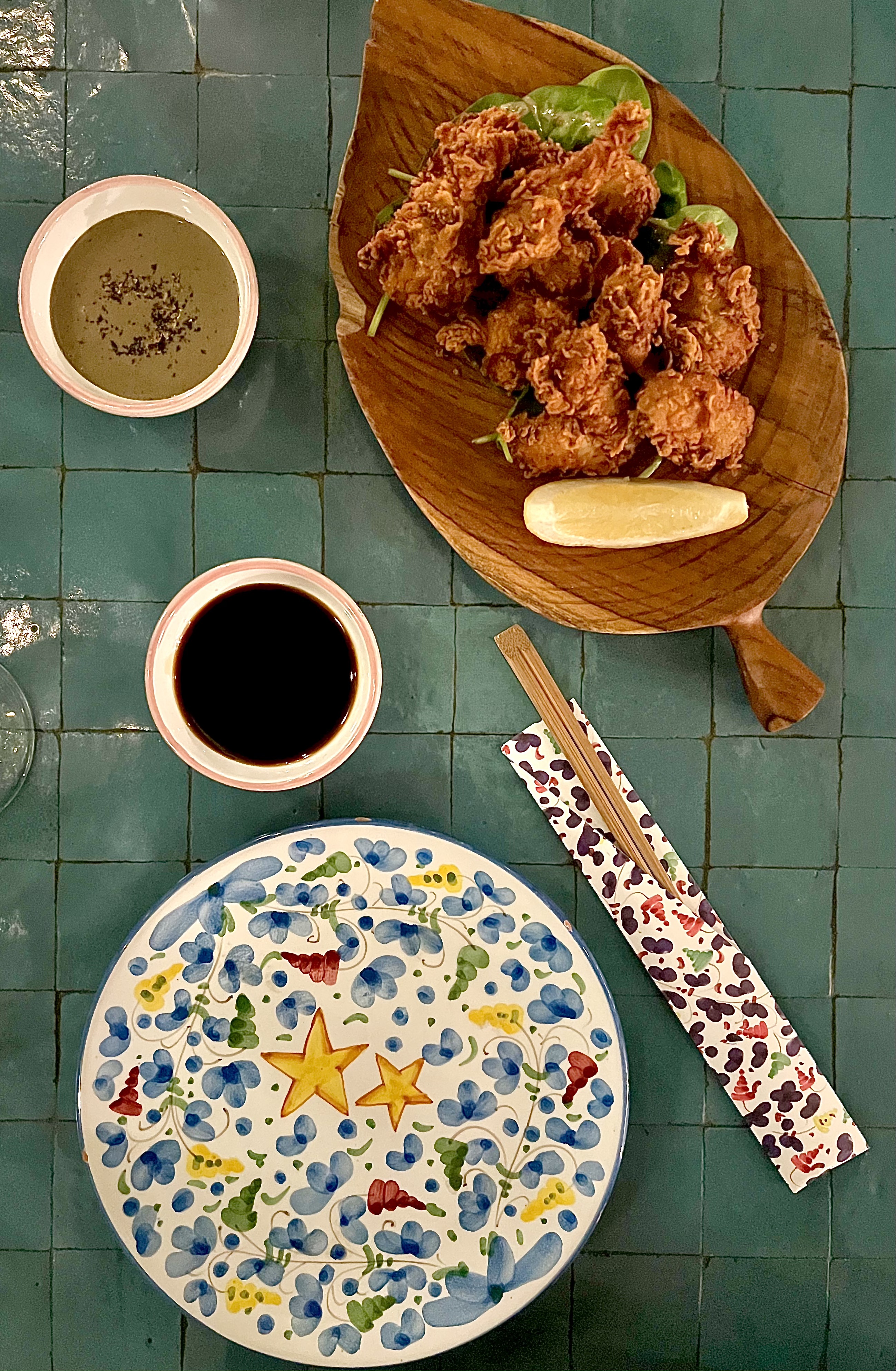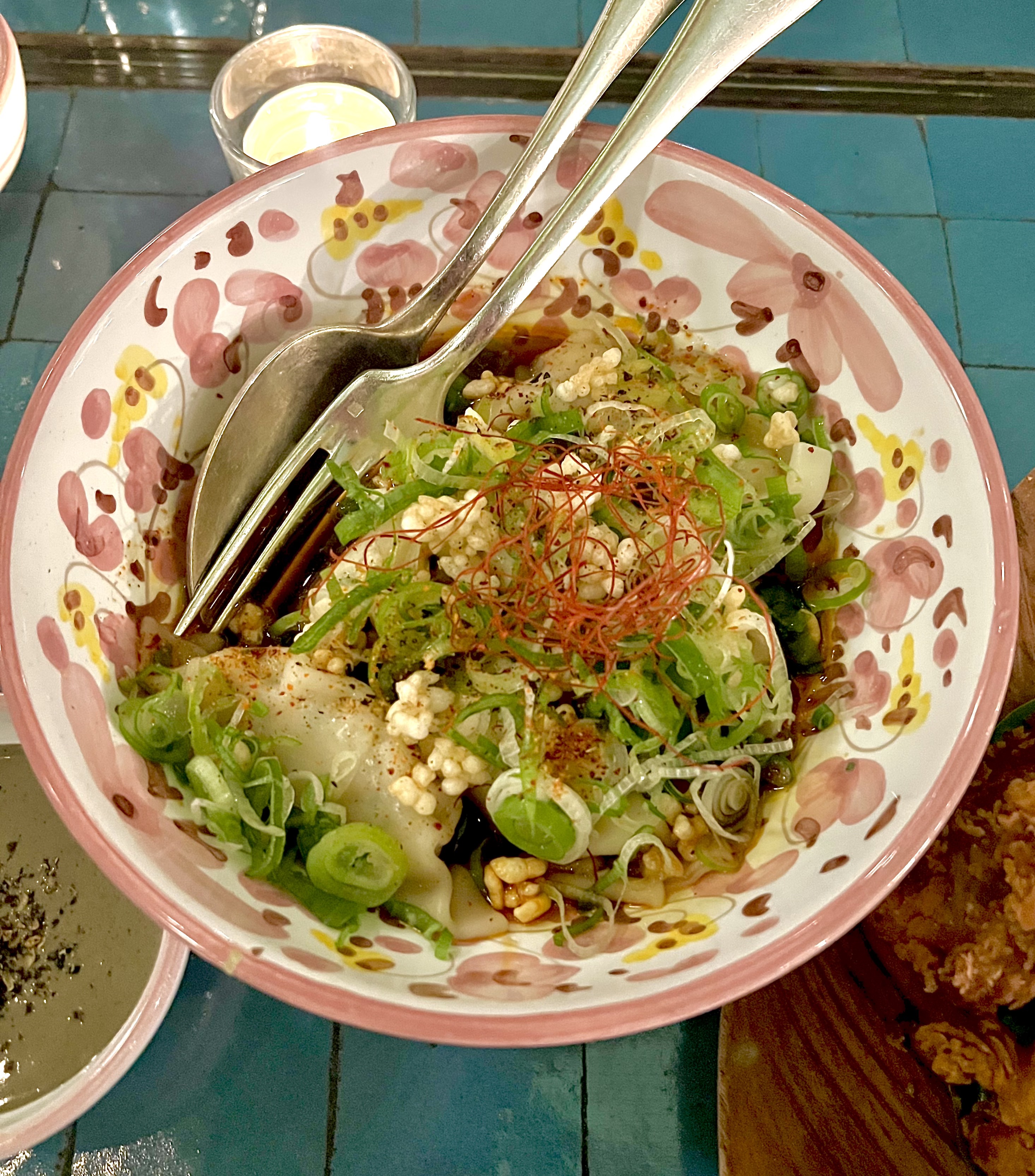 Pour commencer, le Poulet croustillant « Karaagé » est une première et excellente pioche dans les Zensaï chauds 温办心前菜, le poulet est mariné au Cinzano blanc pour garder le moelleux et arborer une identité plus latine, il est ensuite frit avec une panure à base de fécule pour le parfait croustillant. On y retrouve les très encensés et addictifs petits raviolis Gyozas : ils se dégustent en tradition grillés (parfait pour le partage) ou pochés, et se dévoilent en gourmandise herbacée d’un bouillon savoureux, le riz soufflé vient « cruncher » avec frivolité les papilles.