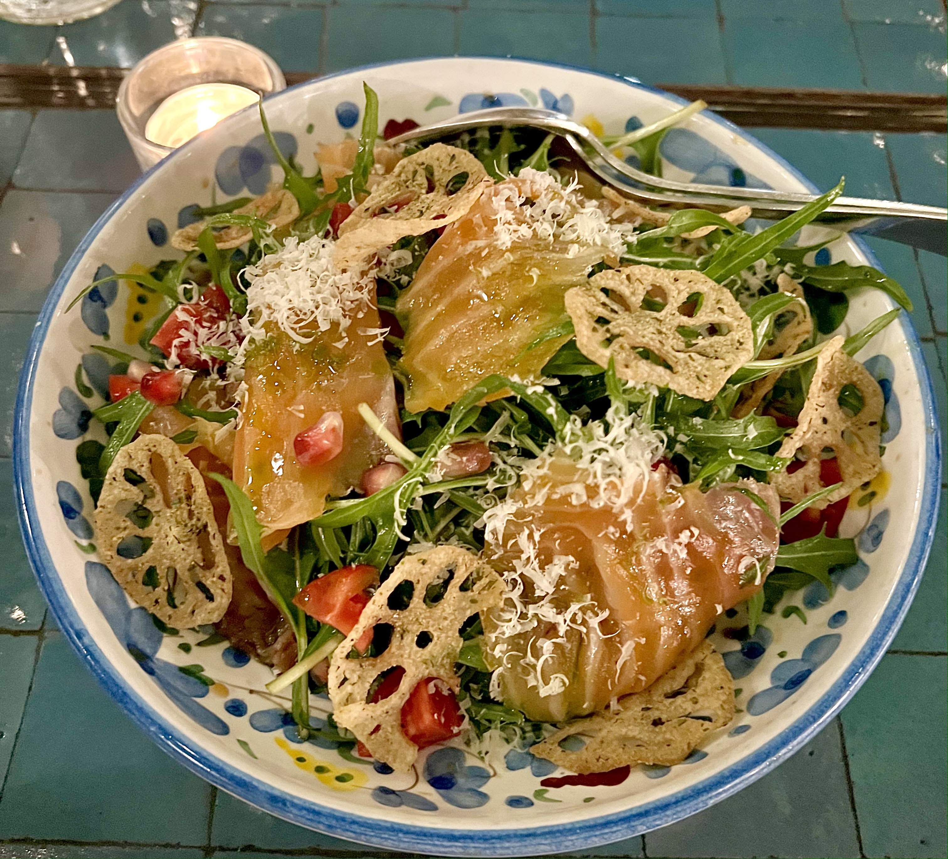 Pour les Zensaï froids 冷大心前菜 , le Mizuna (sorte de roquette, proche des feuilles de moutarde) au saumon fumé et mariné maison, se peps de grenade, la racine de lotus frit apporte l’attrayant à cette délicate salade.