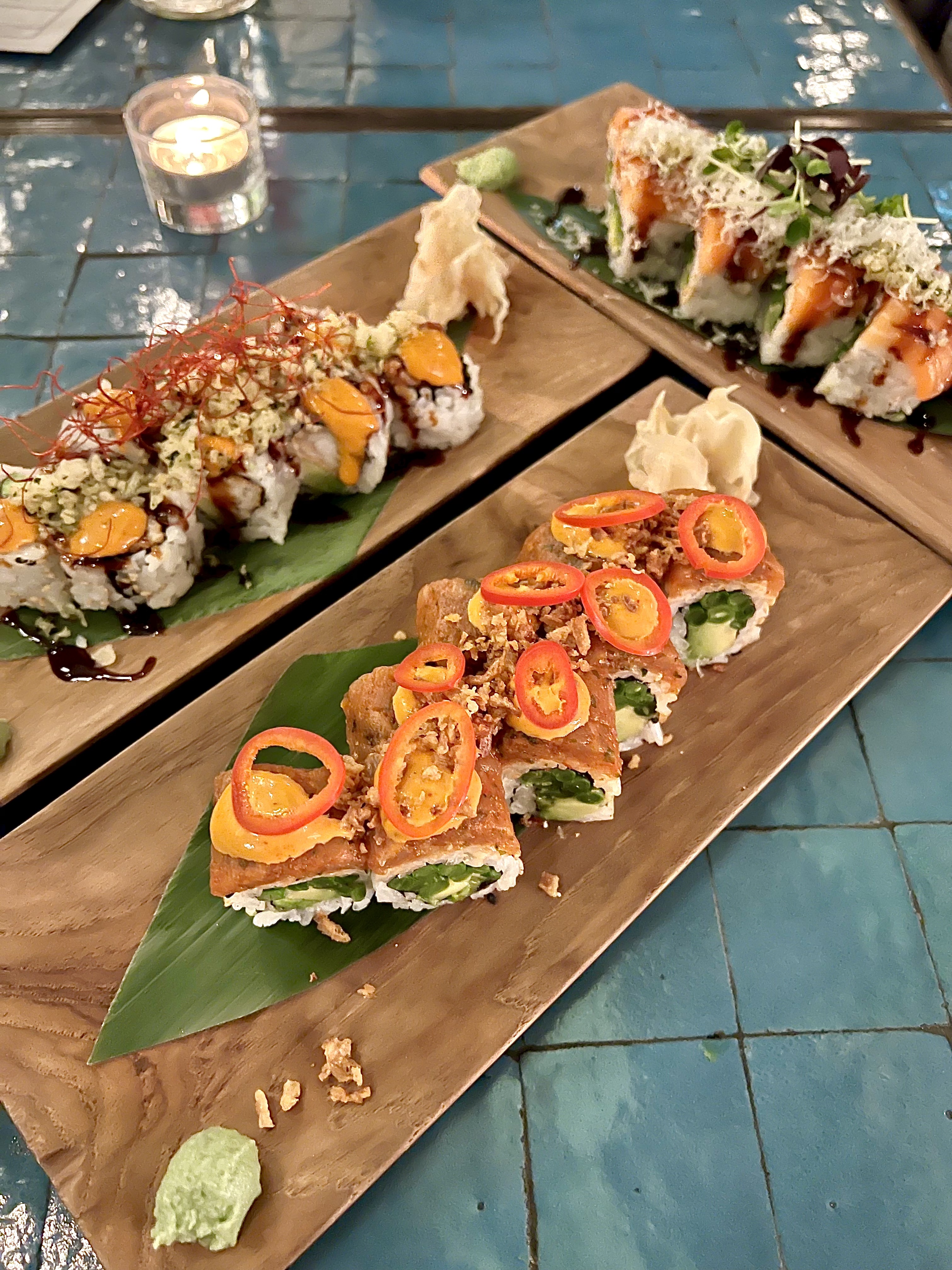 En semaine, la carte du déjeuner s’adapte aux plus pressés et les Ramen se font bar et se mangent avec passion dans une authentique sonorité « zuru-zuru» rassasiante, les Rolls, à la générosité californienne, enrôlent avec frénésie les aficionados au grand appétit, comme le Spicy Tonno (tartare de thon, haricots verts, avocat, sauce spicy), le Dolce Vita (saumon, avocat, parmesan, sauce teriyaki), l’Ebi Fry (gamberoni pânées, avocat, fromage, sauce teriyaki)…