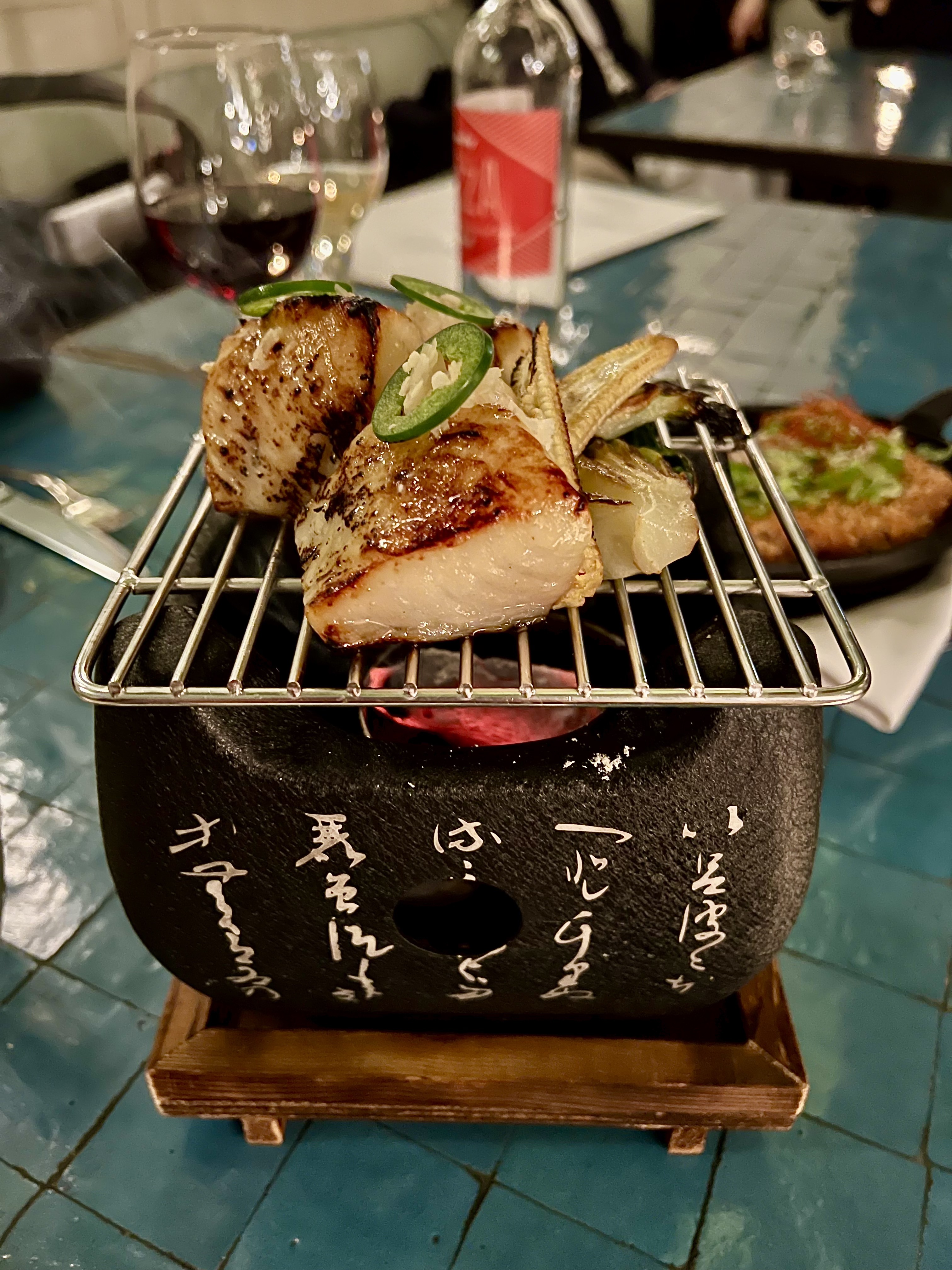 Le Black Cod sambuca et gingembre s’effeuille à la baguette, il est mariné au miso et liqueur de sambuca, puis saisi un premier temps au Robata avant d’être servi sur le bbq de table Hibachi qui maintient sa texture.