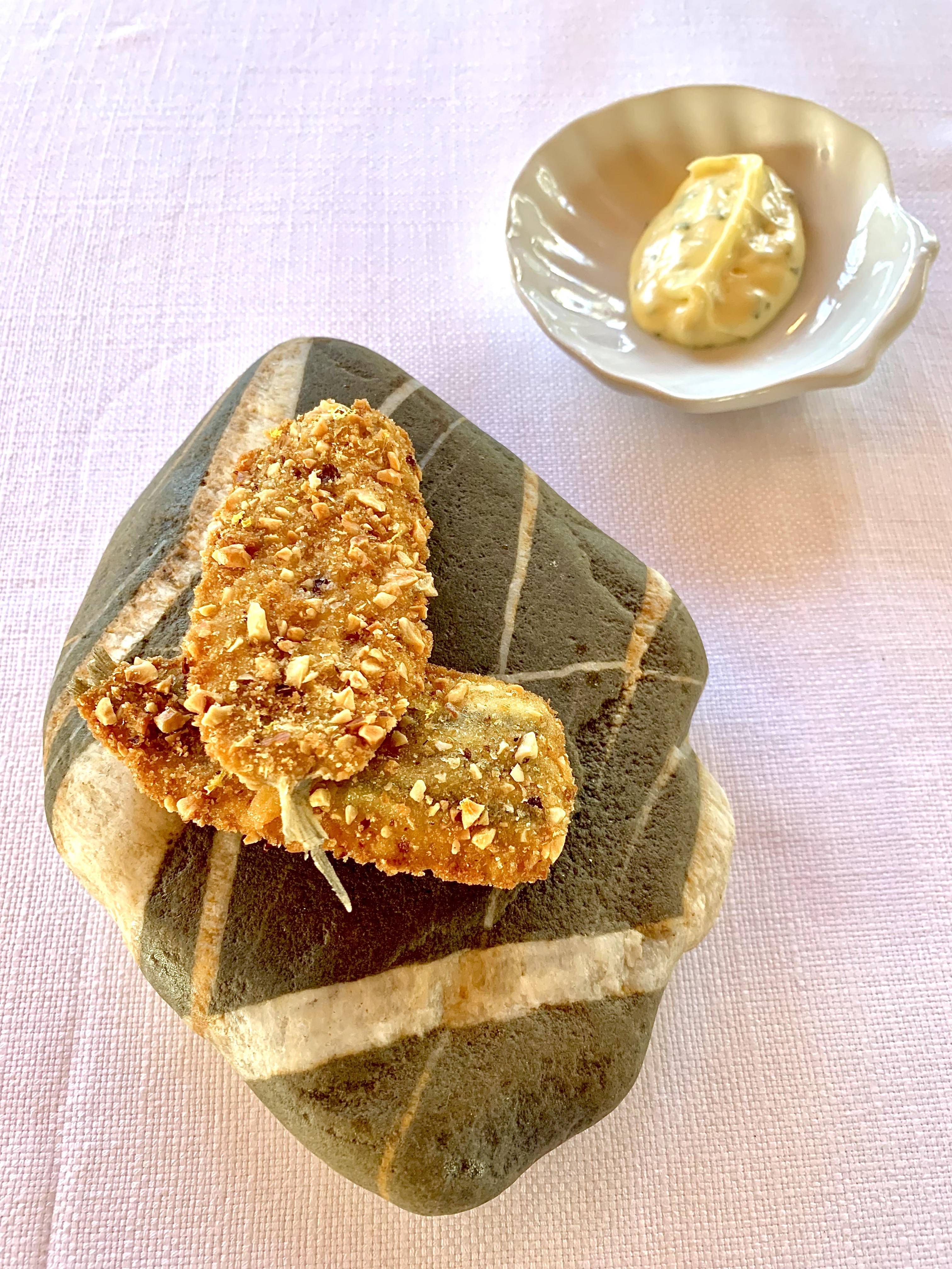 Tout commence par un amuse-bouche de la mer : Anchois frit à la noisette et agrumes, une belle entrée en matière iodée d’un anchois moelleux et croustillant de panure de noisettes, la sauce tartare à l’estragon apporte une pointe de vivacité. Le tout se déguste avec légèreté, entrain et met judicieusement en appétit.