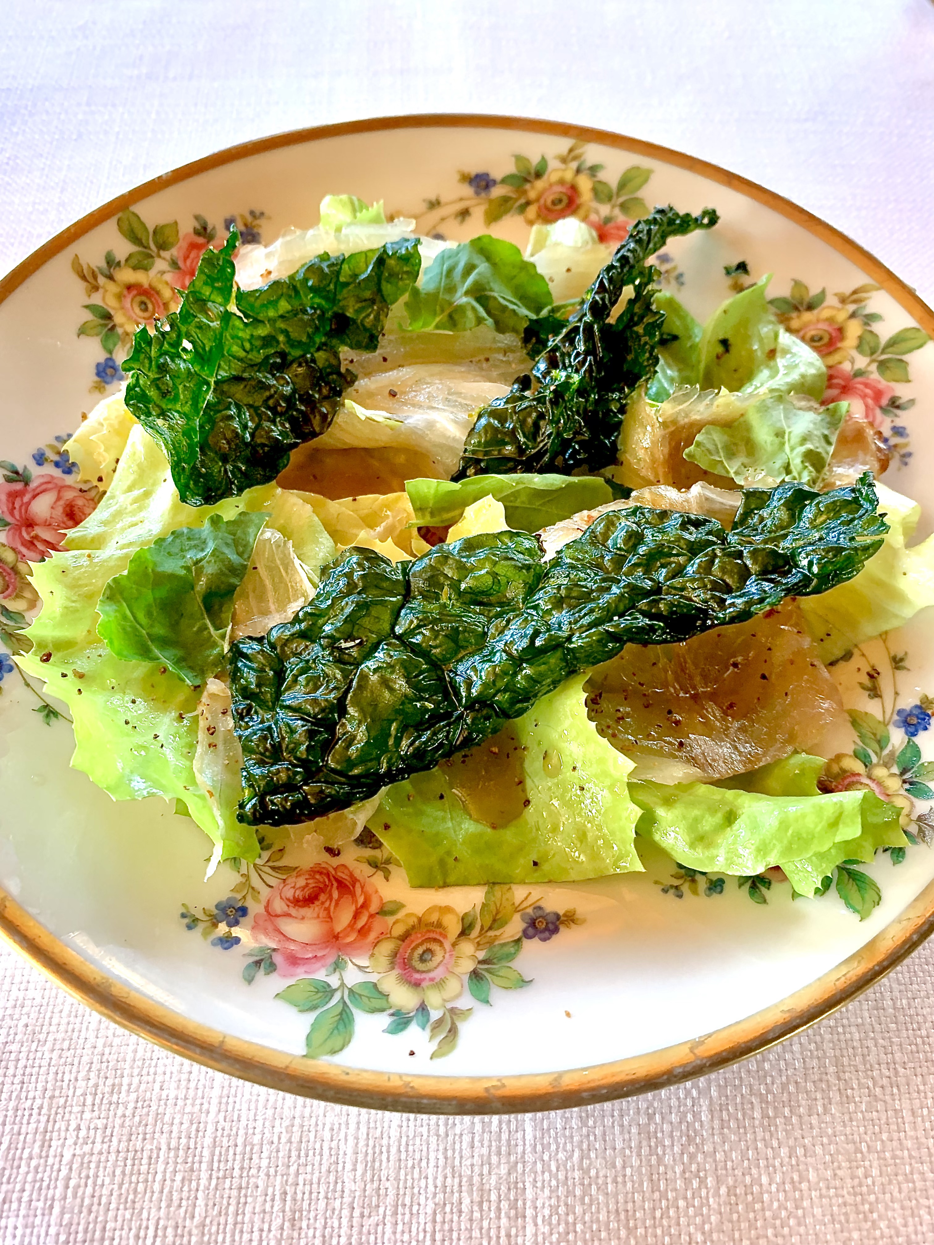 Seriole marinée au genièvre, salade de chou frit et vinaigrette au miel : la fine sériole est marinée, travaillée en gravlax, ce qui lui apporte une mâche intéressante, le genièvre lui donne du caractère et s’accorde parfaitement avec les feuilles de chou frites, telles des algues en croustille, la vinaigrette miel arrondit justement l’ensemble.