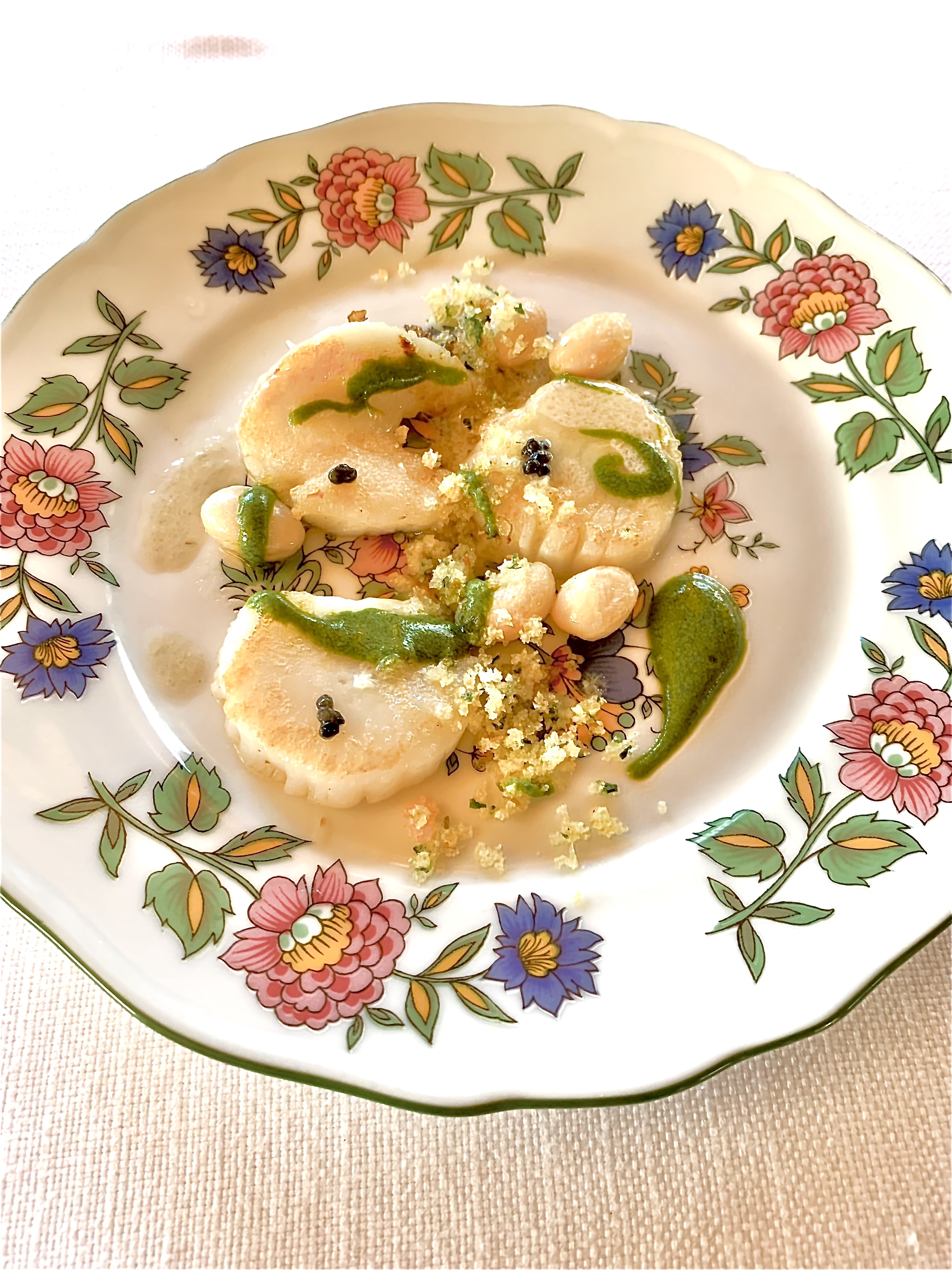 Saint-Jacques à la piémontaise, haricots de Pigna et caviar Oscietra : une interprétation couture de la traditionnelle salade à la piémontaise, les fines tranches de Saint-Jacques, juste snackées, remplacent la pomme de terre, les délicats haricots blancs de Pigna, au goût tendre de châtaigne, claquent en bouche et la vinaigrette en bagna-cauda apporte de la verve, renforcée par les fines croustilles de pain qui viennent titiller le palais en harmonie. Le caviar est peut-être en trop petite quantité pour qu’il puisse apporter toute son identité d’iode raffinée à l’assiette.