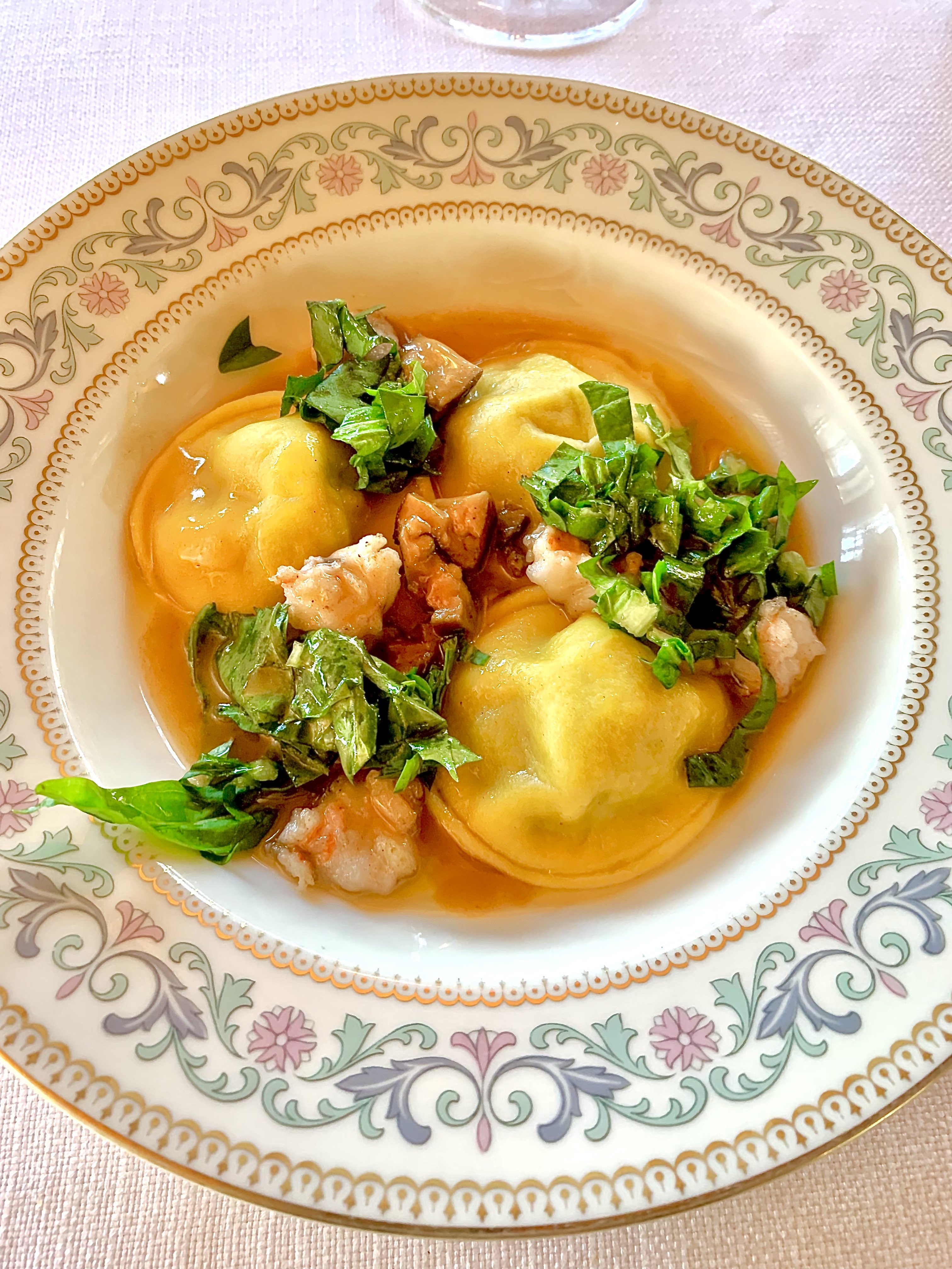 Tortelli de Puntarelle, langoustines et foie gras, une superbe association en subtil équilibre pour ces tortelli d’une pâte fine et mordante, entre l’amertume de la puntarelle (sorte de chicorée) et la saveur marine et très suave de la langoustine. Le foie gras vient engourmandiser avec ferveur, la pointe vinaigrée du bouillon lie le tout pour garder l’appétant pimpant. Une assiette addictive, qu’on aimerait sans fin.