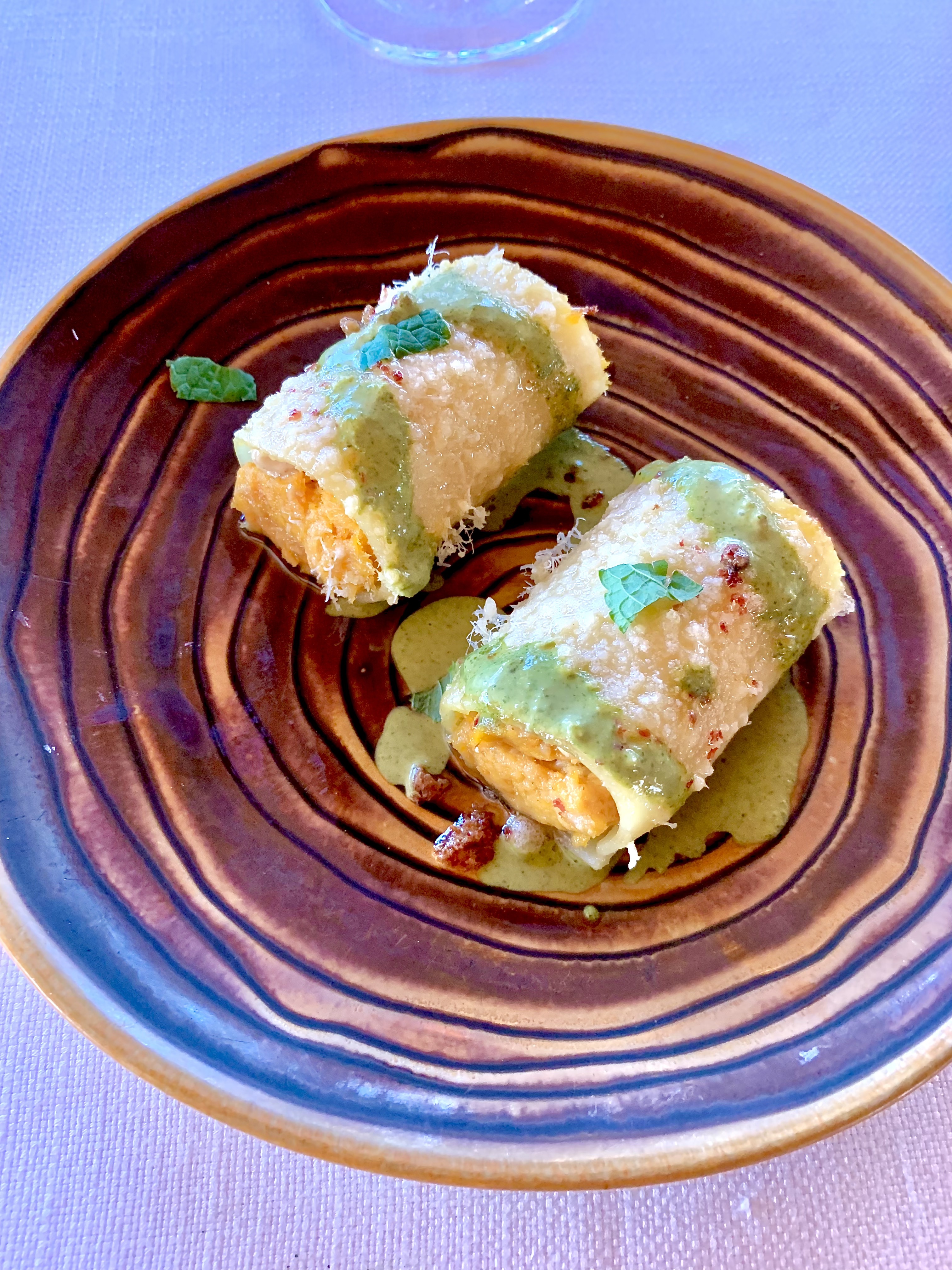 Paccheri farcis au lapin, poivre rose et beurre à la menthe : ces pâtes en forme de tubes ou de petits paquets, d’une cuisson al-dente « perfection », sont farcis du lapin rehaussé de la fraîcheur de la menthe et pulsé de poivre rose, elles se dégustent en délice et donnent ce petit réconfort, si agréable, des jours frileux. La farce est non sans rappeler les saveurs onctueuses d’un vitello tonnato, et le parmesan signe le tout en bienséance.