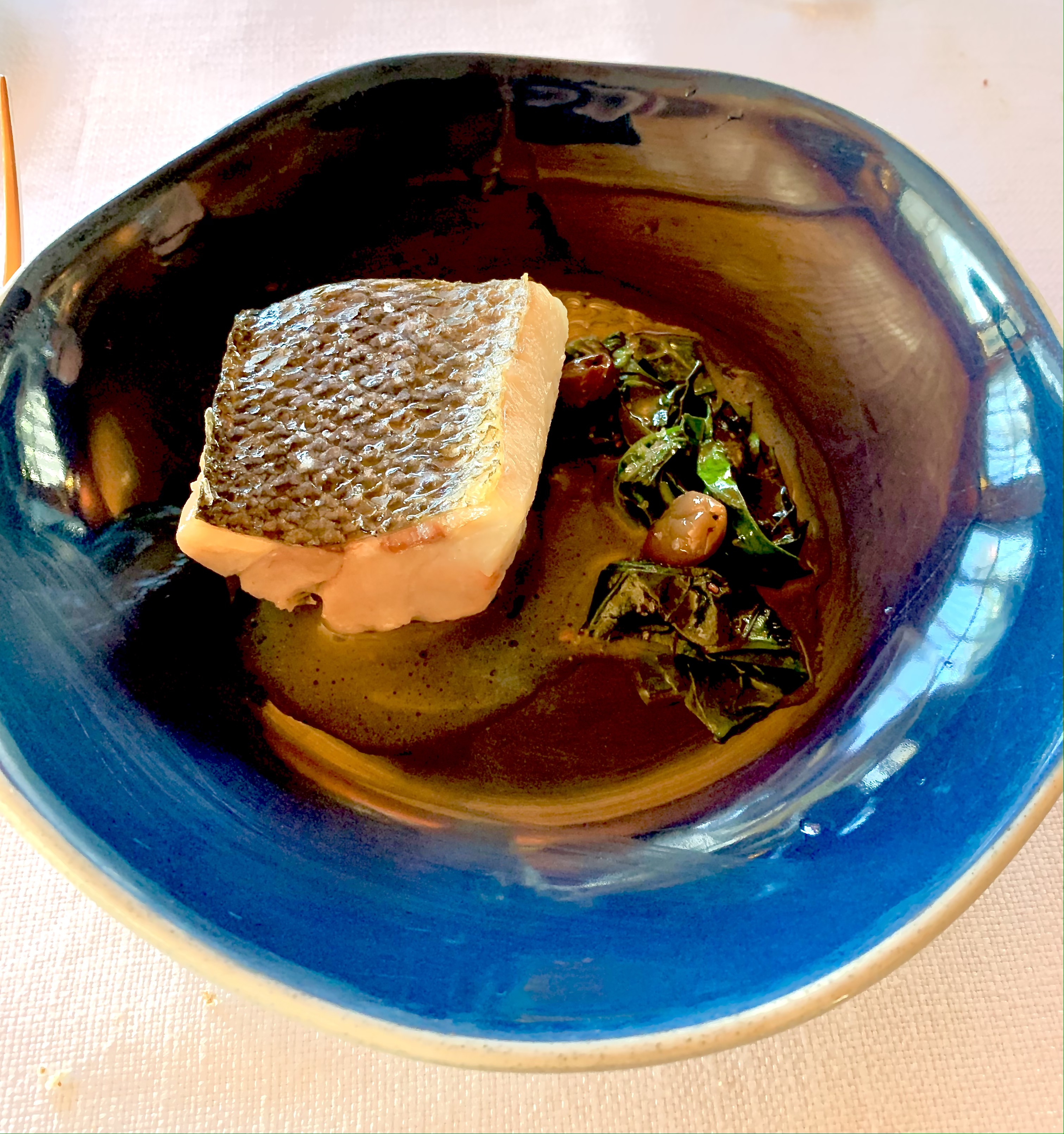 Loup sauvage en sauce au vin blanc et olives de Taggia, la belle tranche de loup d’une cuisson à l’ancienne, délivre sa chair sauvage, les petites olives taggiasca, cultivées non loin de là, apportent toute leur subtilité et force à la sauce vin tel un beurre blanc, la tombée de blettes locales est le lien terre-mer.