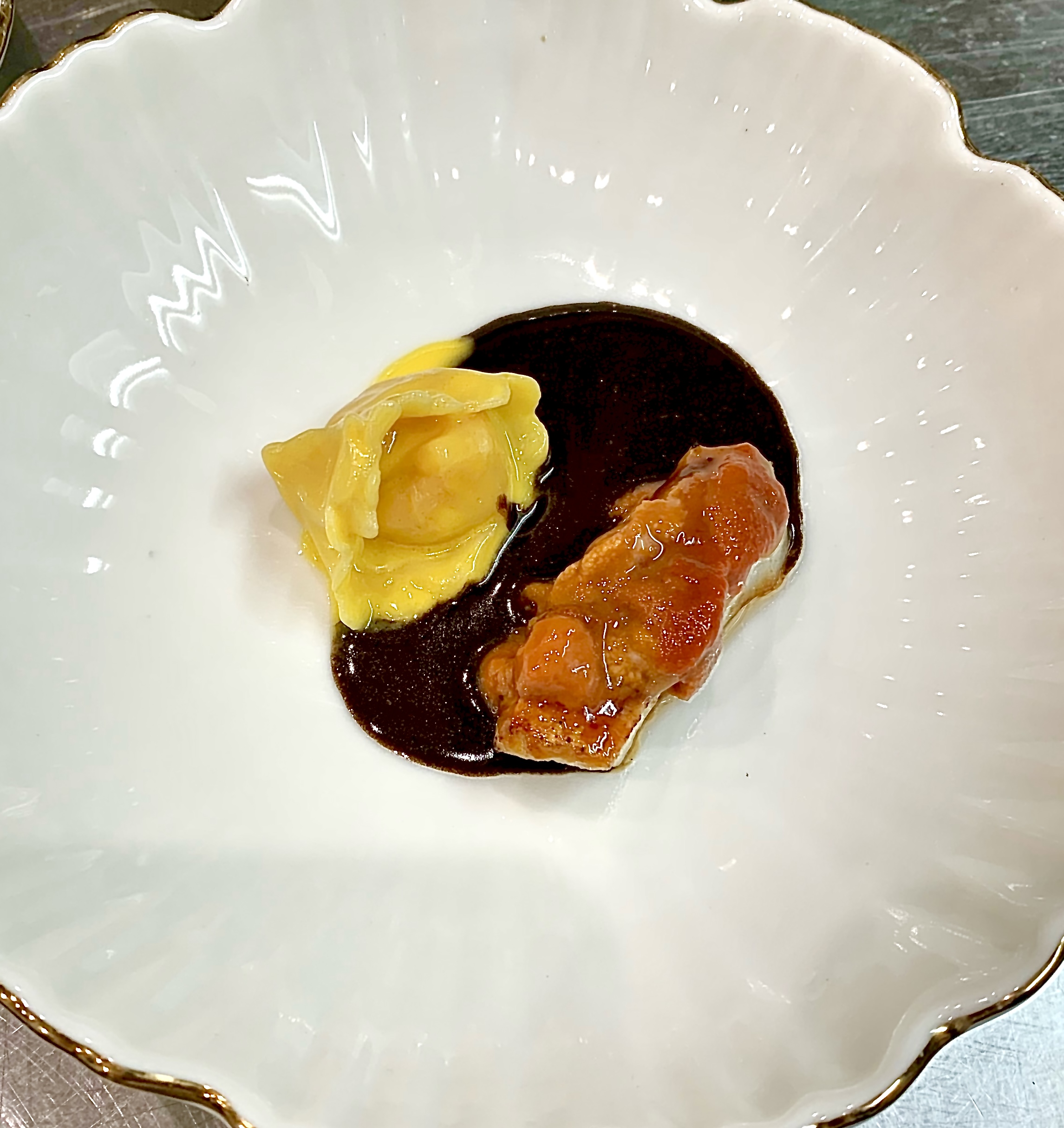 Le rouget coiffé d’iode de l’oursin s’encanaille avec évidence d’une sauce lièvre à la royale, le tortellini au potimarron est un bonbon de volupté.