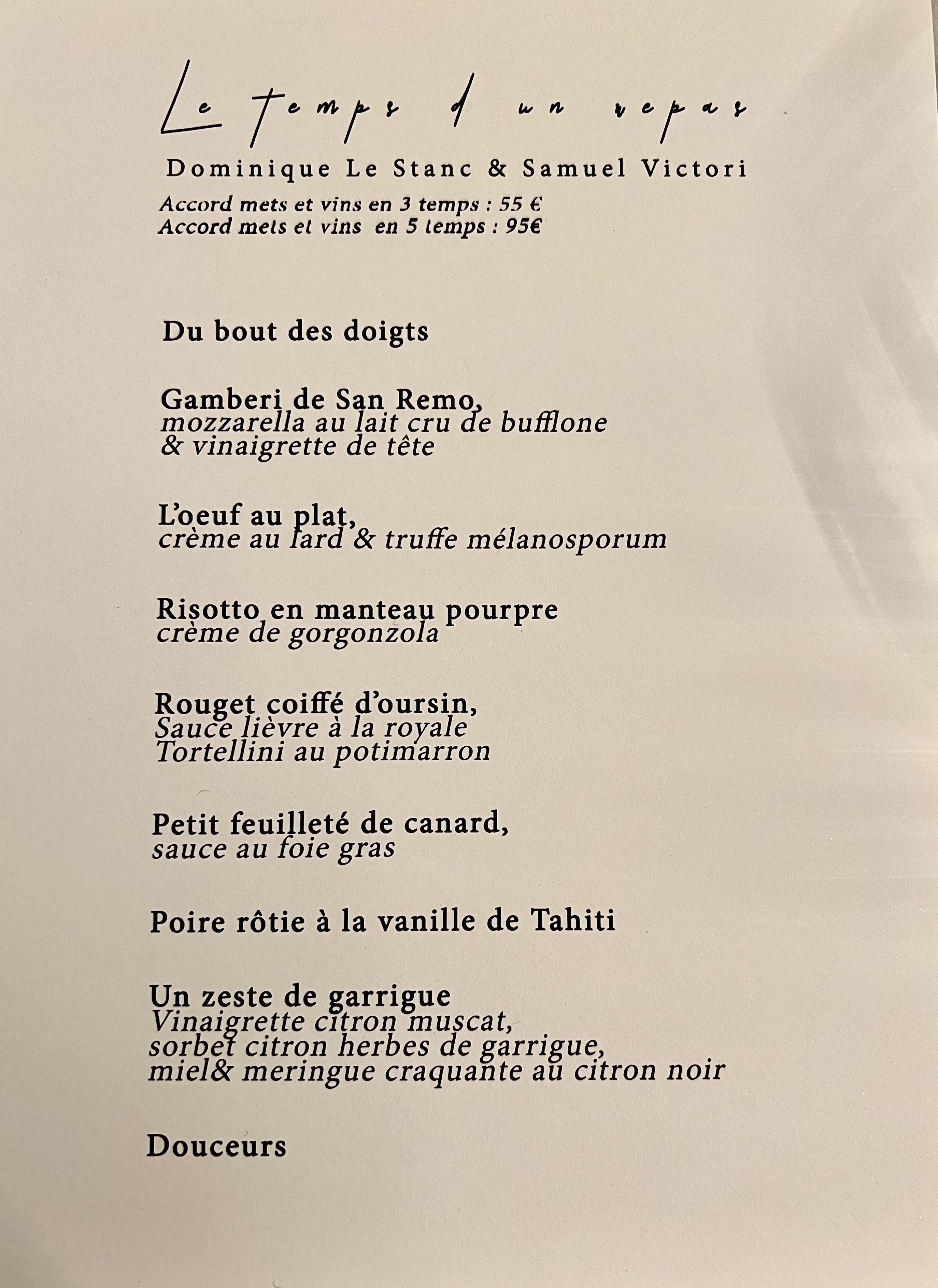 Les deux entités de la gastronomie niçoise, les chefs Samuel Victori et Dominique Le Stanc se sont retrouvés avec sincérité dans ce menu tamisé et gourmand dans une belle association de styles en douce harmonie.