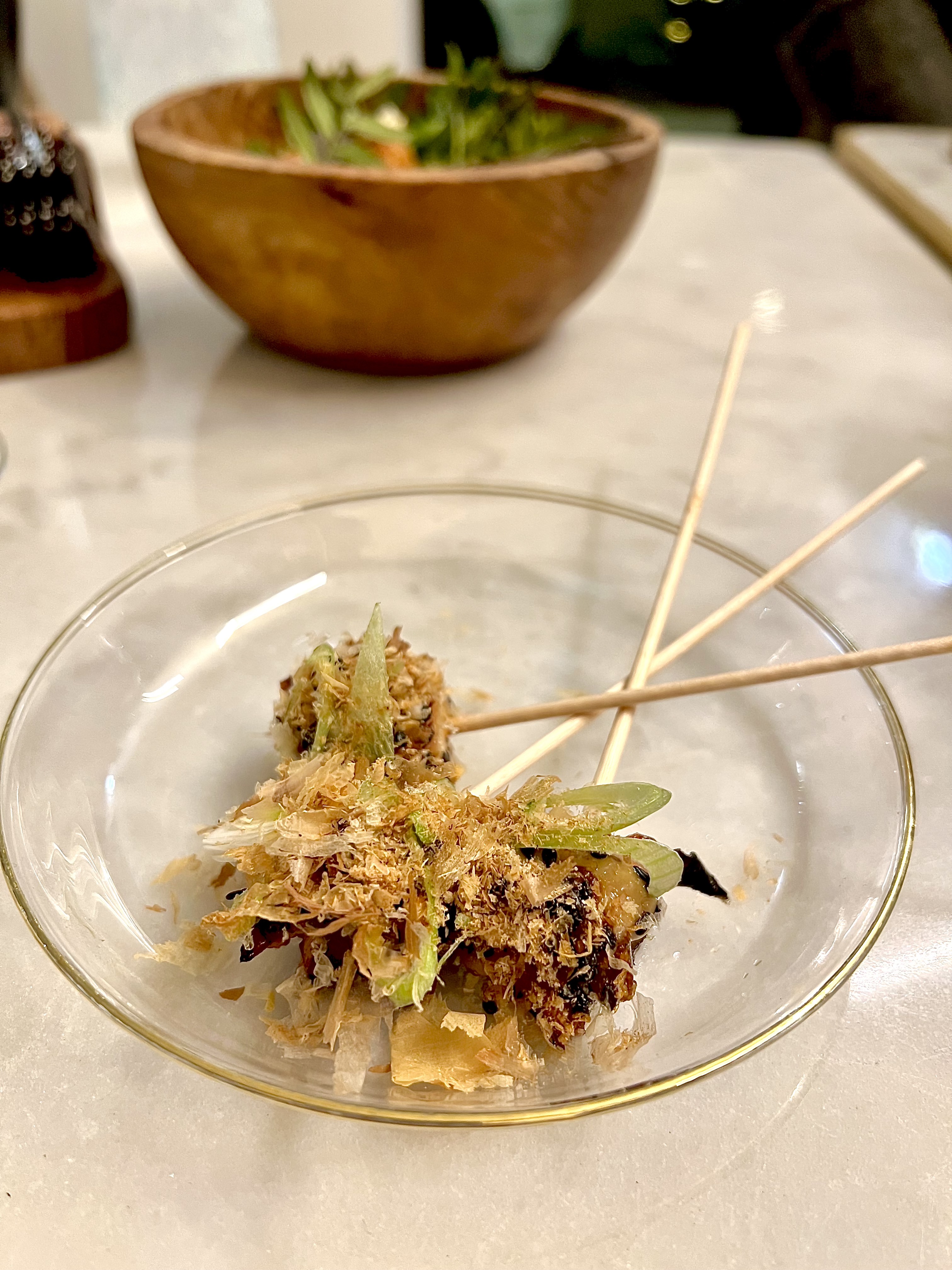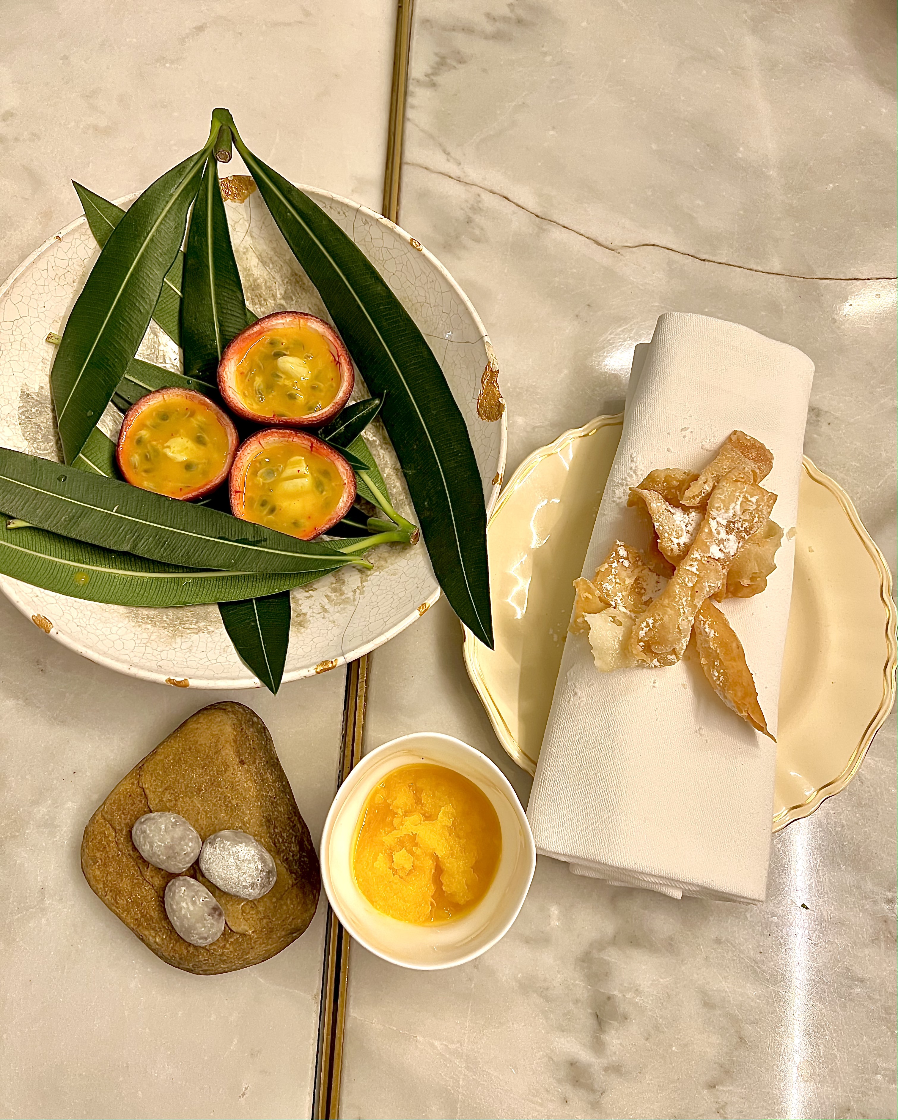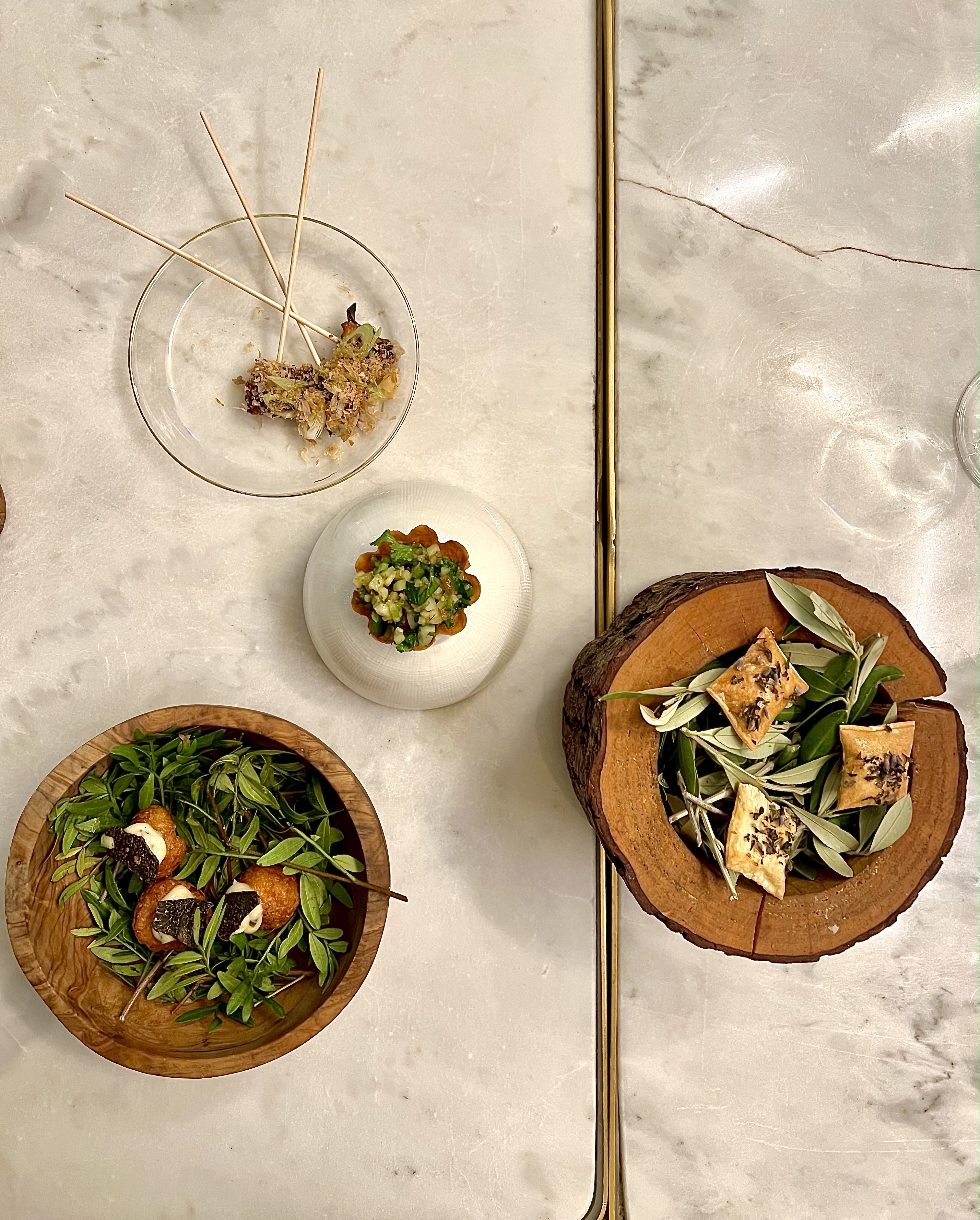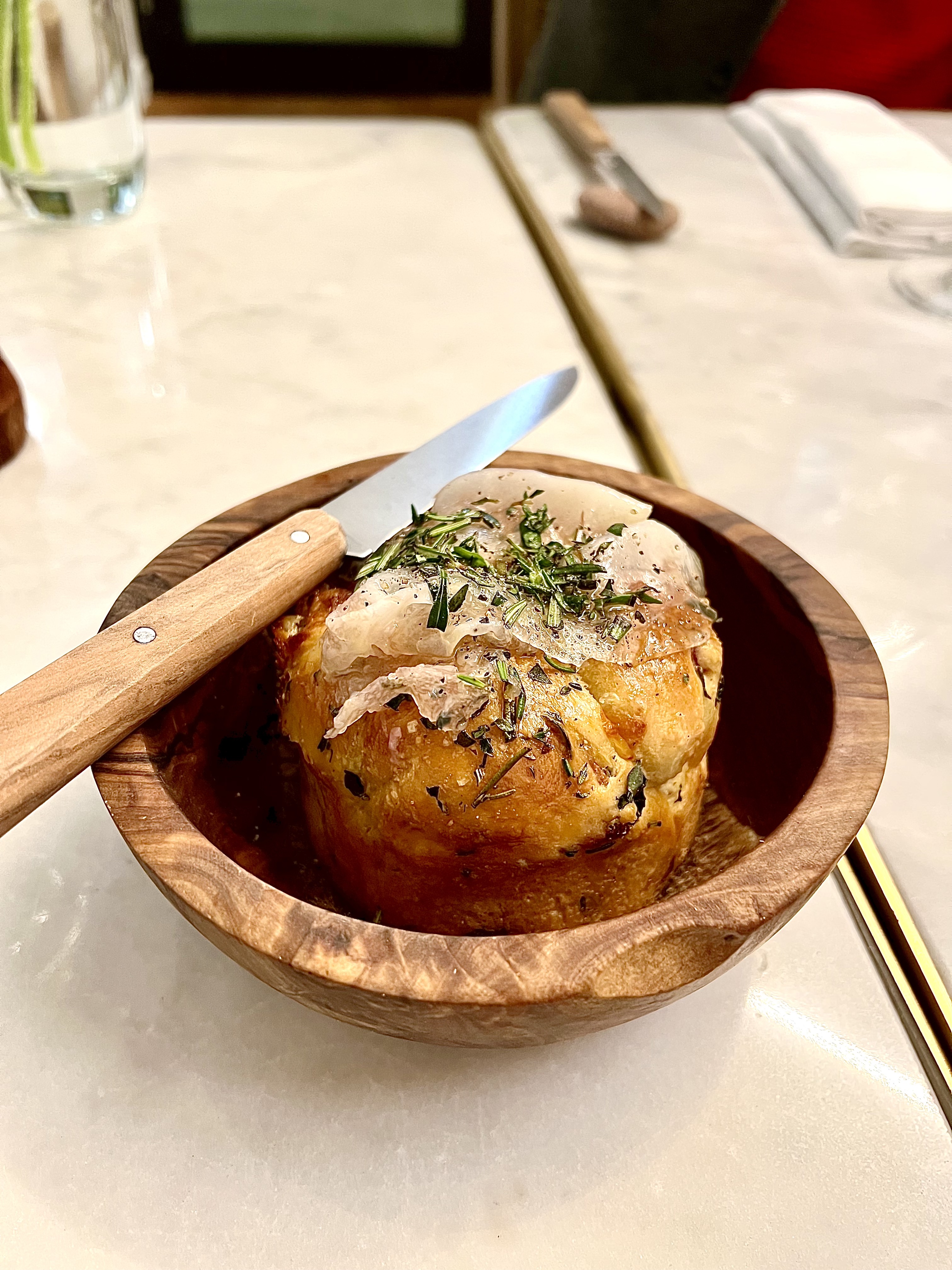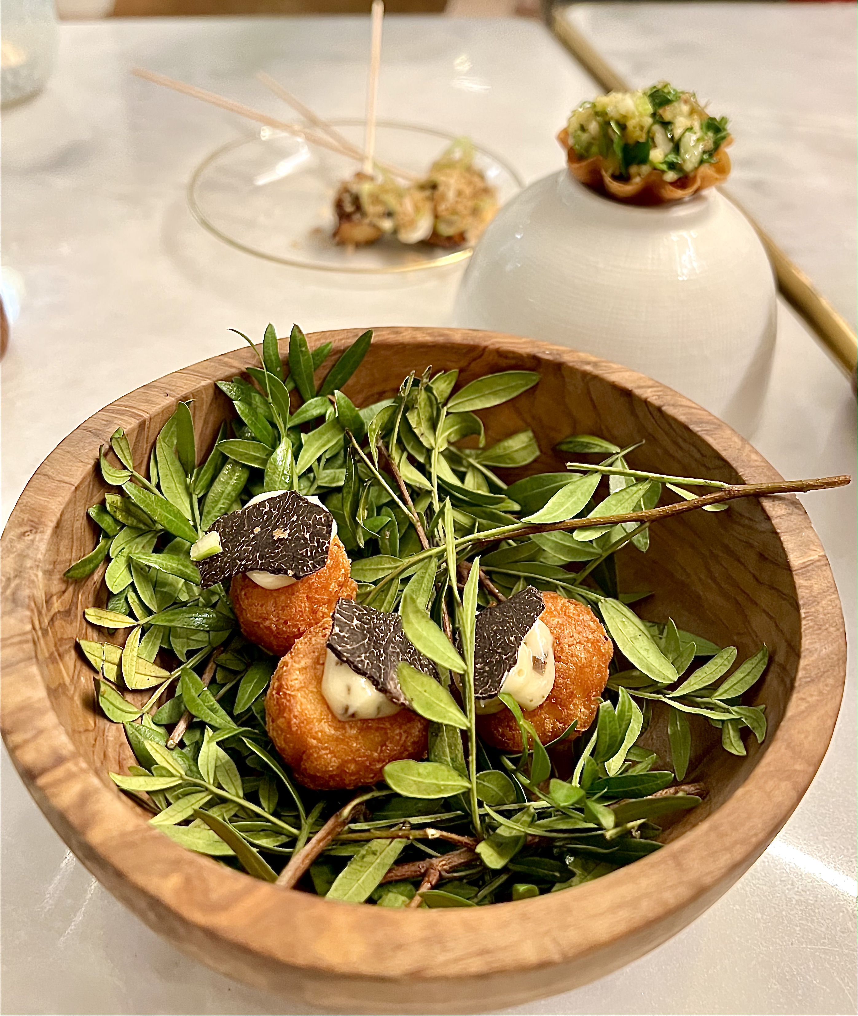 Tout a commencé avec une brioche à partager délicieuse à se damner aux limbes des plaisirs gourmands, servie tiède, elle fait fondre de bonheur la fine tranche de guanciale, qui libère toute son identité. Les herbes de la garrigue rehaussent le tout d’un chant des cigales. Les très raffinés cocktails de saison sont une parfaite harmonie des amuses bouches, comme le Beetroot fizz (Gin 44, jus de betterave , eau de rose , tonic, fleur de sureau), tout se déguste en une bouchée ravie et comblée : les pimpantes petites pommes dauphine à la truffe, les brochettes de poulpe à la saveur et texture moelleuse d’un Takoyaki, les petits coussins croustillants chèvre, miel et lavande et la Saint-Jacques dans son état pur, navet et truffe…
