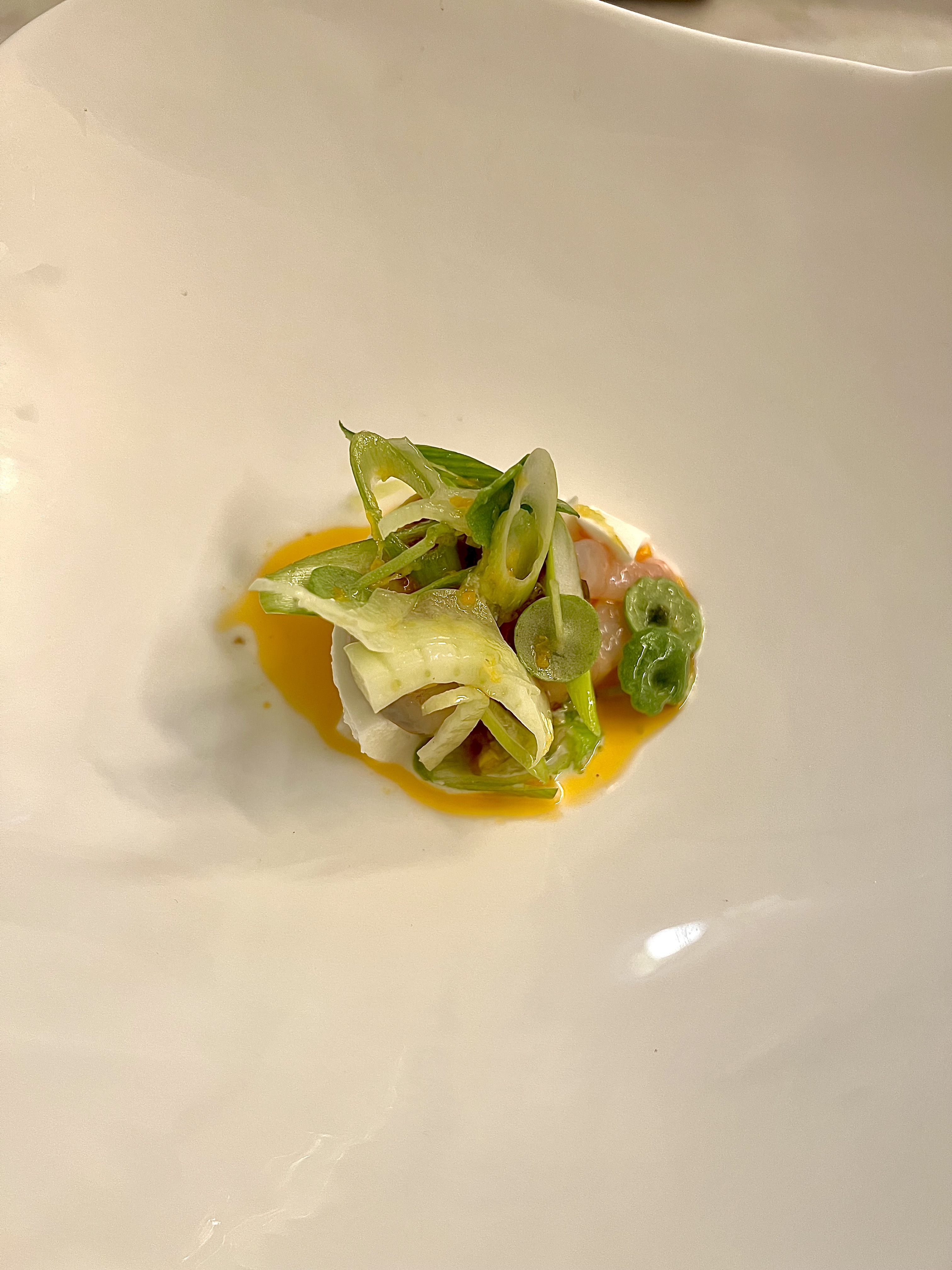 C’est Samuel qui a lancé le premier temps des dégustations avec la Gamberi de San Remo en filigrane d’iode enveloppée de la douceur laiteuse de la mozzarella, la vinaigrette de têtes de crevettes se fait condiment concentré et balance la croque fraîche de la cébette et fenouil.