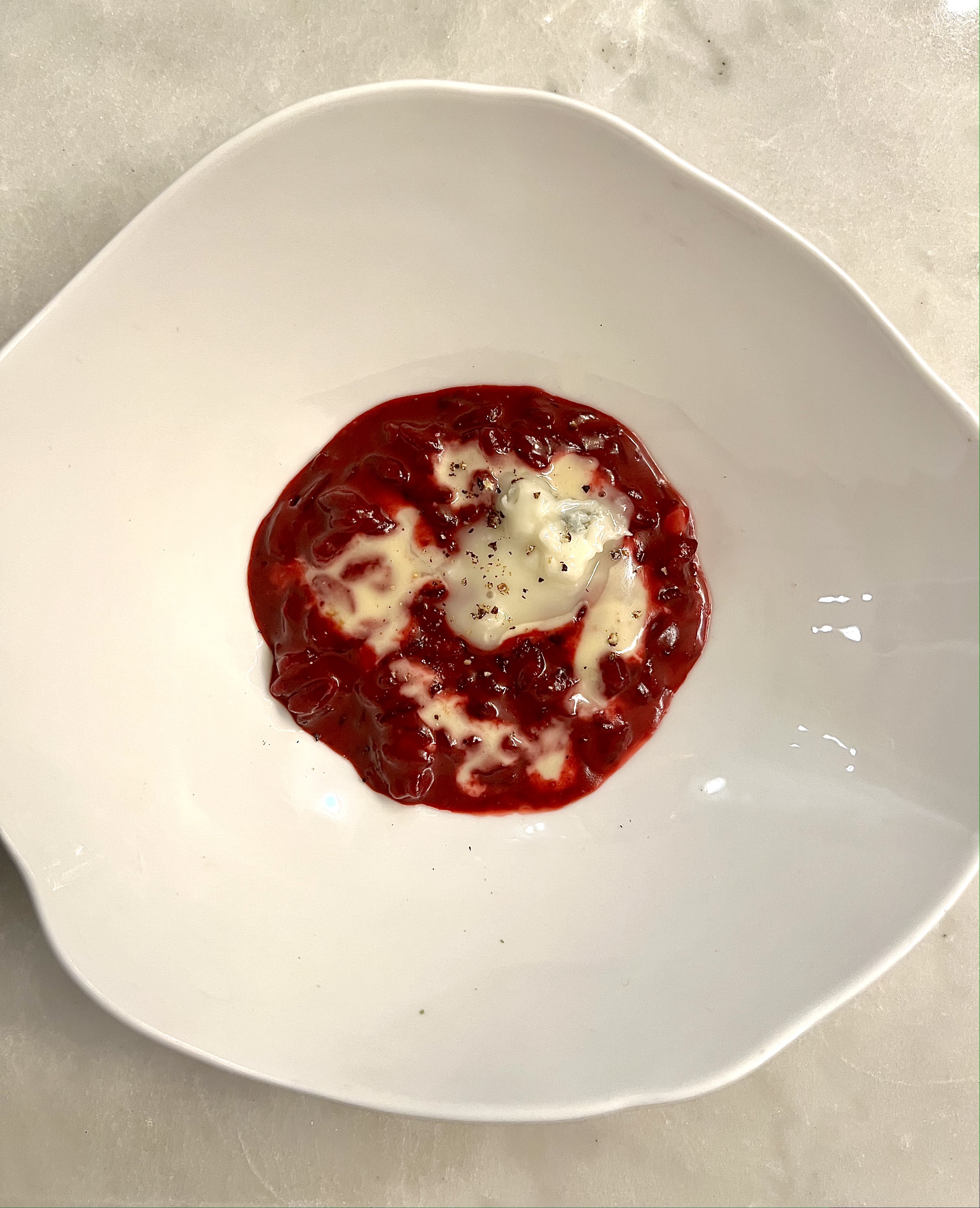 Pour le second temps, Samuel nous emmène délicatement avec un risotto enveloppé de betterave et engourmandisé de gorgonzola.