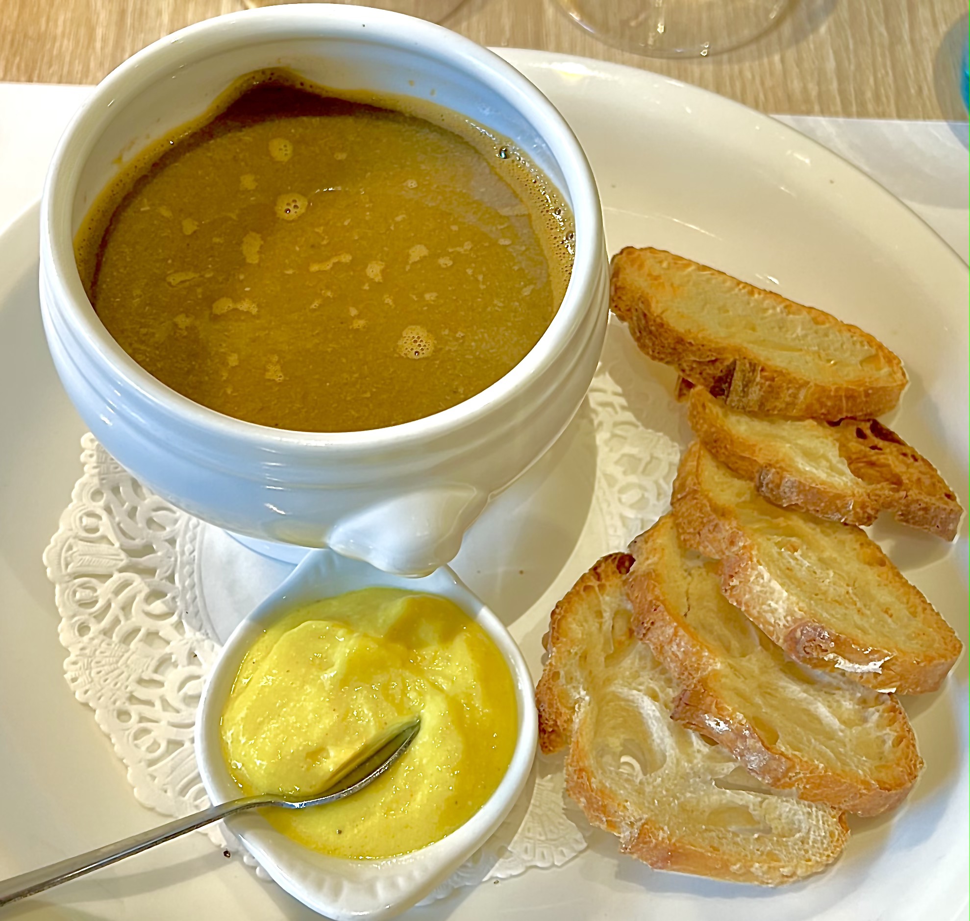 Pour suivre, la Cotriade Vue sur St Malo est une marmite du pêcheur d’un retour des campagnes de pêche, comme une idée de bouillabaisse, on y retrouve différents poissons, des moules et crevettes et des pommes de terre marquées.