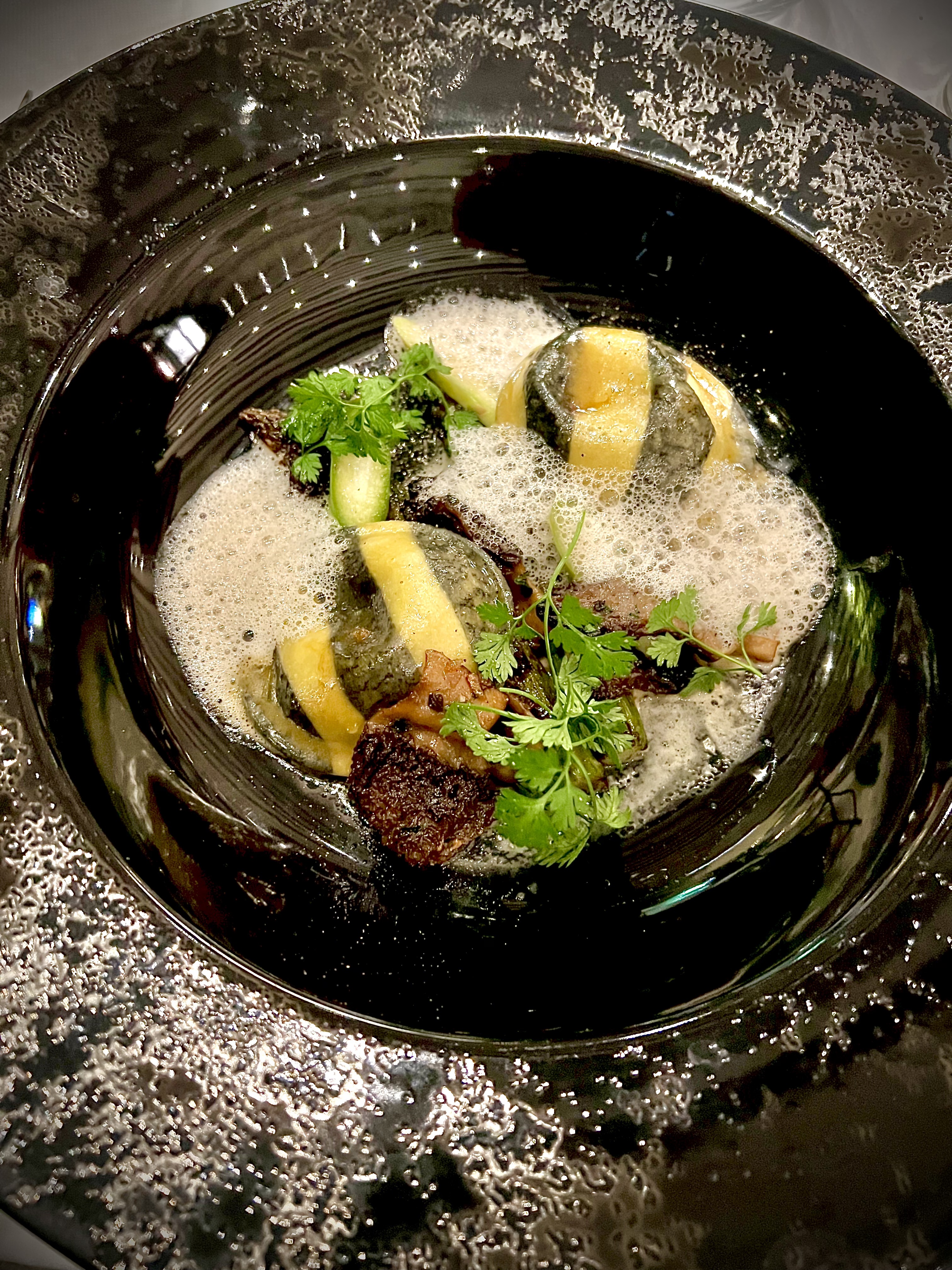 Pour suivre, les Ravioles au foie gras, morilles et asperges, espuma de champignons vous font entrer dans le monde de la gourmandise et du réconfort des papilles. Ces raviolis, à la délicate pâte, sont gorgés de sensualité du foie gras qui explose en bouche, les morilles délivrent leurs chaleureuses saveurs enivrantes et les asperges crues et rôties apportent la double texture qui cadence l’assiette.