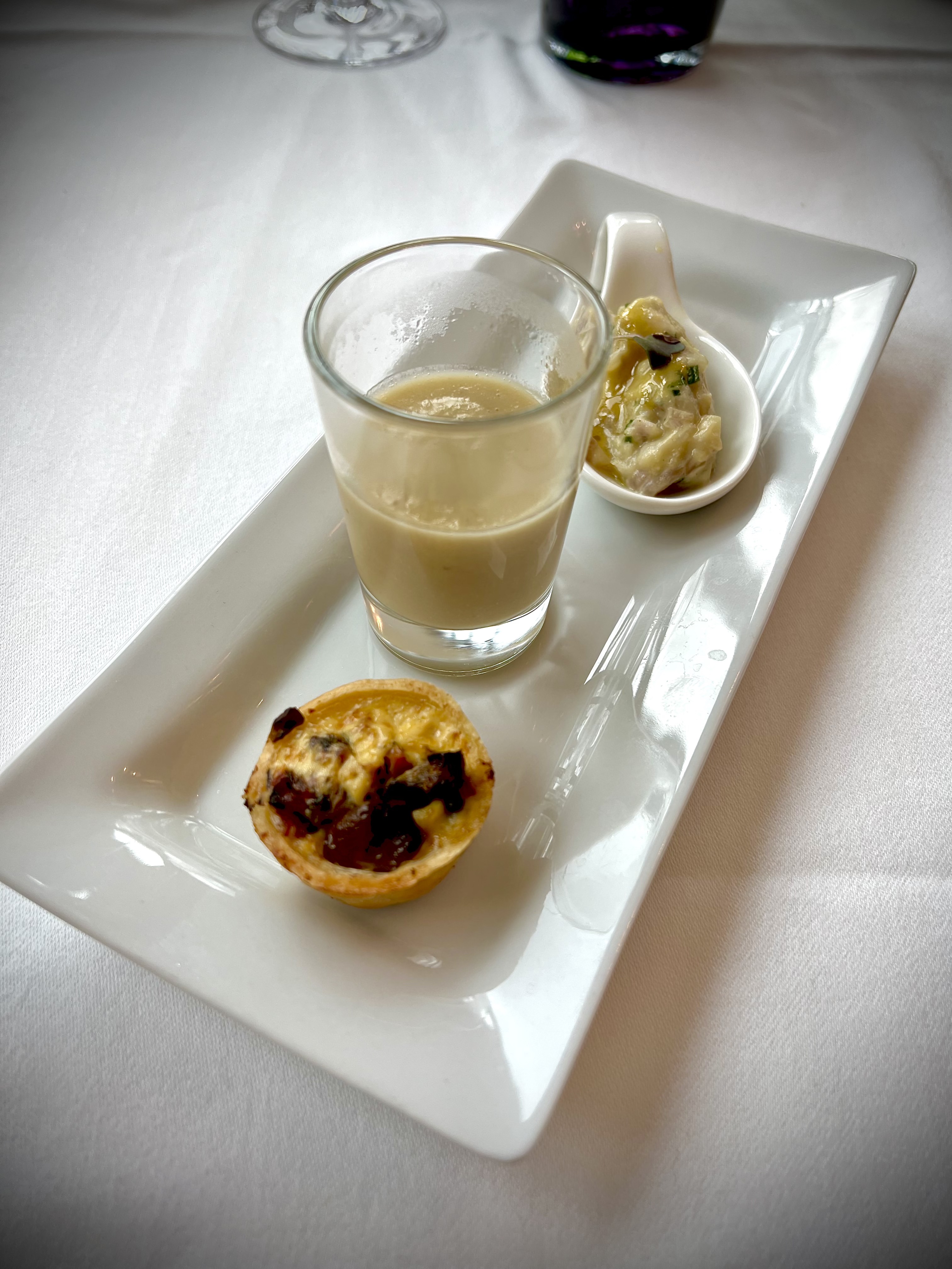 En amuse-bouche, le velouté de céleri au lard est gourmand et se fait réconfortant, la tartelette de saison enivre de ses saveurs provençales, le tartare de loup, vinaigrette agrumes a la belle fraîcheur des herbes aromatiques, relevé du gingembre et des différents agrumes.