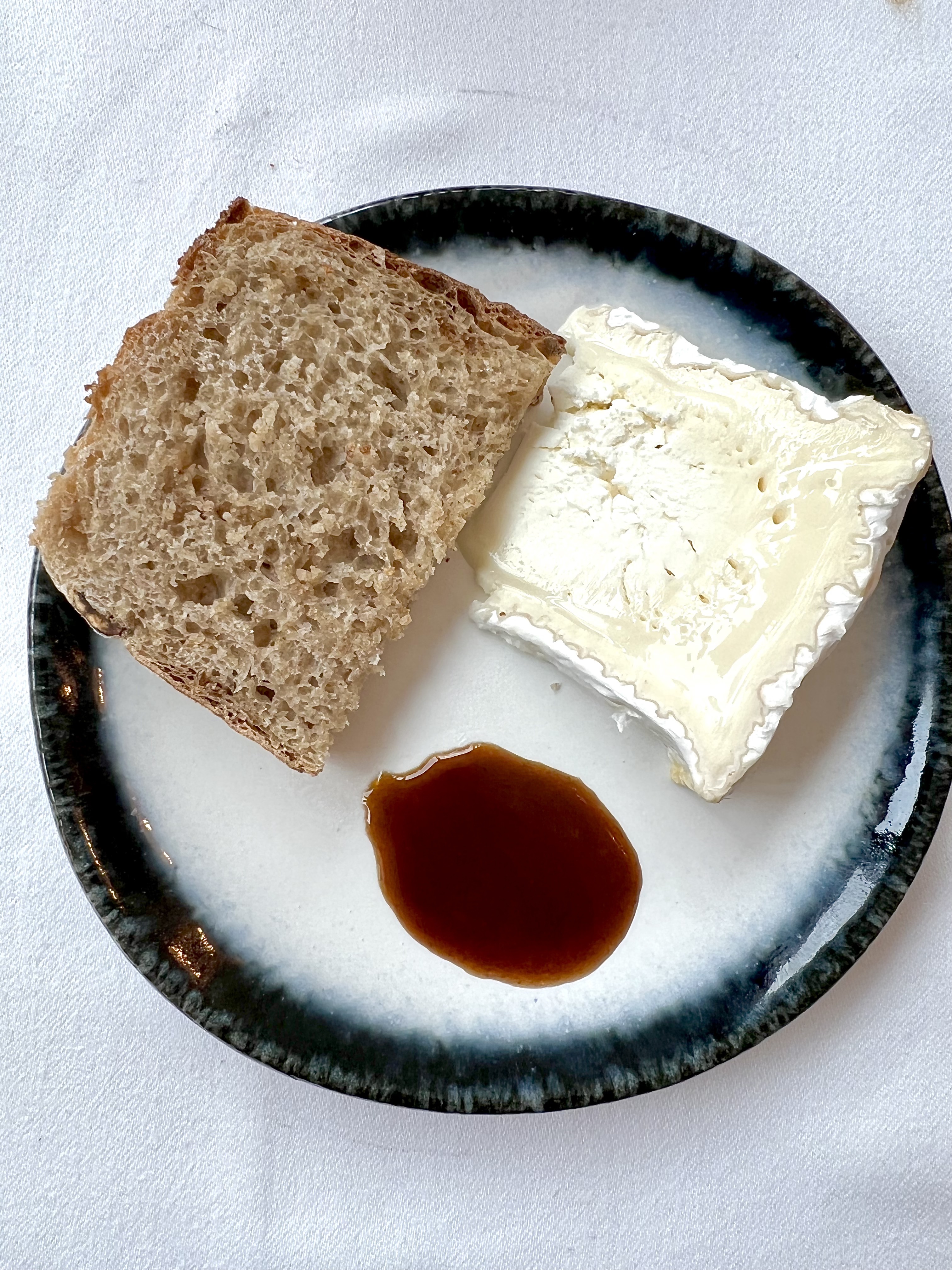Pour le fromage, le chef conseille d’associer le Brillat-Savarin de chez Thomas Métin avec le jus de viande, accompagné du pain maison (noisette-pralin) fabriqué avec un levain de trois ans : c’est étonnant, intense et merveilleusement bon.