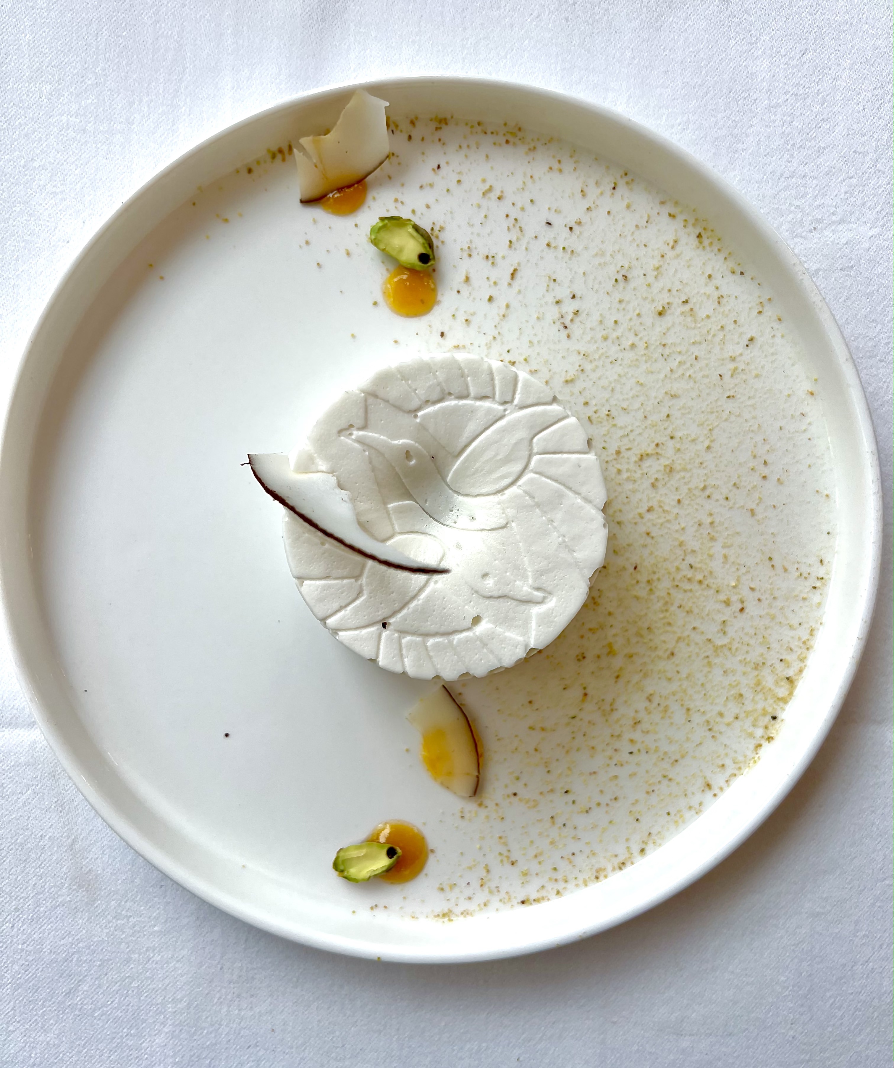 La Pavlova au fenouil et pomme verte est une revisite délicate et pertinente, le fenouil apporte une harmonieuse fraîcheur anisée qui s’équilibre justement avec la vivacité de la pomme verte, la meringue est légère et craquante. La Mousse exotique en dacquoise pistache/noix de coco se déguste passionnément et termine le repas avec envergure.