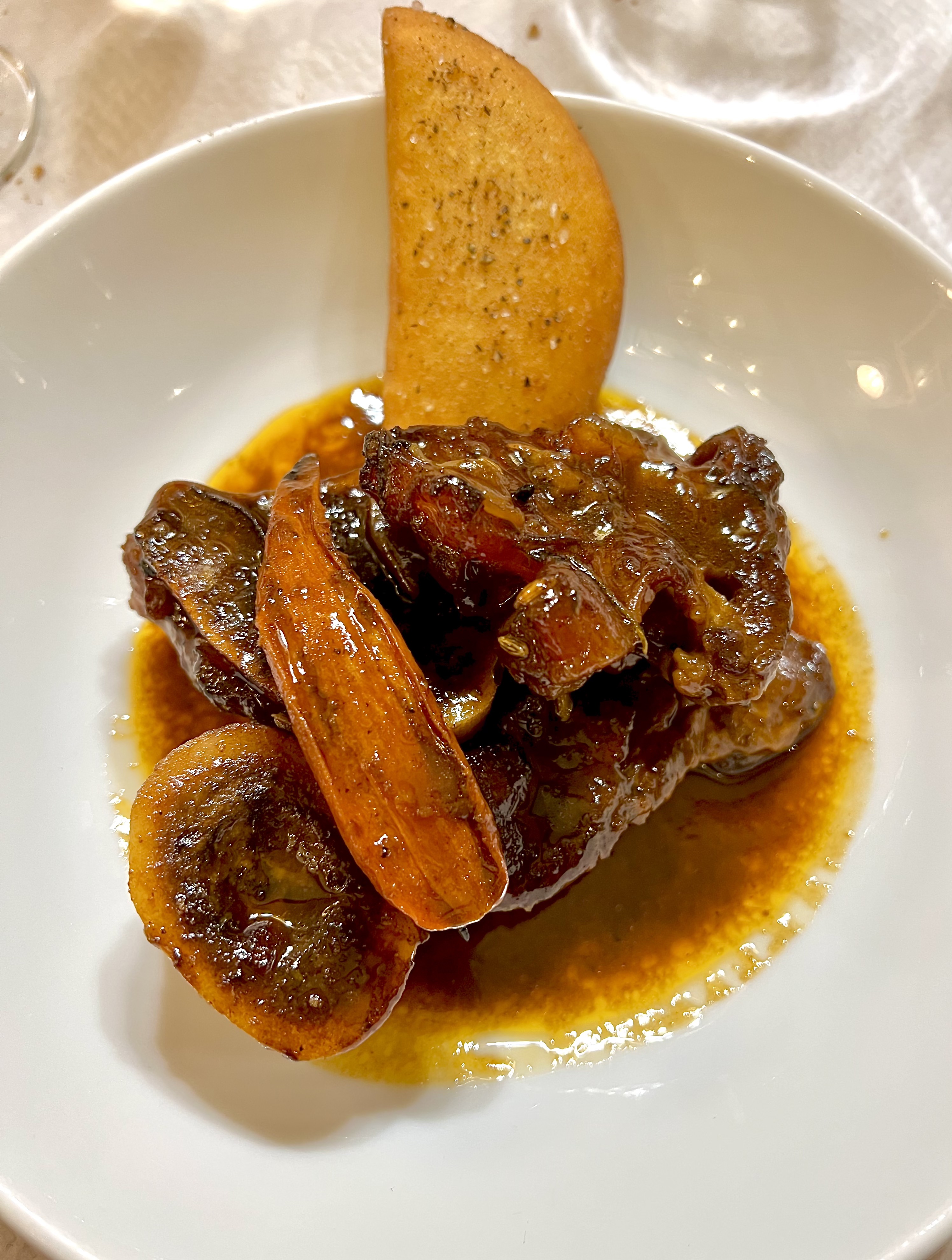 L’Osso Bucco à la piémontaise se dévore sans contrainte, tel un plat de partage en perfection, la sauce en belle réduction est intense de ses sucs, la frite de panisse fait toujours autant plaisir pour le geste gourmand de « saucer ».